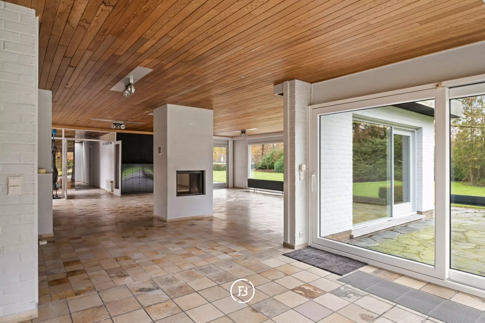 Bright entrance hall inviting into a very spacious living room with central fireplace, large (living) kitchen, storage room, 4 bedrooms, bathroom, and double indoor garage.