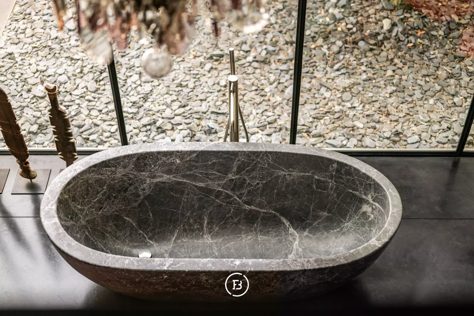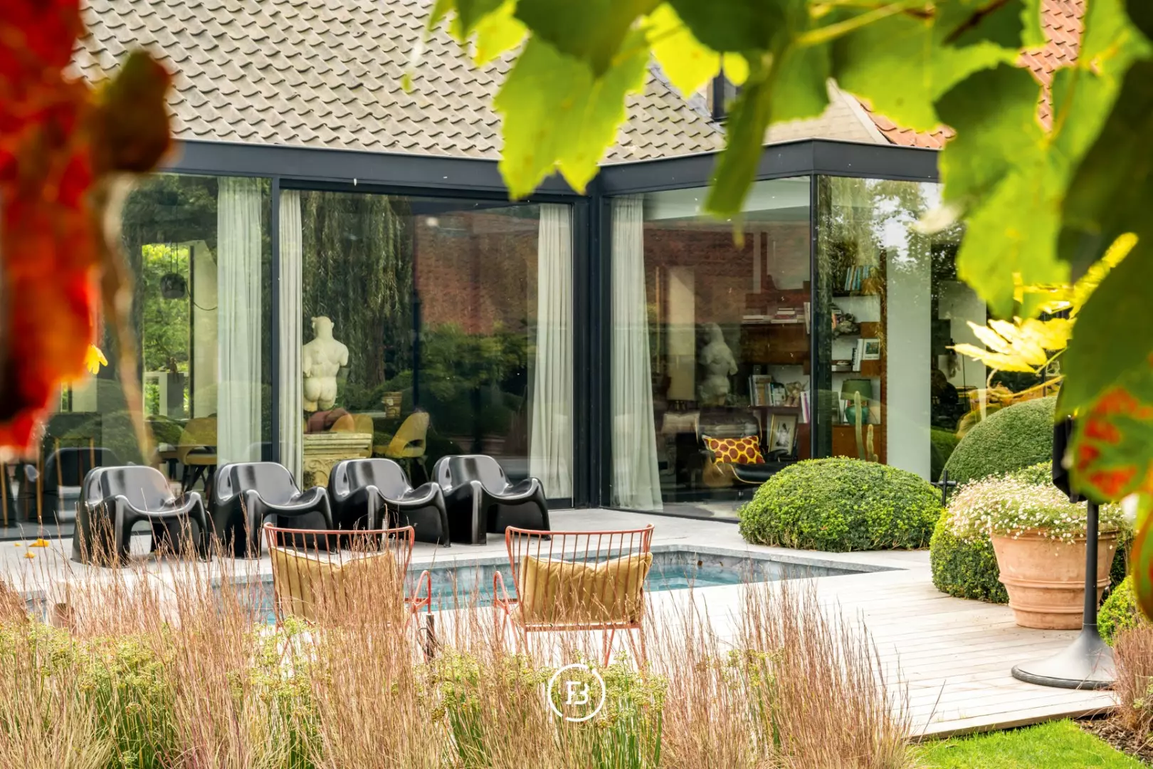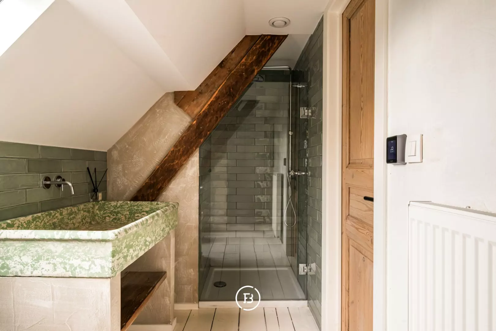 The bright living area offers panoramic views of the garden and includes a lounge with fireplace, reading corner, dining area with fireplace, and a fully equipped kitchen. On the ground floor, you’ll also find the master bedroom (currently used as a TV room), a shower room, and a luxurious bathroom with bathtub and view of an inner courtyard. A mezzanine can serve as an office or additional bedroom. Upstairs, there are two bedrooms, a shower room, and a laundry area.