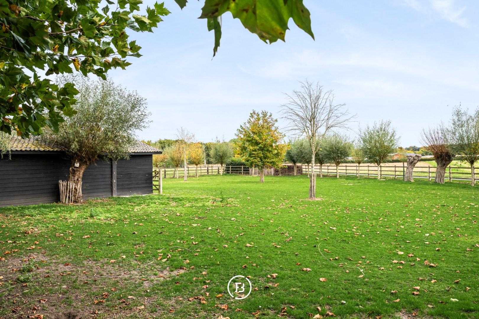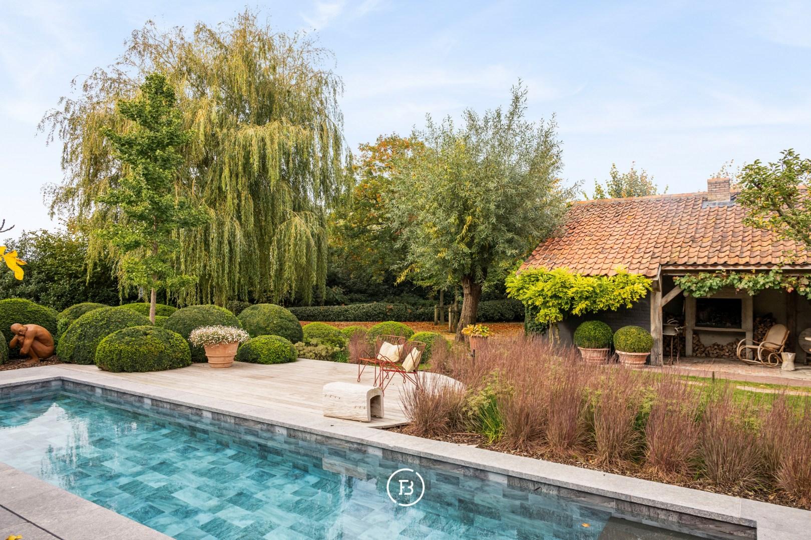 Outdoor living is a delight: the beautiful swimming pool with its large terrace adjoining the living area, and the covered terrace of the outbuilding—ideal as a pool house—turn every summer evening into a memorable experience. The beautifully landscaped garden with boxwood borders and mature trees features an irrigation system, ensuring a permanently green oasis and an instant holiday feeling. The fenced meadows with stables are perfect for animal lovers. A double carport completes the property.