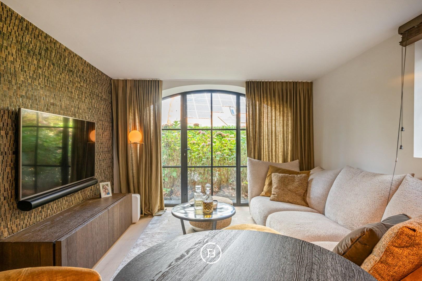 The house welcomes you with a spacious entrance hall, characterized by high ceilings and a beautiful beam structure that immediately reveals the charm of the house. Here you will find a guest toilet and a cloakroom. The adjoining living spaces form a harmonious whole: a spacious living room, dining area, and an open, high-end fitted kitchen overlooking the garden. There is also a separate second living/TV room that is perfect for a cozy relaxation area. A practical utility room/laundry room with direct access to the garden completes the ground floor.