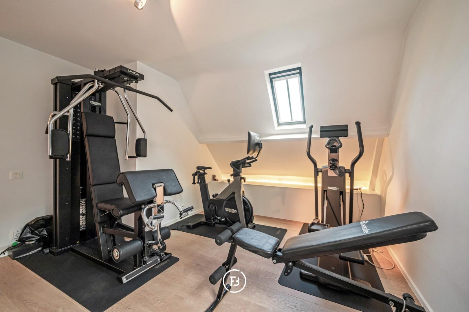 This floor houses four spacious bedrooms, one of which is currently set up as a fitness room. There is also a large storage room and a comfortable bathroom equipped with a double sink, bath, and shower. A separate toilet is located in the hallway.