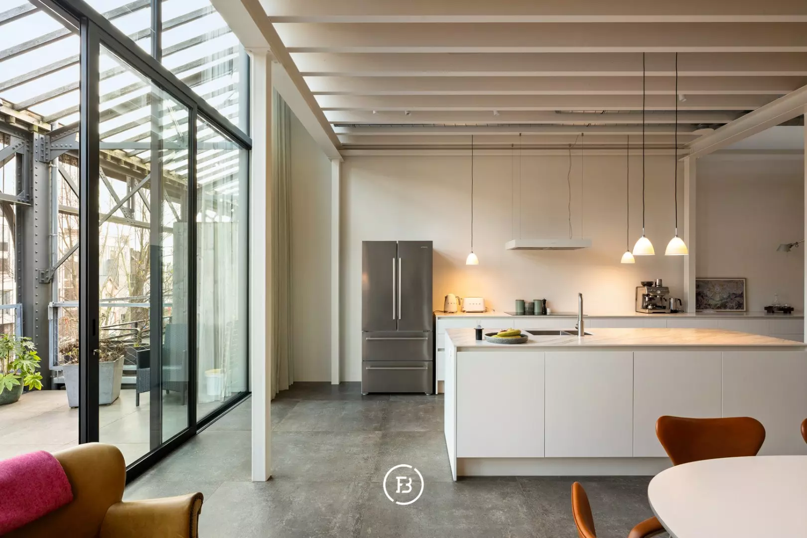 The loft features a generous living area of 217 m² and a sunny terrace of 24 m². A basement storage is included and there is the possibility to purchase a private parking space.