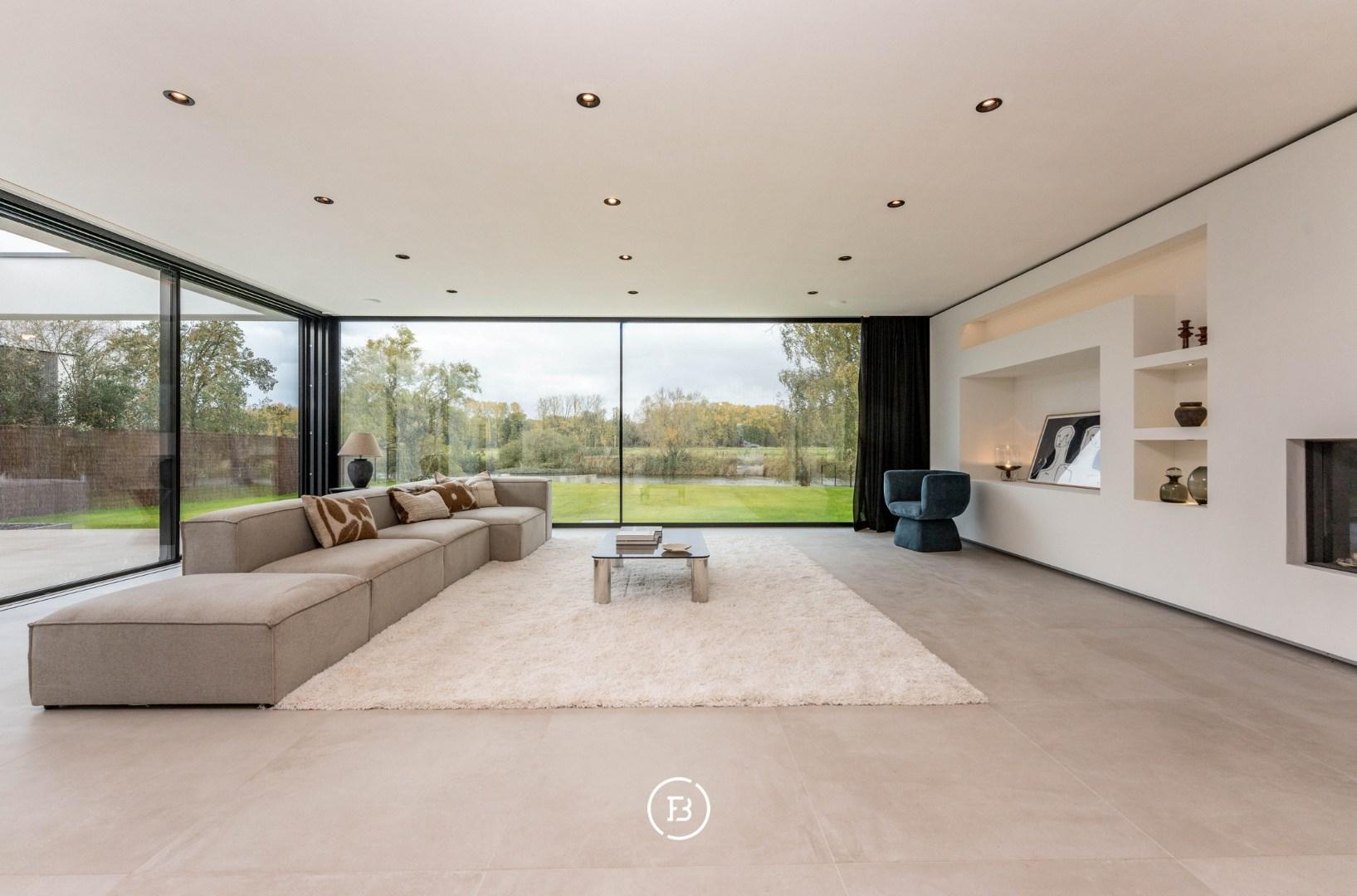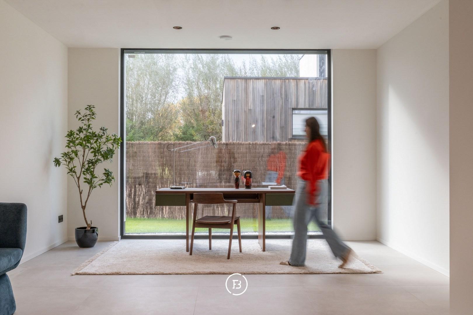 Upon entering, on the left side, there is a spacious office space or practice room, ideal for combining living and working. On the other side, there is a generous guest toilet. The large living area has a cozy seating area and plenty of light thanks to the high windows, which provide a beautiful connection with the outside all year round. The kitchen is centrally located and open and practical, focused on togetherness. From the living area, the terraces seamlessly flow into the garden, making the outside just as pleasant as the inside.