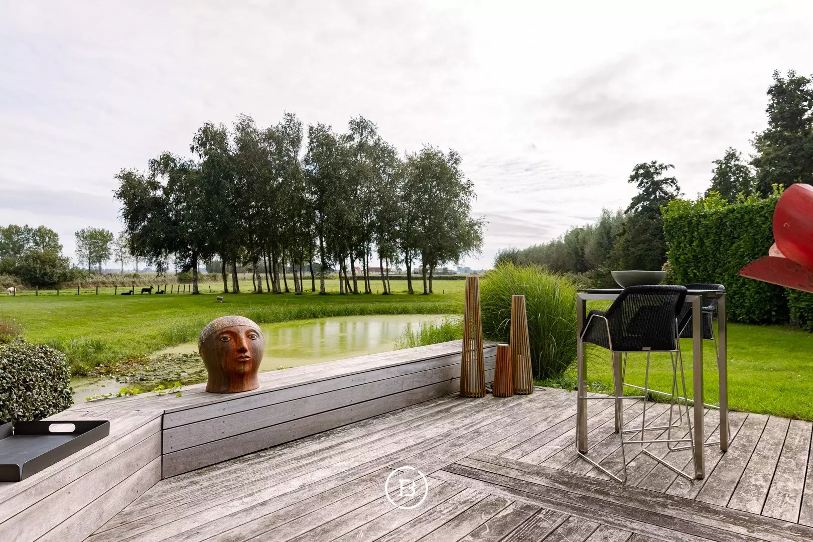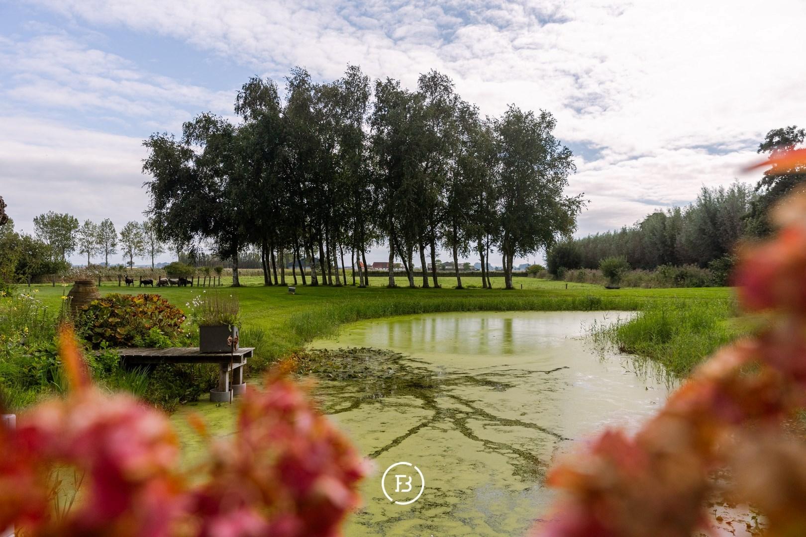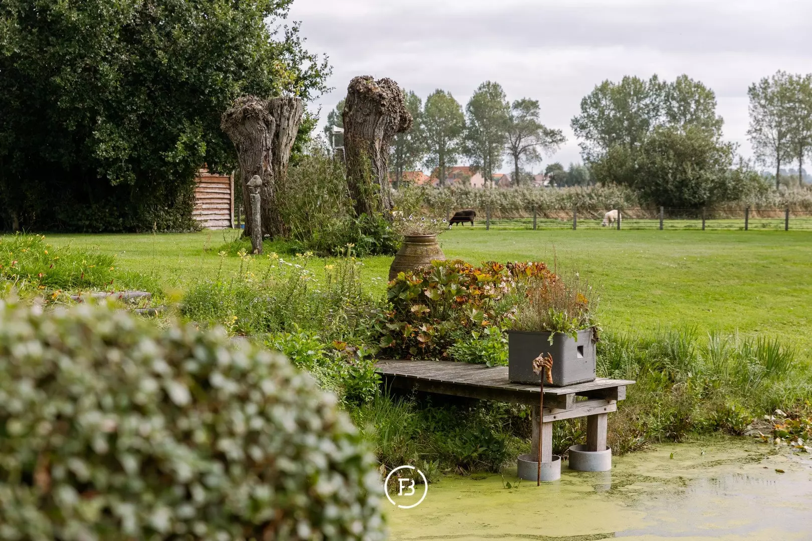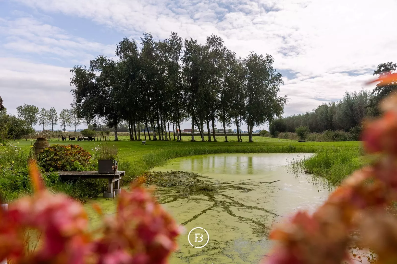 The garden not only offers stunning views of the surrounding meadows but also features a cozy terrace with a pond. Additionally, there is a large garage with space for several cars, a workspace, and storage for gardening tools. For those needing more land, the adjacent meadow of 8,400 m² is available for purchase.