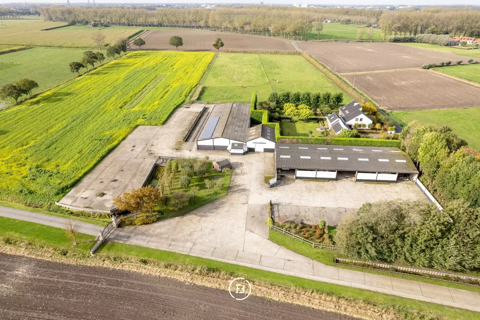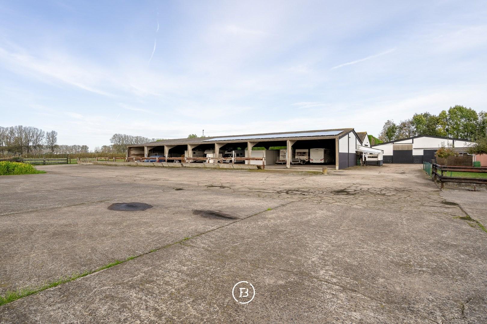 Close to the Damme Canal, between the charming village of Damme and historic Bruges, this exceptional property offers a seamless combination of living space, opportunities, and versatility. The villa with two large warehouses is offered on a generous plot of nearly 2.5 hectares, with the option to acquire an additional 2.7 hectares of agricultural land.
