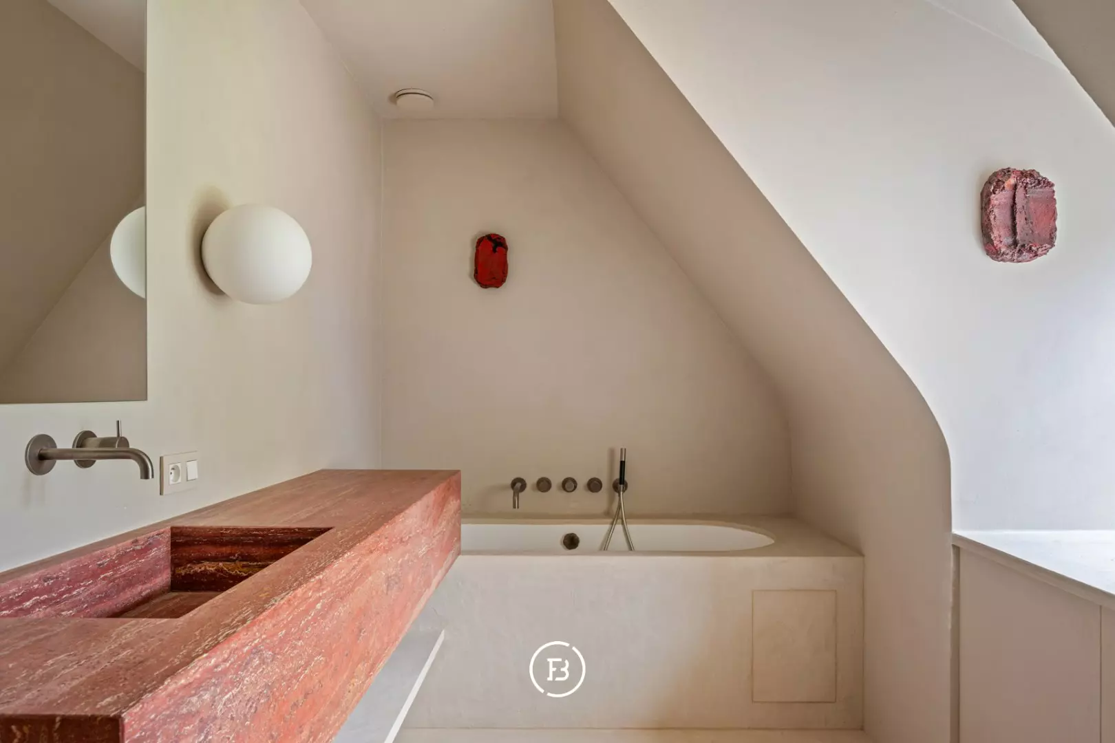- A separate (children’s) bathroom with bathtub and a red travertine sink.