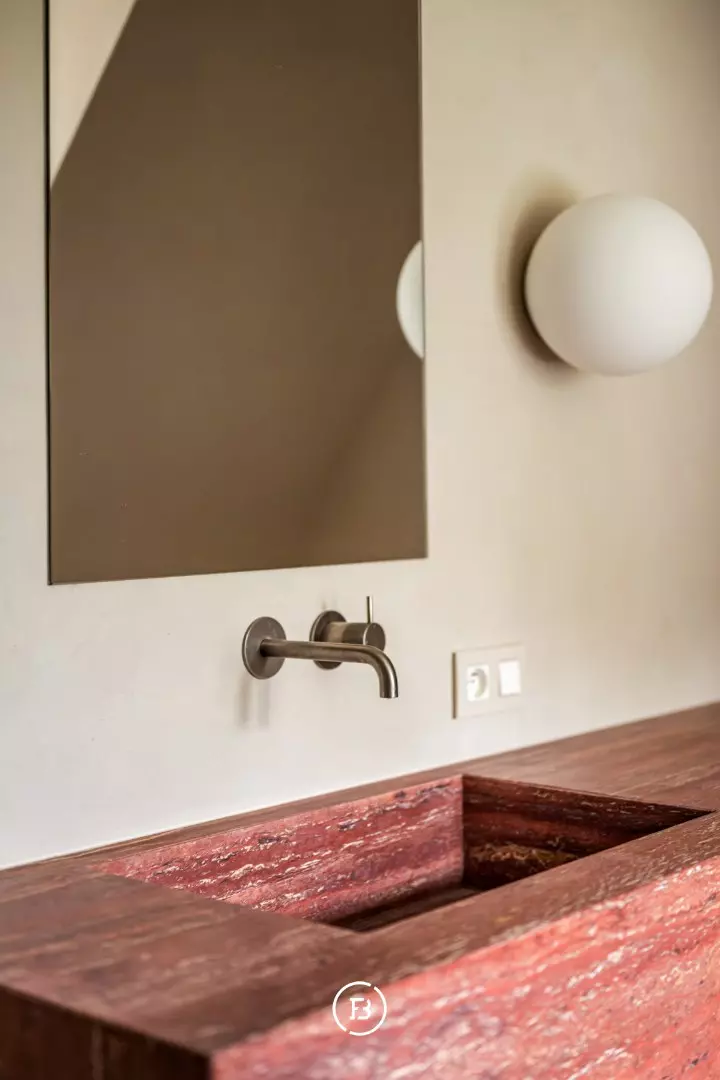 The first floor features a luxurious master bedroom with custom-made furnishings and an ensuite bathroom with walk-in shower and a travertine washbasin. Additionally, there are two children’s bedrooms, both equipped with custom cabinetry, a separate children's bathroom with bathtub and a red travertine washbasin, a guest bedroom with ensuite shower room, and a fifth room currently used as a dressing room.