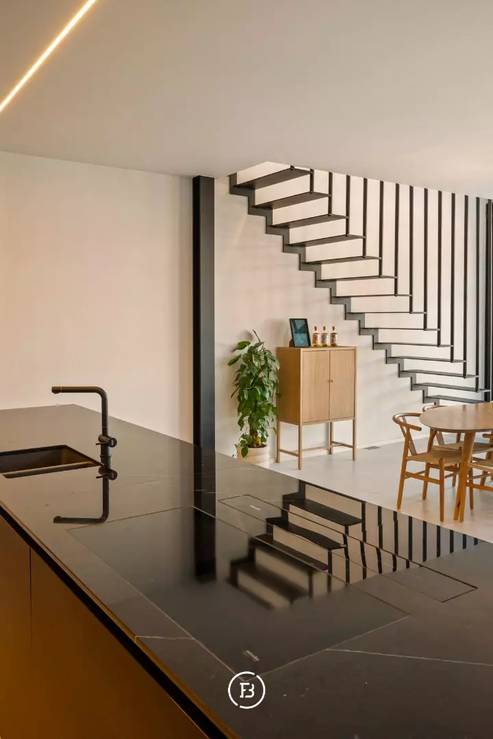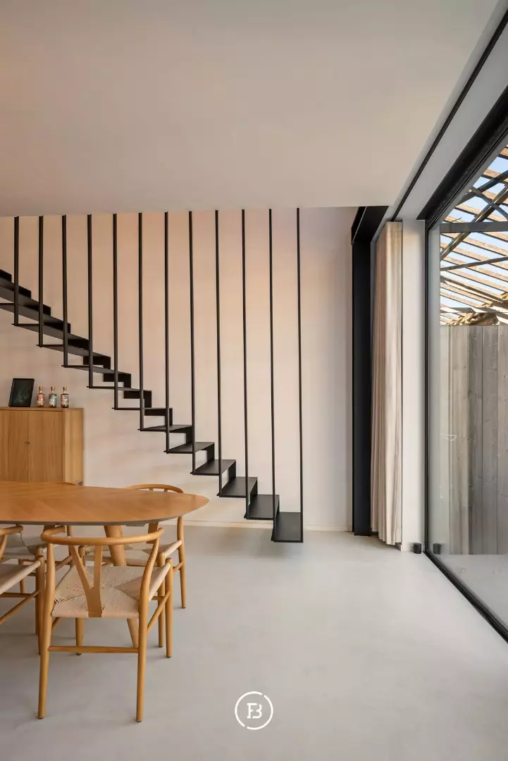 The ground floor is characterized by high ceilings and includes a spacious living and dining area with an open kitchen and kitchen island. The kitchen is fully equipped with high-quality Miele appliances and has a cozy breakfast nook as an extension of the island. There is also a practical storage room, currently used as a laundry and storage space.