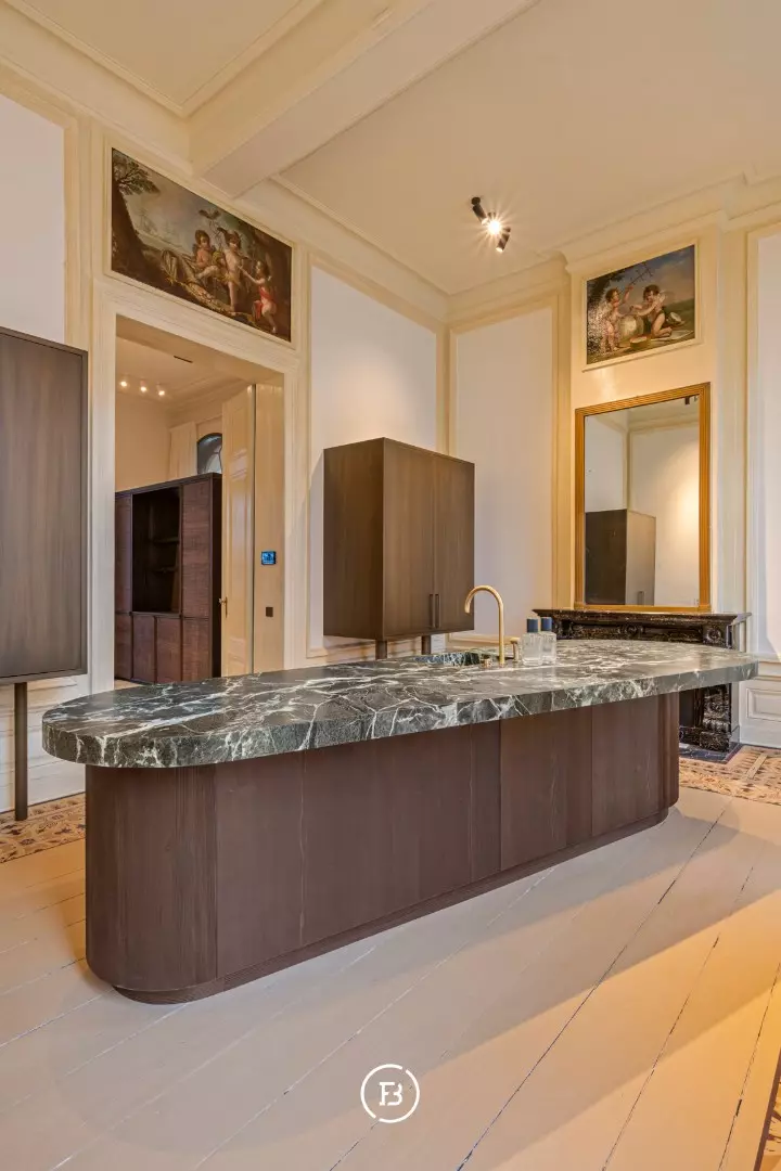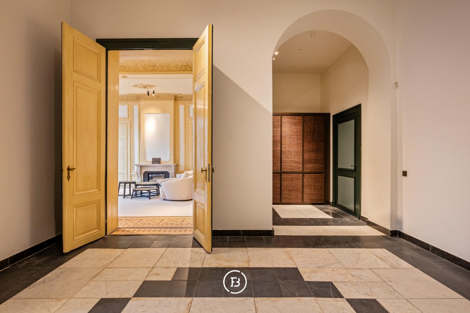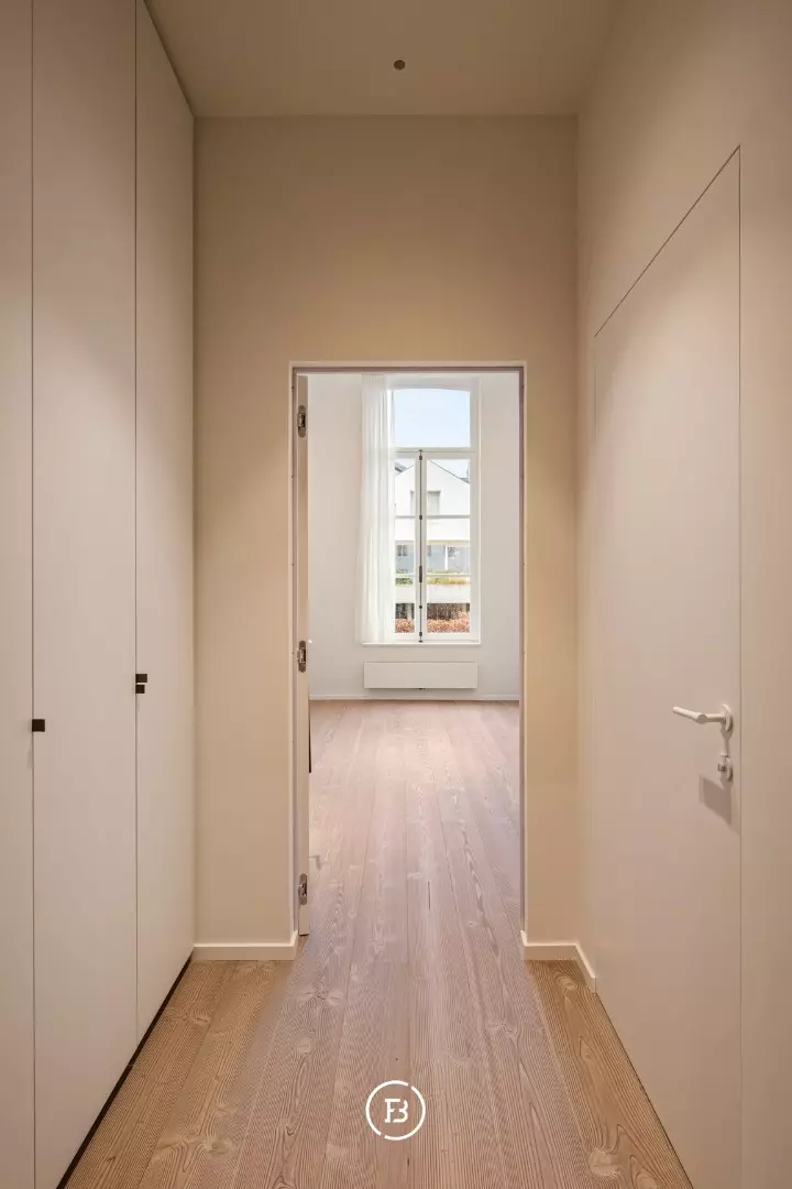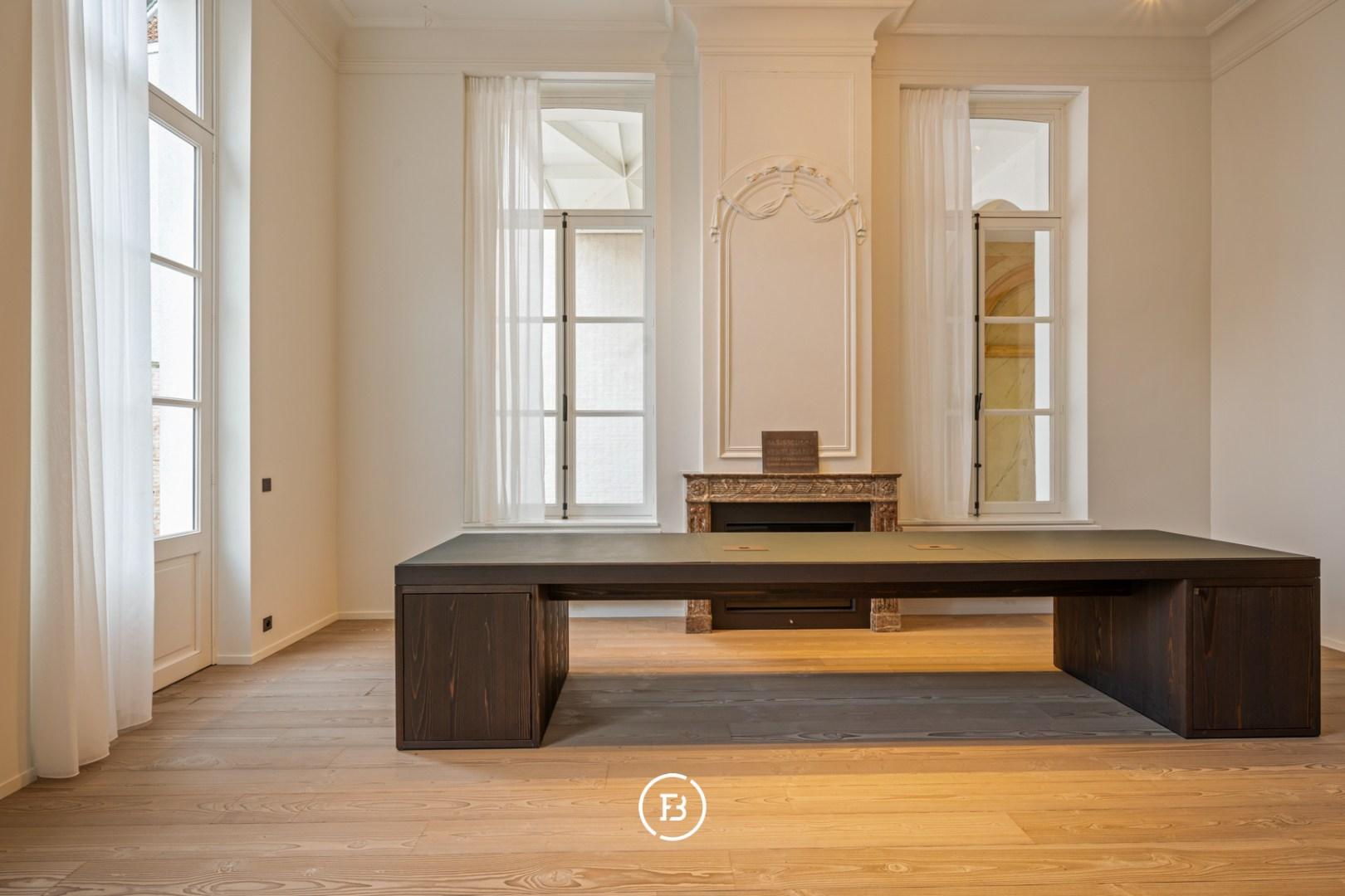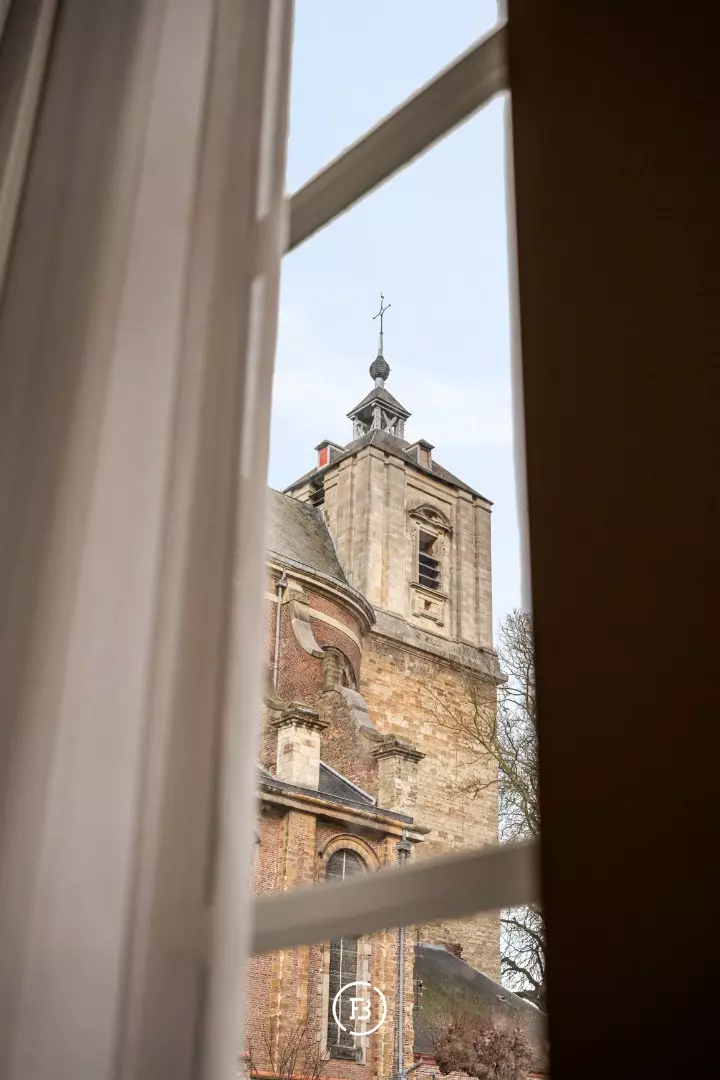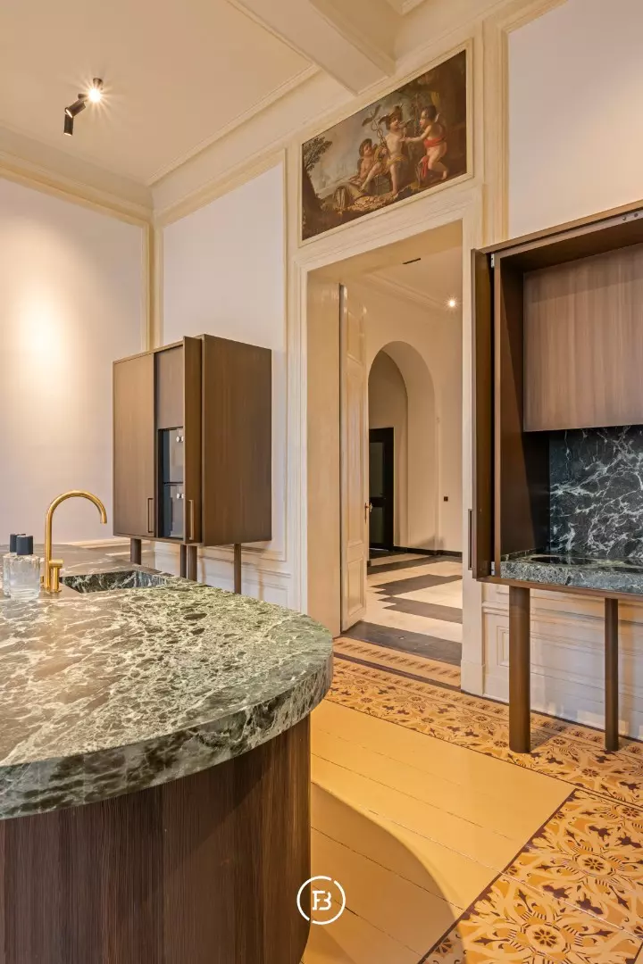Between the most beautiful church in Bruges, the Walburga Church, and the College of Europe, you will find this exclusive residential apartment. It offers spacious living areas, high ceilings, and historical elements such as majestic moldings and leather wall coverings. It is hard not to be lyrical about the assets of this monumental property.