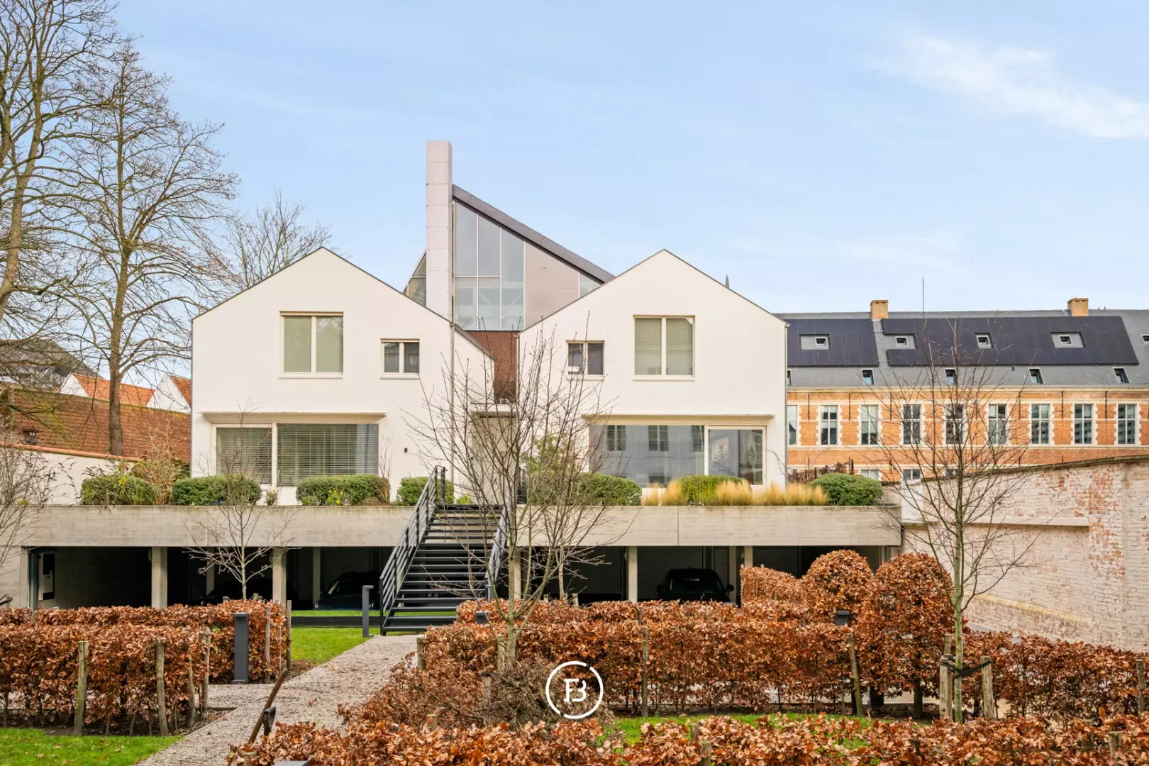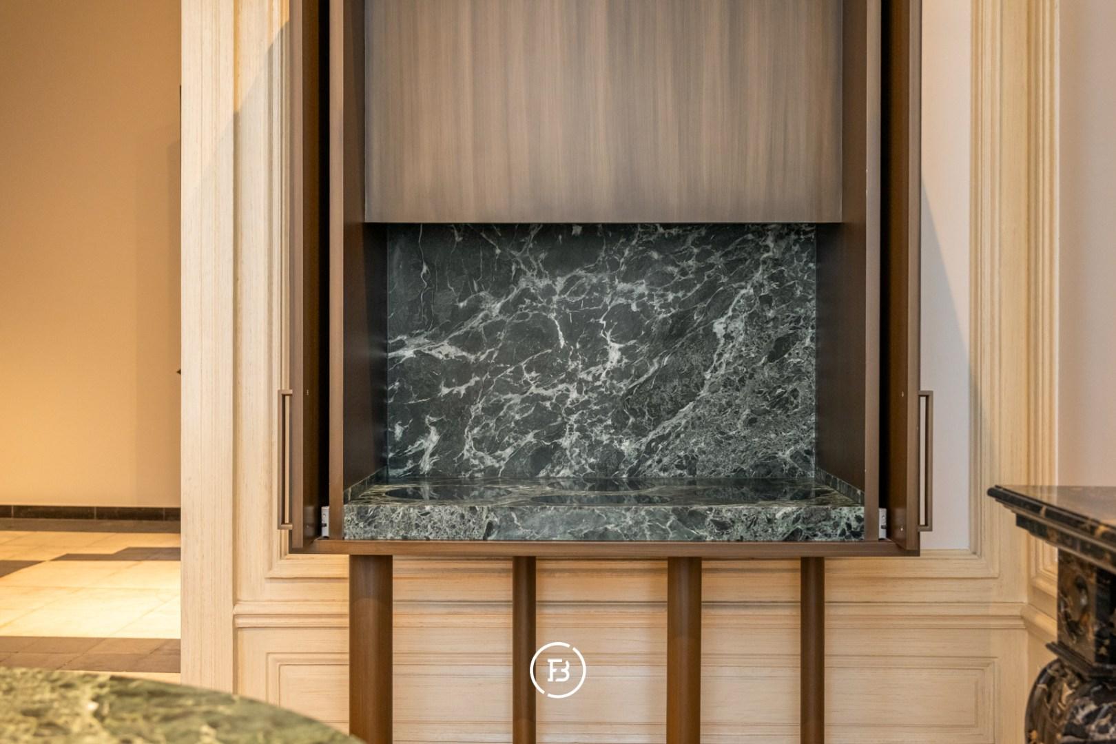 The apartment is located on the ground floor of the Huis Van Hamme residence and boasts a living area of no less than 221 m², a 31 m² terrace, a private entrance hall, gas fireplaces, a spacious living room, a fully equipped kitchen (Obumex), 2 bedrooms (or office), a private closed garage box, and an additional storage room.