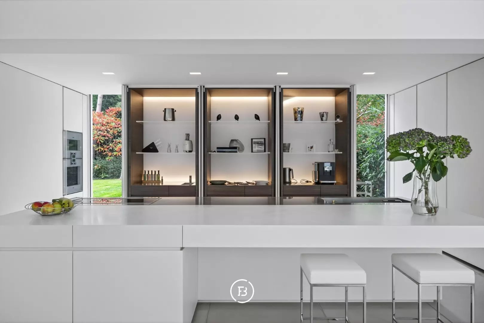 On the ground floor, there is a spacious entrance hall with cloakroom and guest toilet. You’ll also find an office with garden view, a bright living room with a gas fireplace, and a fully equipped kitchen featuring Gaggenau and Siemens appliances. The kitchen includes a stylish Corian breakfast island, complemented by a pantry and a separate storage room.