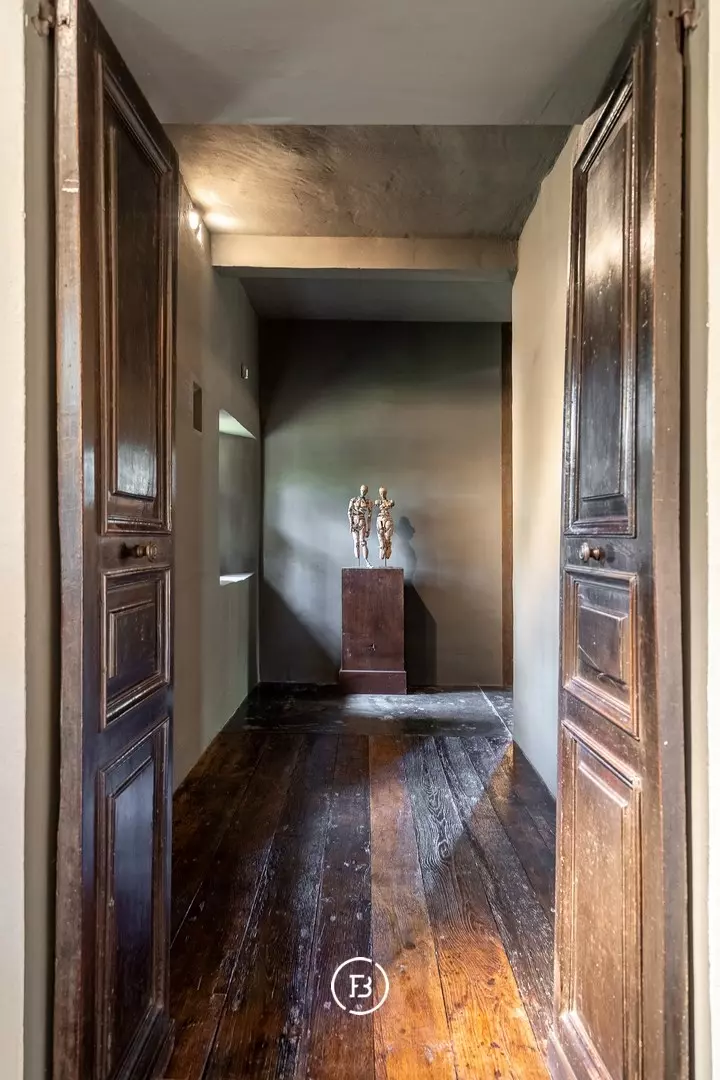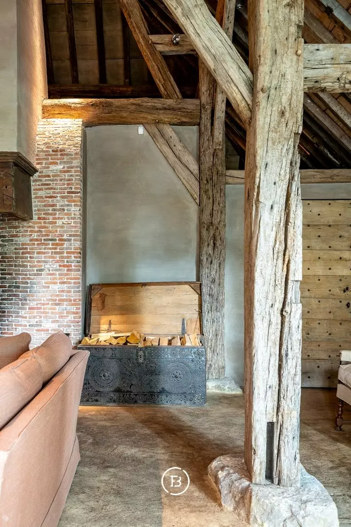 Upon entering the country house, the double open staircase in the serene, monastery-like entrance hall immediately sparks curiosity. The home reveals itself gradually through a pleasant sequence of spaces: a living room, a library with an office, a family kitchen, a separate service kitchen with a pantry, and an impressive underground art gallery leading to a large, classic Flemish barn. The first floor features two master suites, each with its own bathroom and dressing room.
