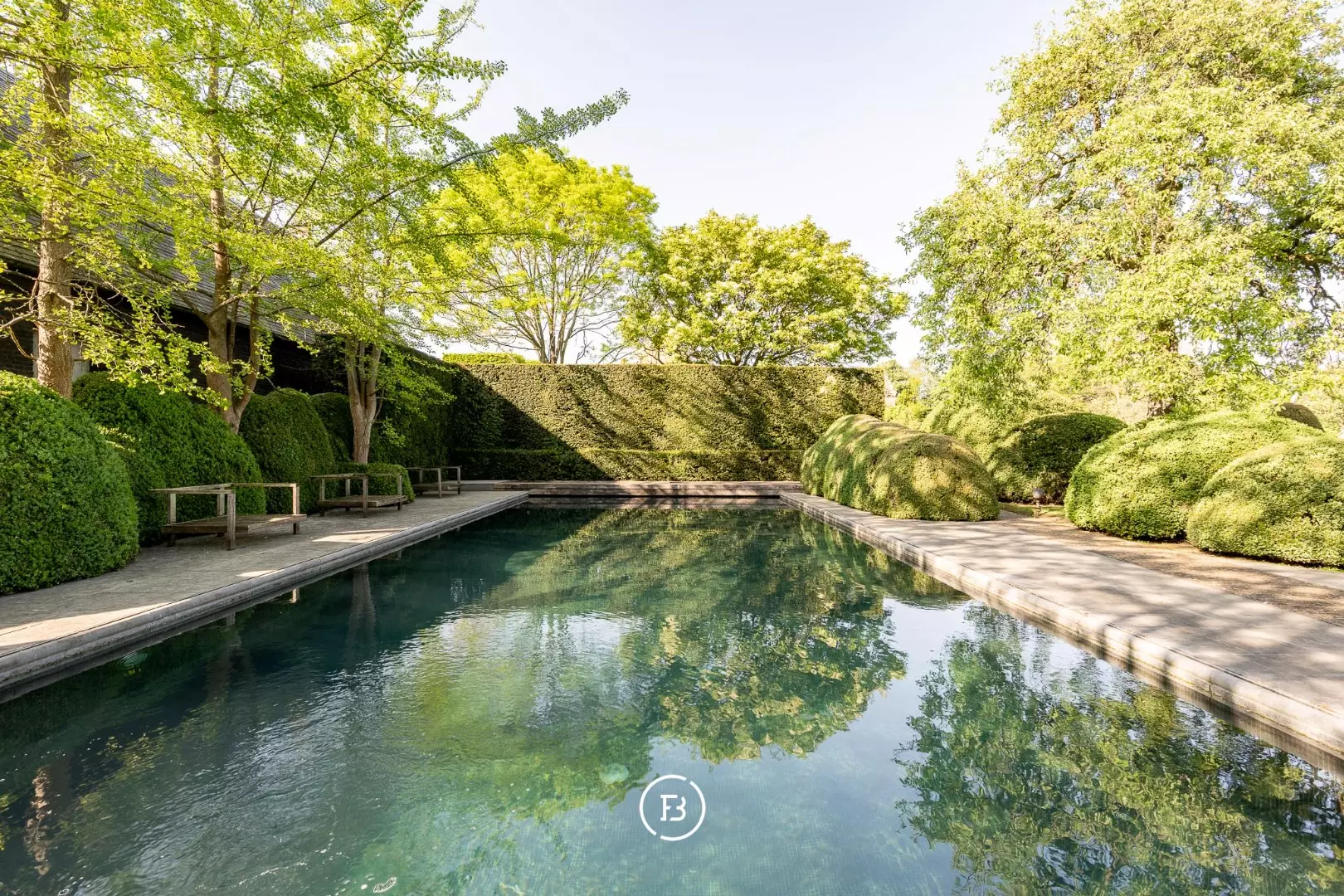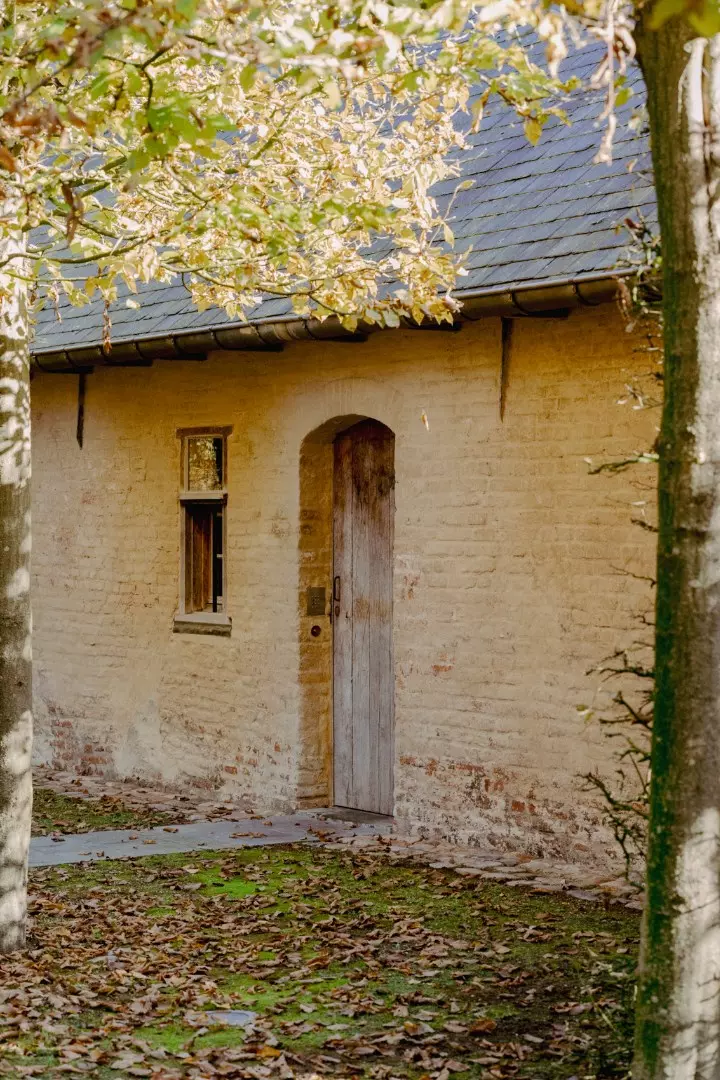 The country house and outbuildings exude the minimalist elegance of art connoisseur and decorator Axel Vervoordt. The impressive estate, with its various walking paths and large hedges, was landscaped by renowned landscape architect Jacques Wirtz.