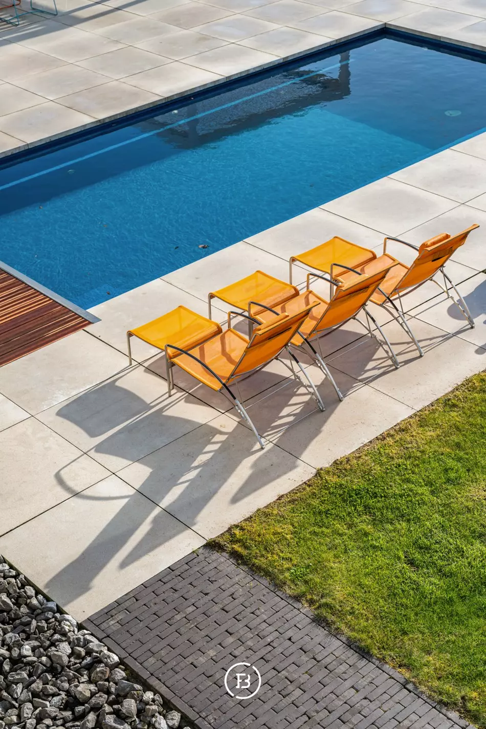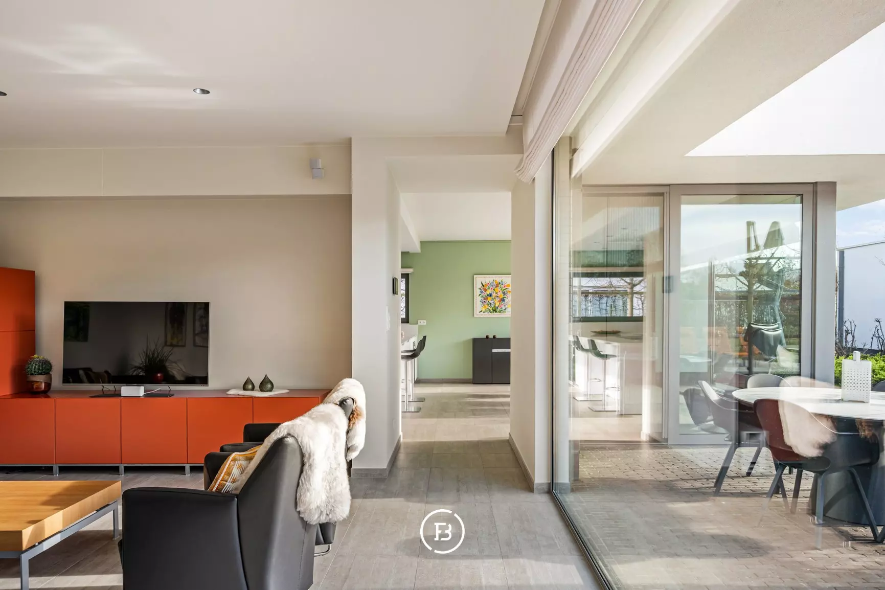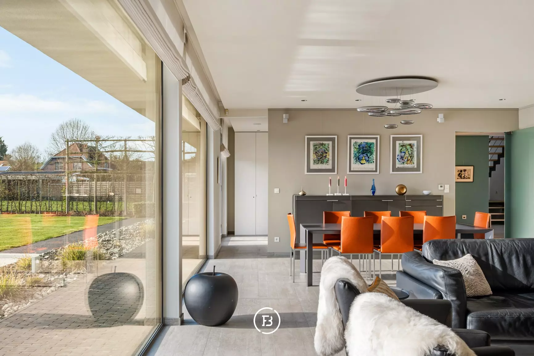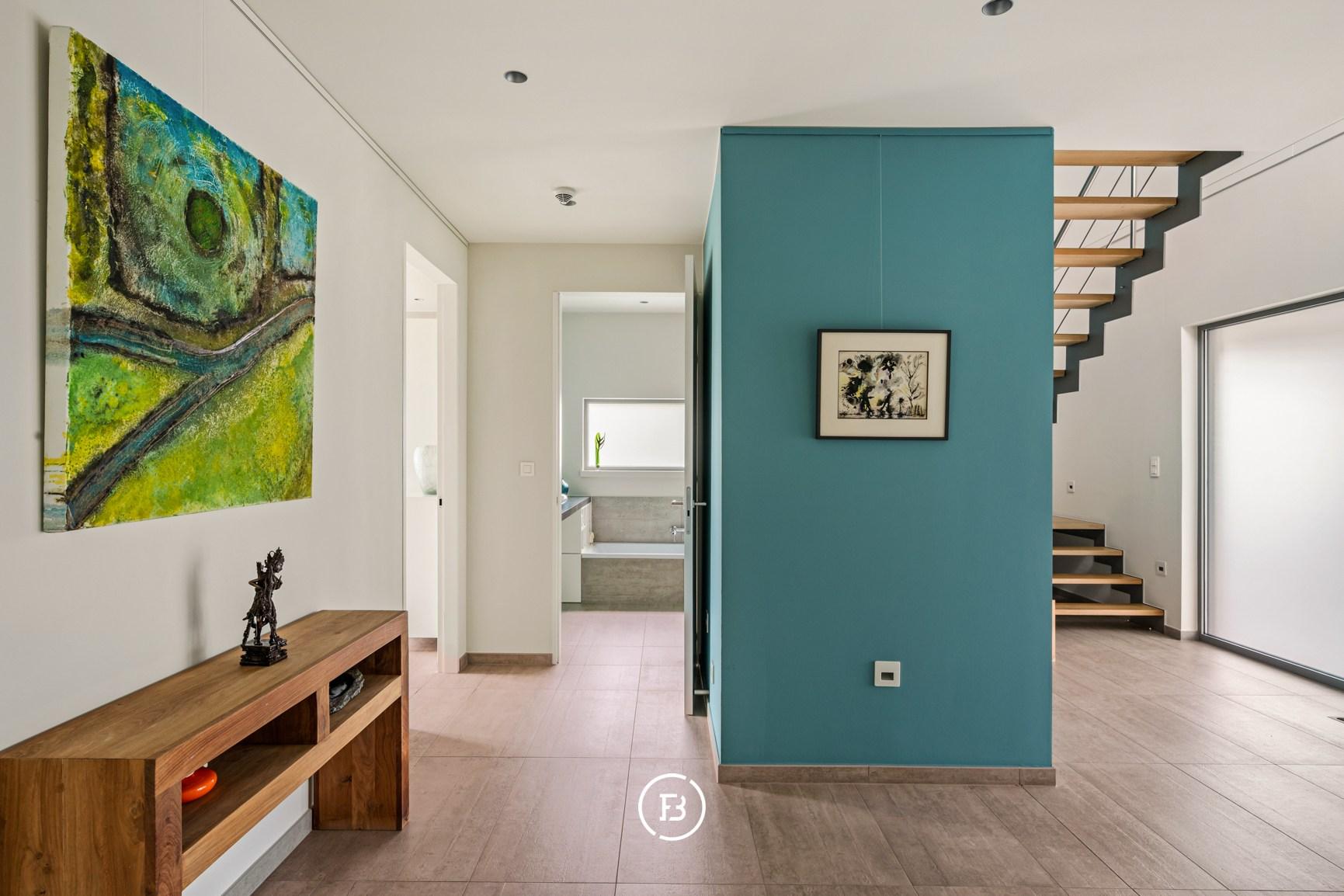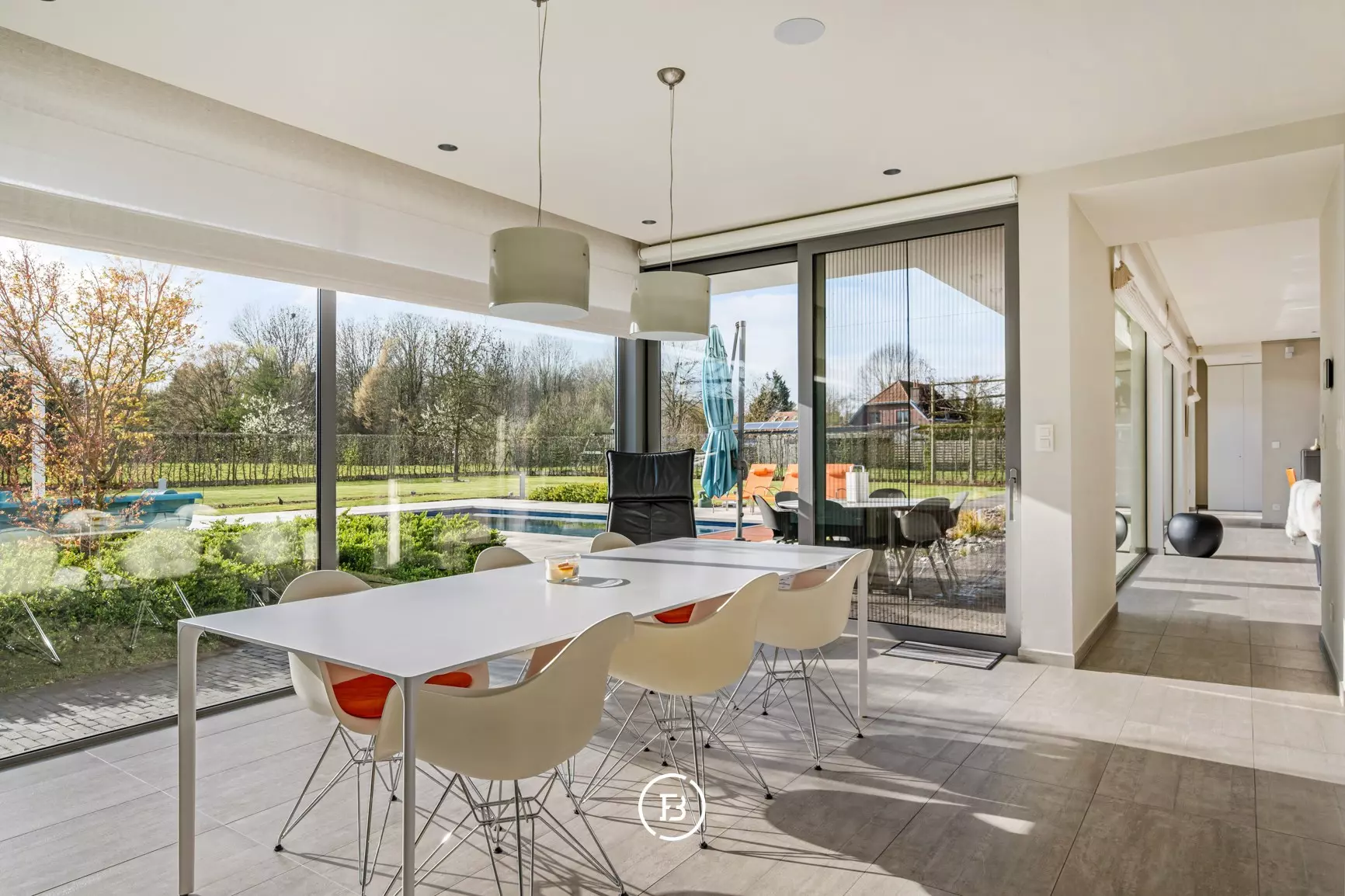 Upon entering the home, you enter a spacious entrance hall with a cloakroom and guest toilet, creating a feeling of openness and structure. The living spaces are particularly bright and are characterized by large windows that create a direct connection to the garden and the pool.