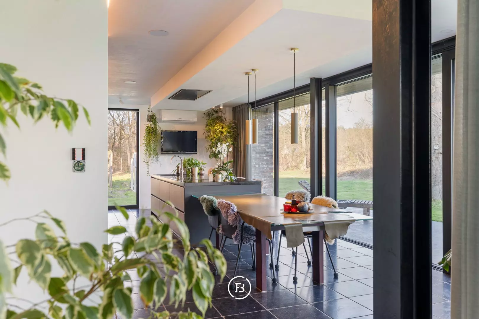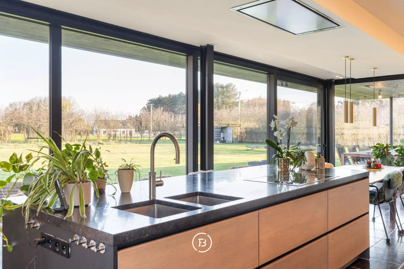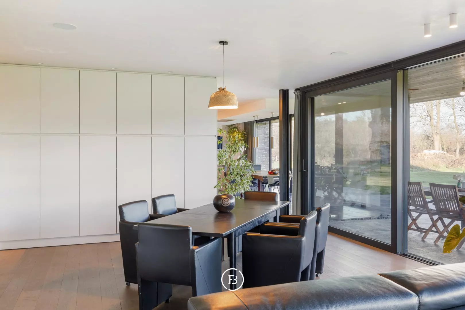The kitchen is fully equipped with premium appliances from Gaggenau and a Quooker tap. From here, as well as the entire living space, you can enjoy a panoramic view over the southeast-oriented garden and the surrounding nature.
