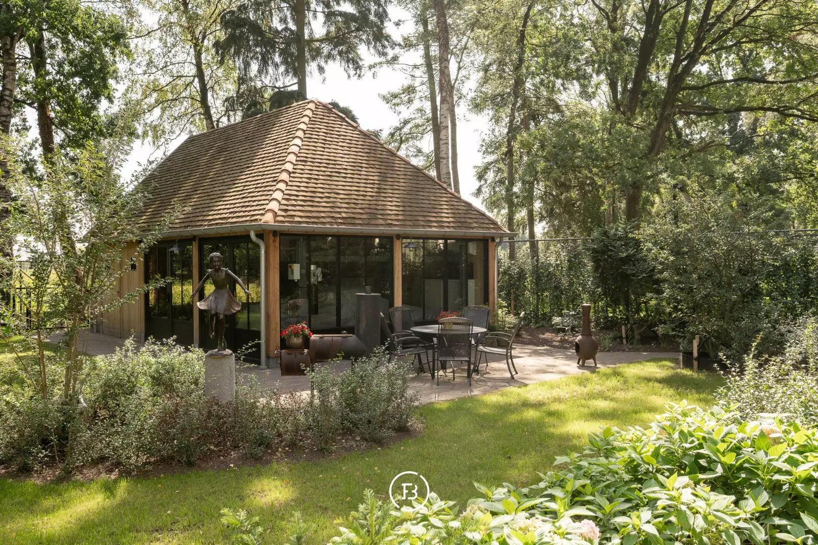 The beautifully landscaped garden enjoys stunning views of the surrounding fields. A real eye-catcher is the charming oak outbuilding with fixed stairs to the mezzanine: the perfect space for a hobby, studio, or relaxation.