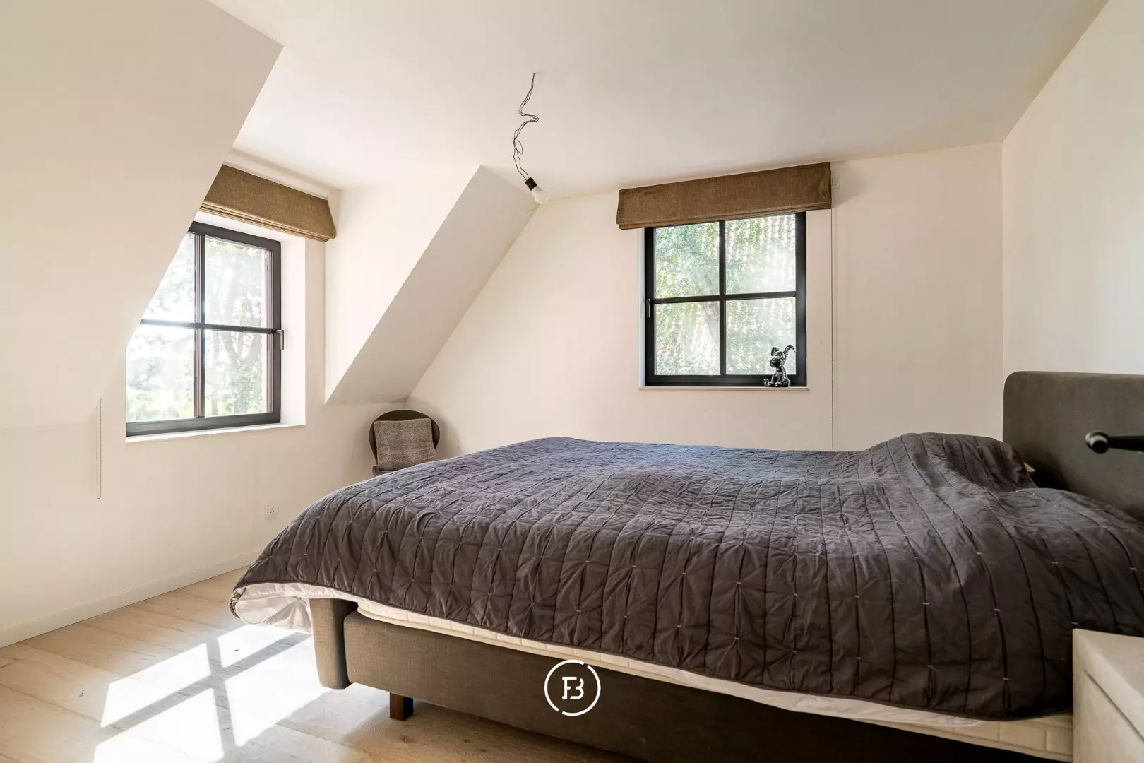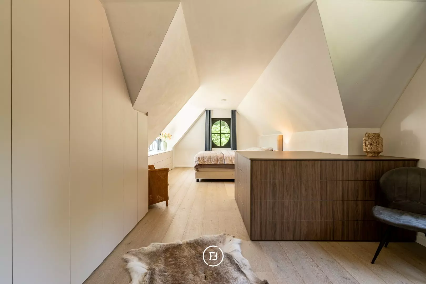 Upstairs, the master suite offers a dressing room and ensuite bathroom. Two children’s bedrooms with built-in wardrobes, a separate shoe storage room, and a toilet complete this floor. A fixed staircase leads to the large attic, which can be converted to suit your needs (bedroom and bathroom, hobby or playroom).