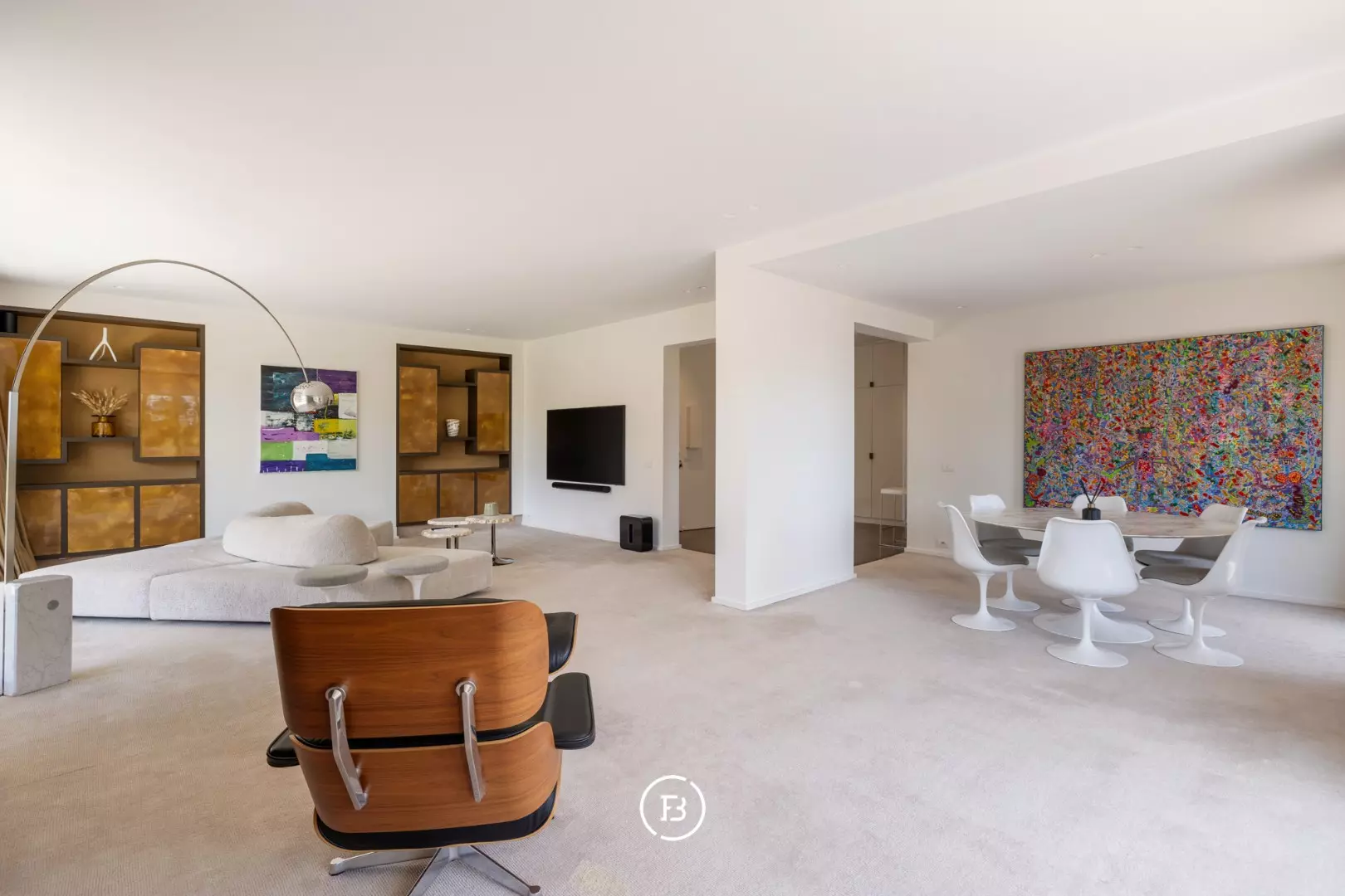 The apartment comprises an entrance hall with cloakroom and guest toilet. It features a spacious and exceptionally bright living area, including a lounge and dining room, with direct access to a southwest-facing terrace benefiting from optimal sunlight.