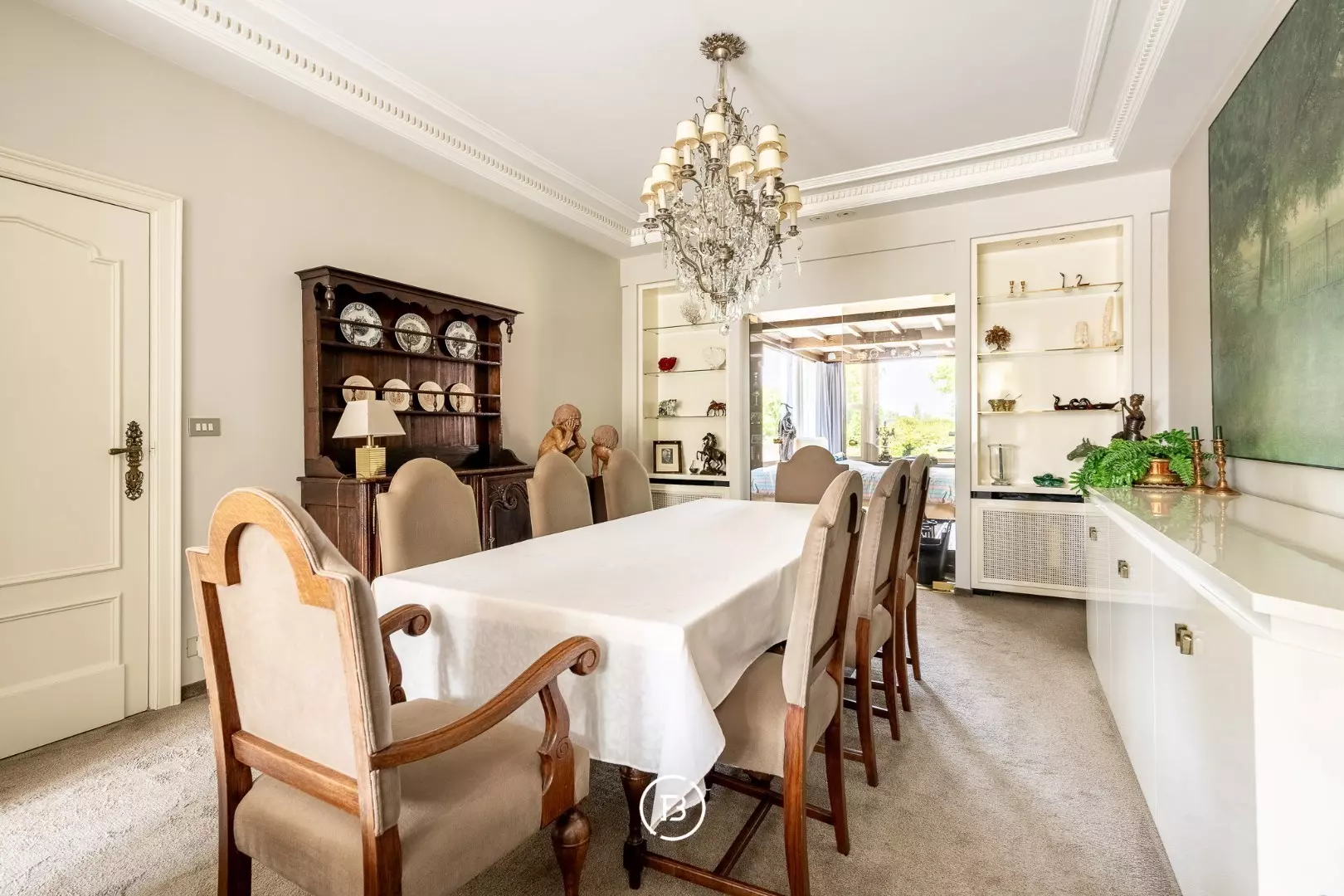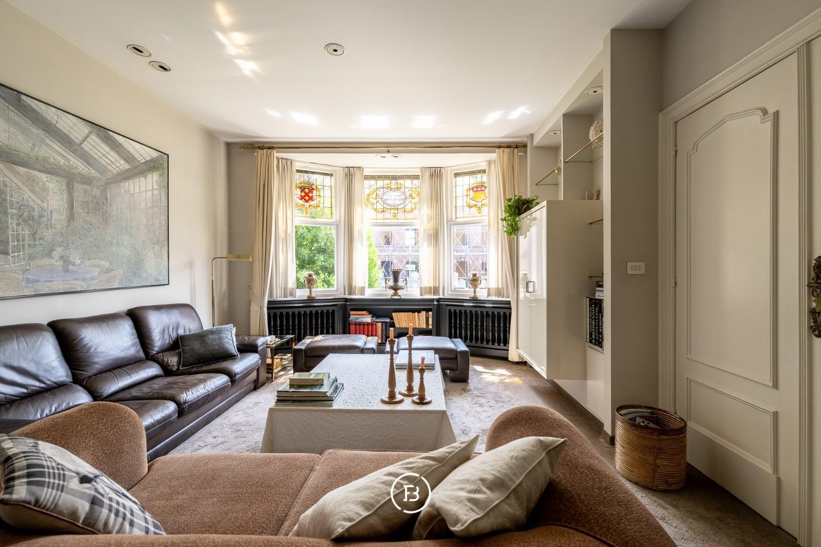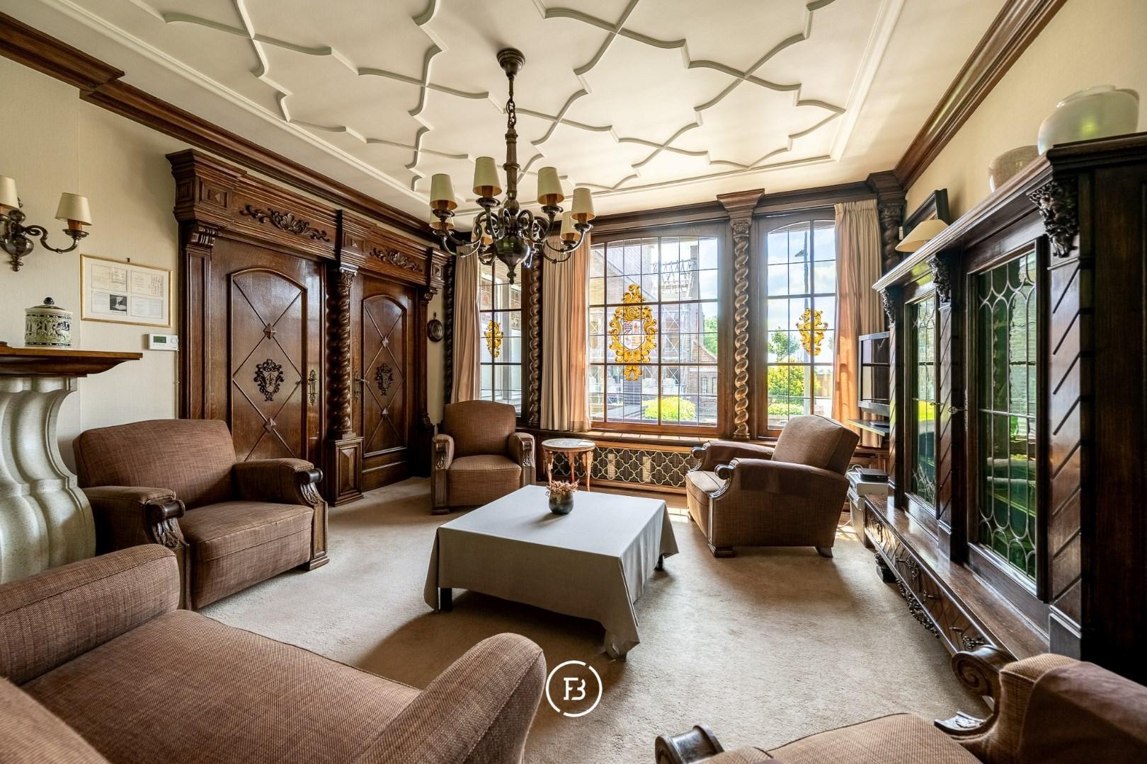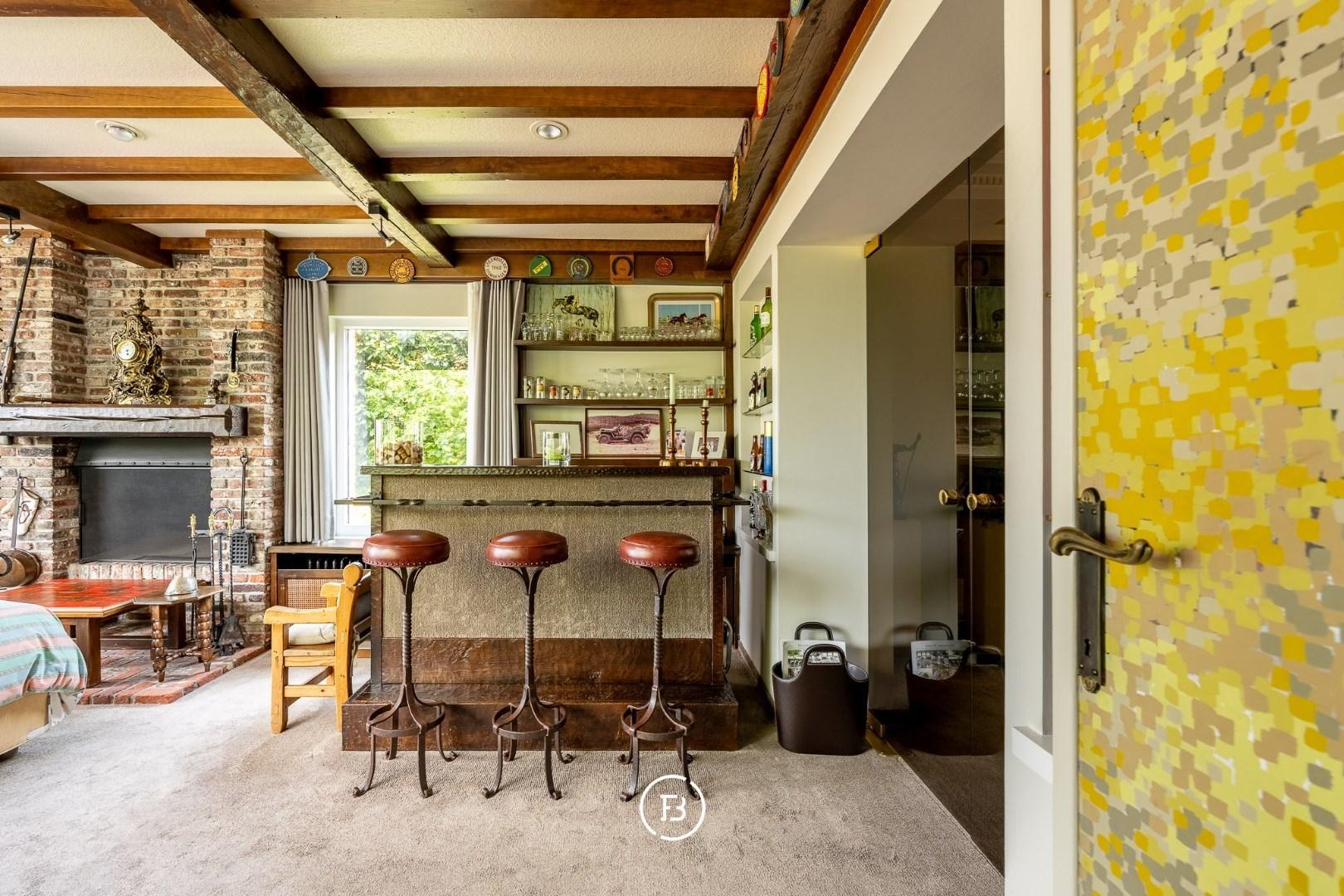 You enter the house through a bright entrance hall with staircase, leading on one side to a cozy sitting area, and on the other to a spacious, light-filled living room with an adjoining bar or office space. This connects seamlessly to the practical kitchen and a second large living area, ideal for family use or a professional activity.