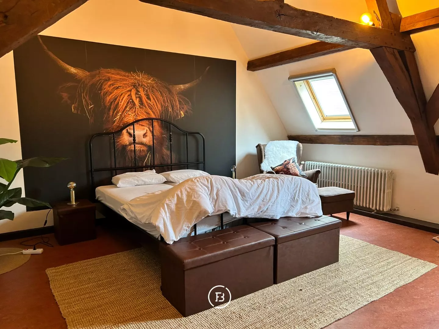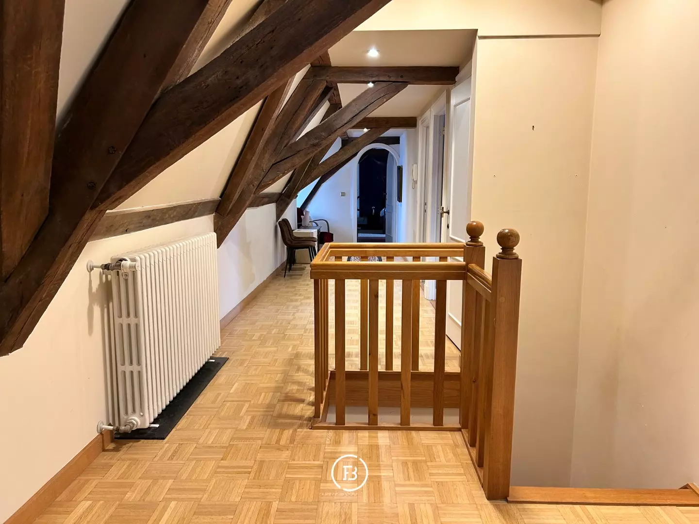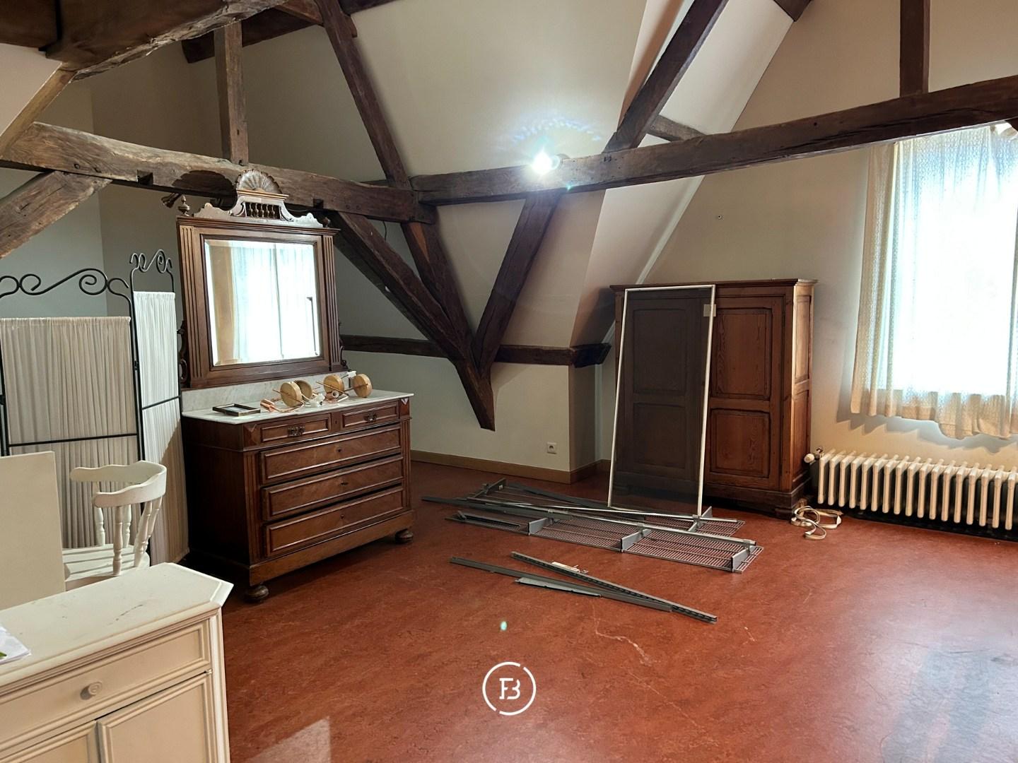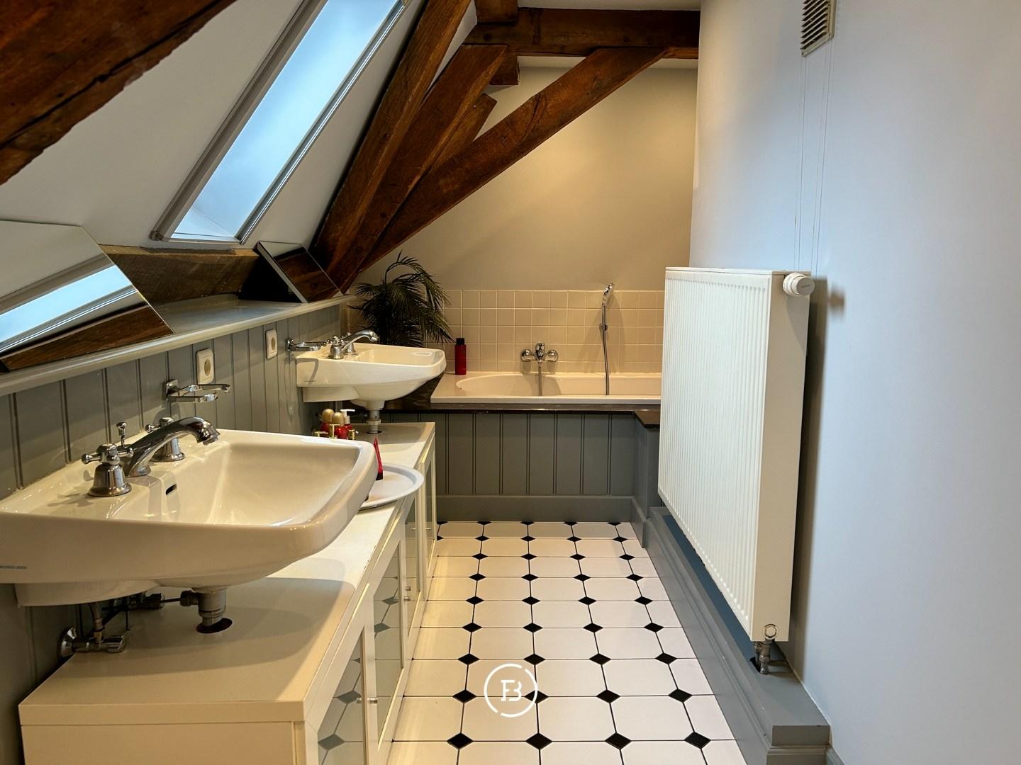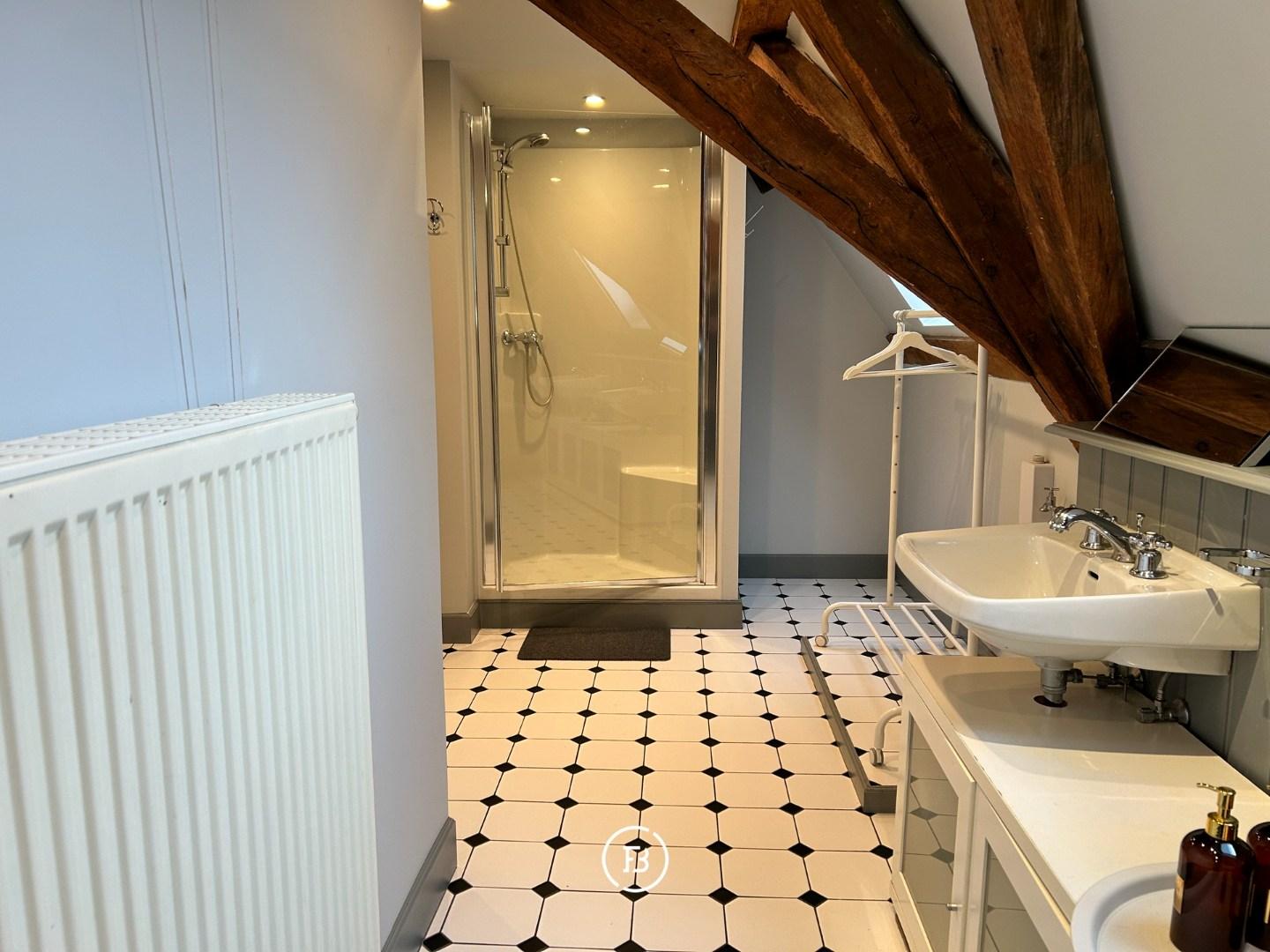 The second floor houses the bedroom, where the visible beams create an authentic feeling. The bathroom is equipped with a double sink, a shower, and a bathtub. Additionally, there is an extra attic space and a separate storage room on this floor.