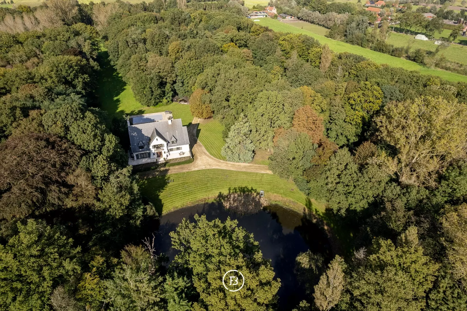 The outdoor layout is equally impressive: a pond graces the front of the house, while a large swimming pool with pool house at the rear offers space for relaxation. The surrounding meadows are particularly well-suited for animal lovers.