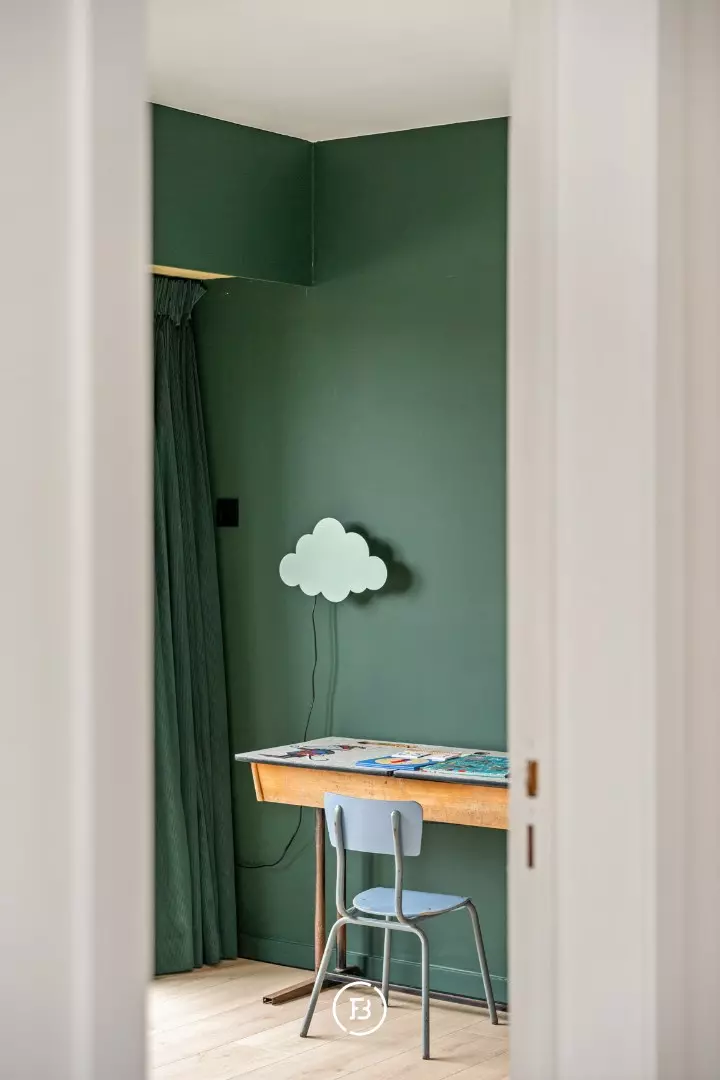 On the first floor, the night hall is the central connecting point. Here are three spacious bedrooms and a dressing room. The master bedroom has a renovated ensuite bathroom with a bathtub and opens onto a spacious terrace. A second bedroom on the street side has new aluminum joinery with acoustic glass and also has access to a terrace. A third bedroom has its own shower room and offers additional expansion possibilities through an attic space.