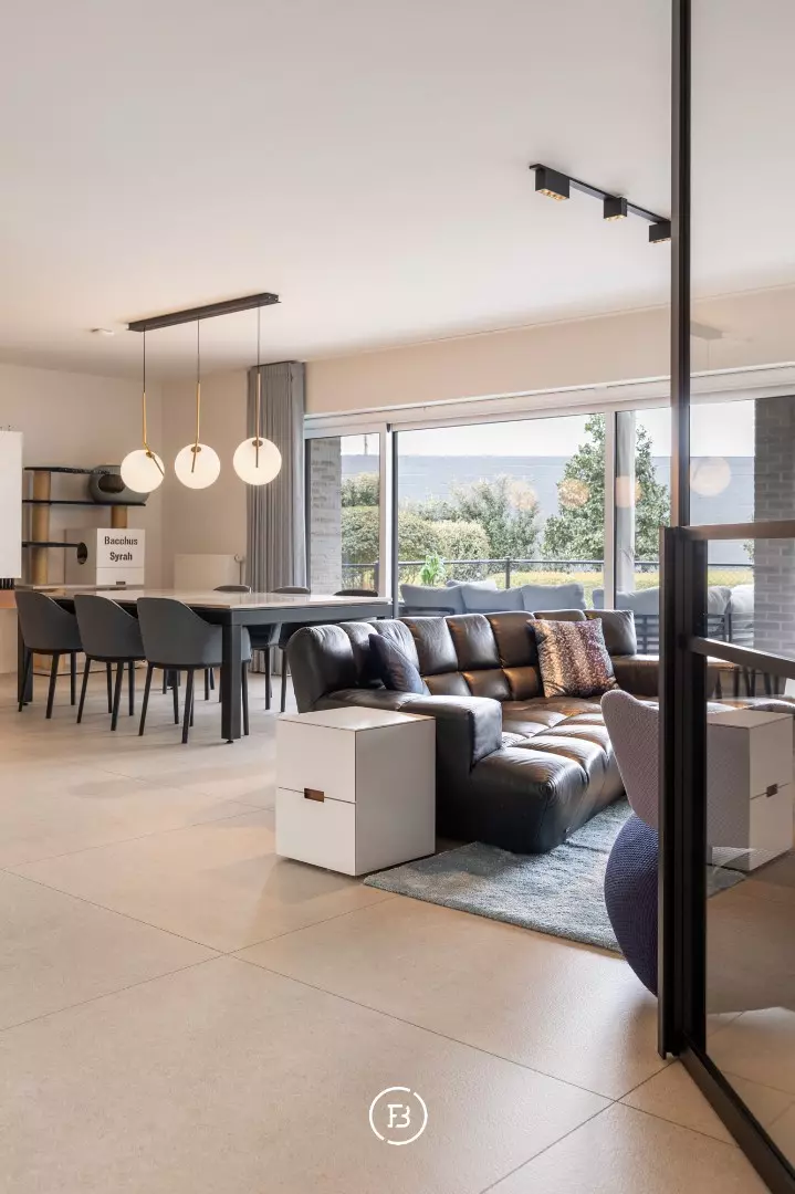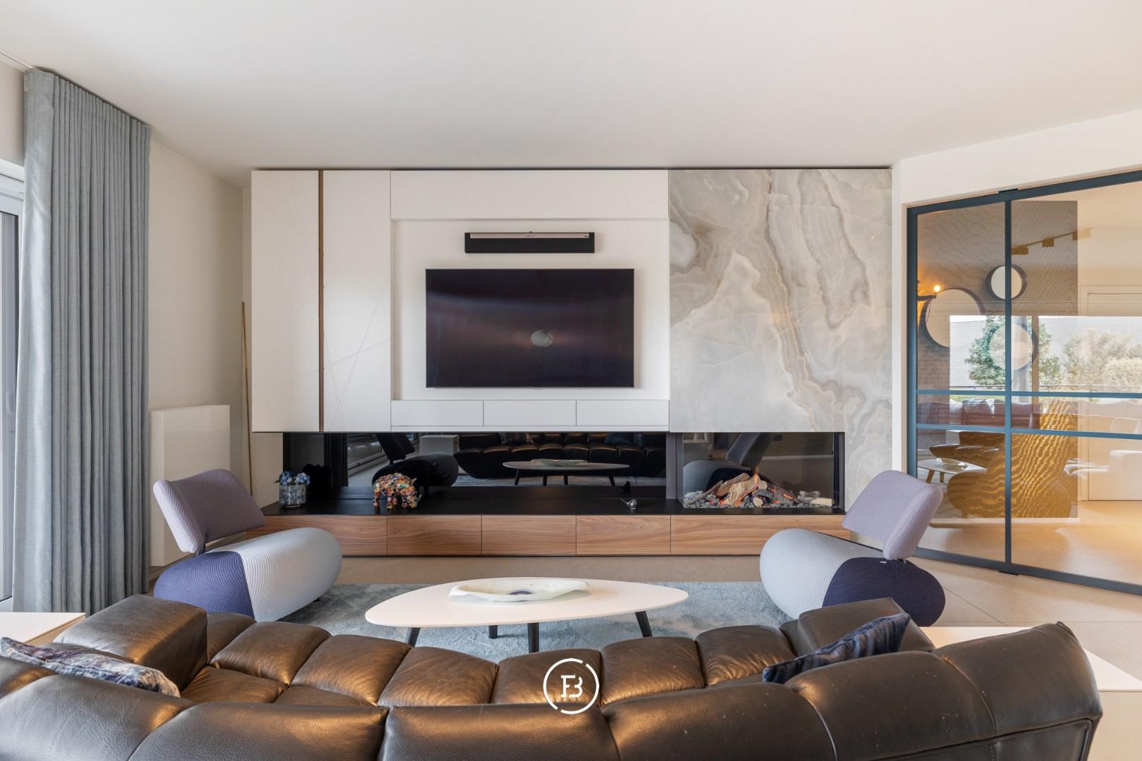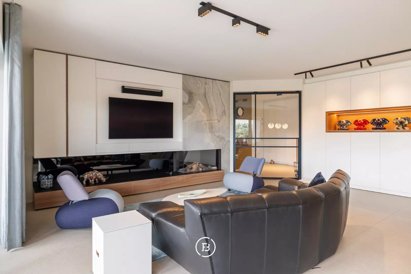 Le salon lumineux est équipé de placards sur mesure, de techniques discrètement intégrées et d'une cheminée au gaz chaleureuse, créant ainsi un ensemble épuré mais chaleureux.