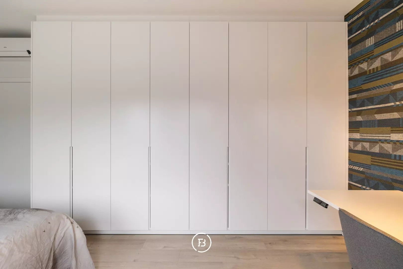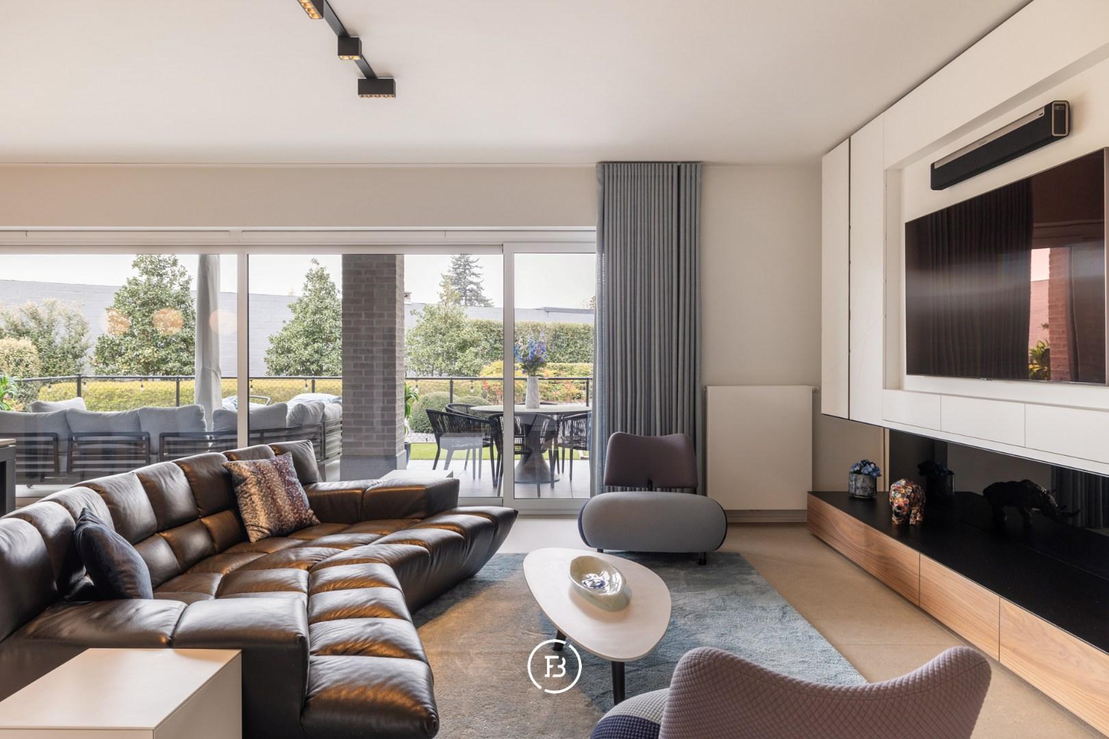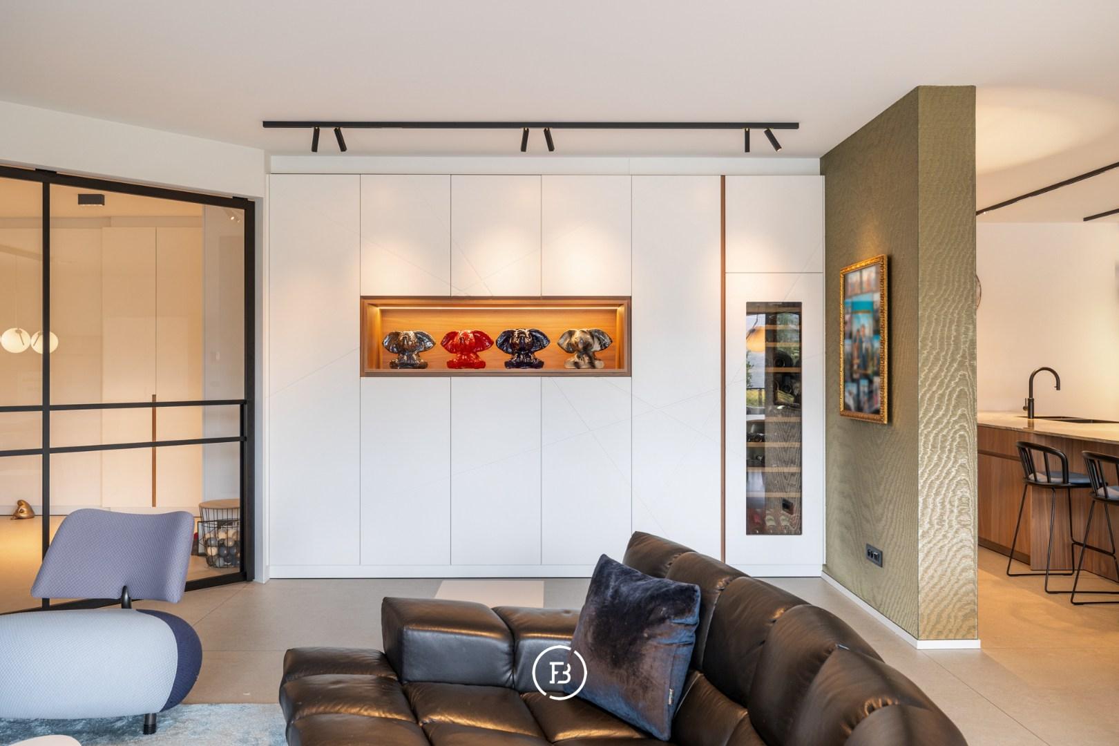 Le salon lumineux est équipé de placards sur mesure, de techniques discrètement intégrées et d'une cheminée au gaz chaleureuse, créant ainsi un ensemble épuré mais chaleureux.
