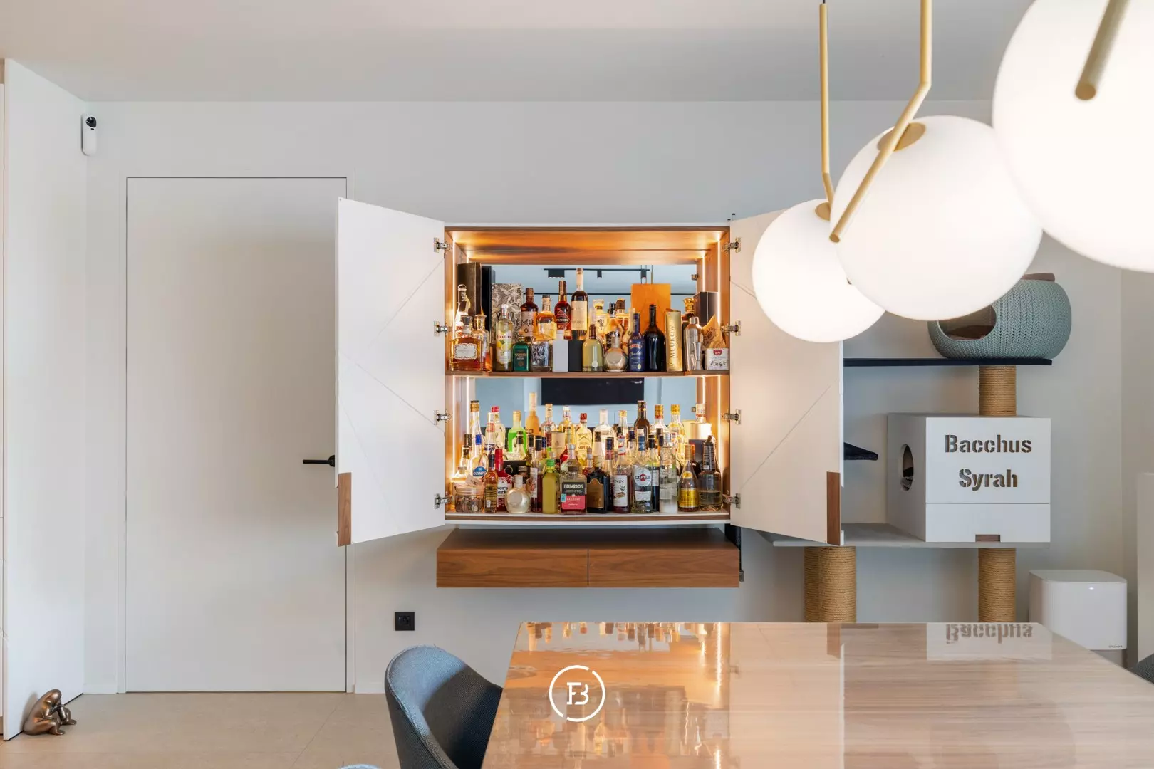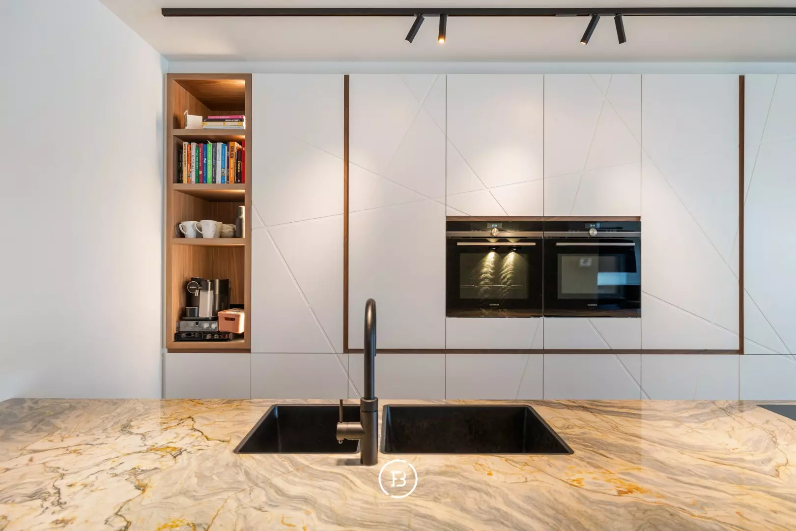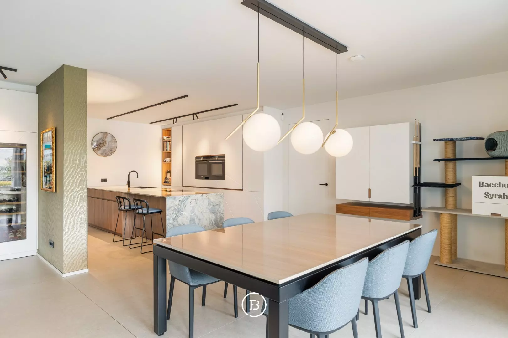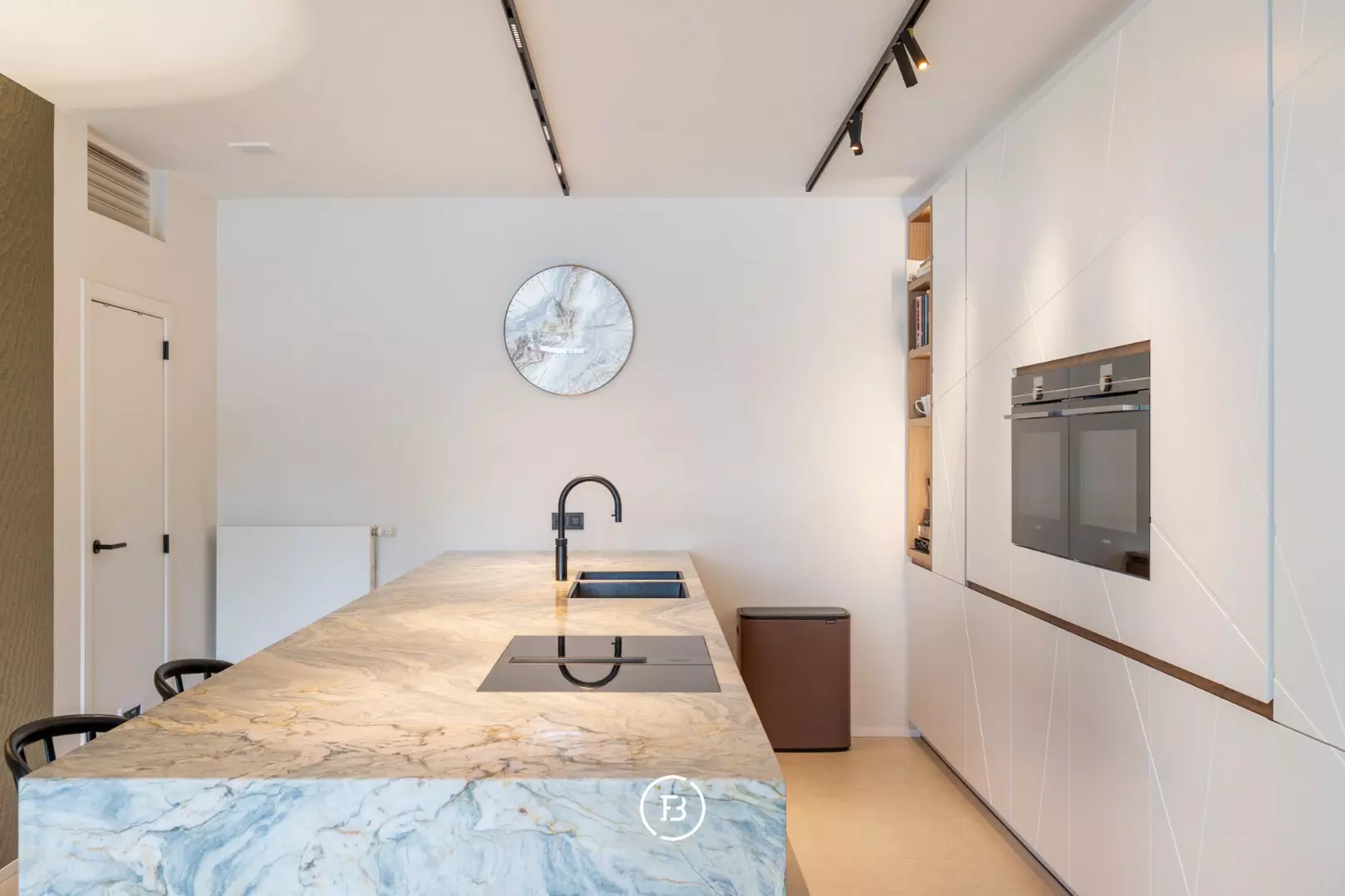 Au centre de l'appartement se trouve un îlot de cuisine généreux en pierre naturelle de quartzite. La cuisine est équipée d'appareils haut de gamme, dont une plaque de cuisson BORA, un four Siemens avec fonction vapeur, un robinet Quooker, un réfrigérateur Liebherr avec fonction de glaçons et une cave à vin encastrée.