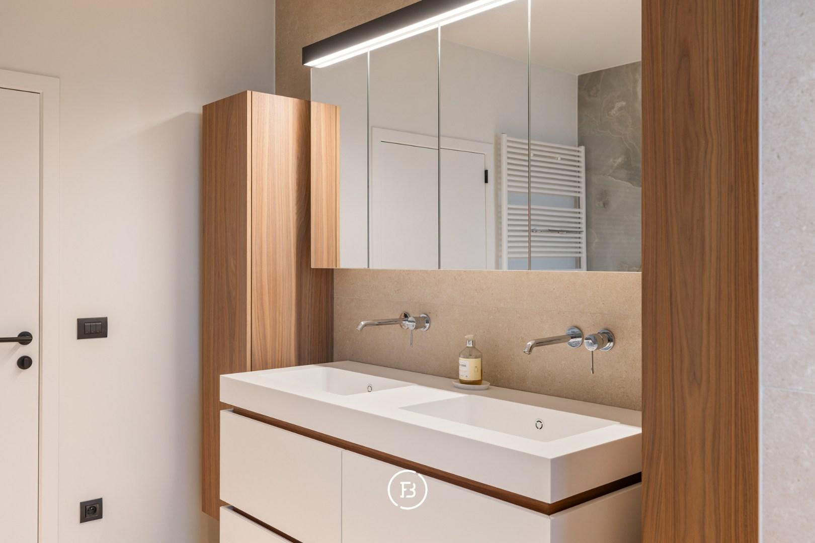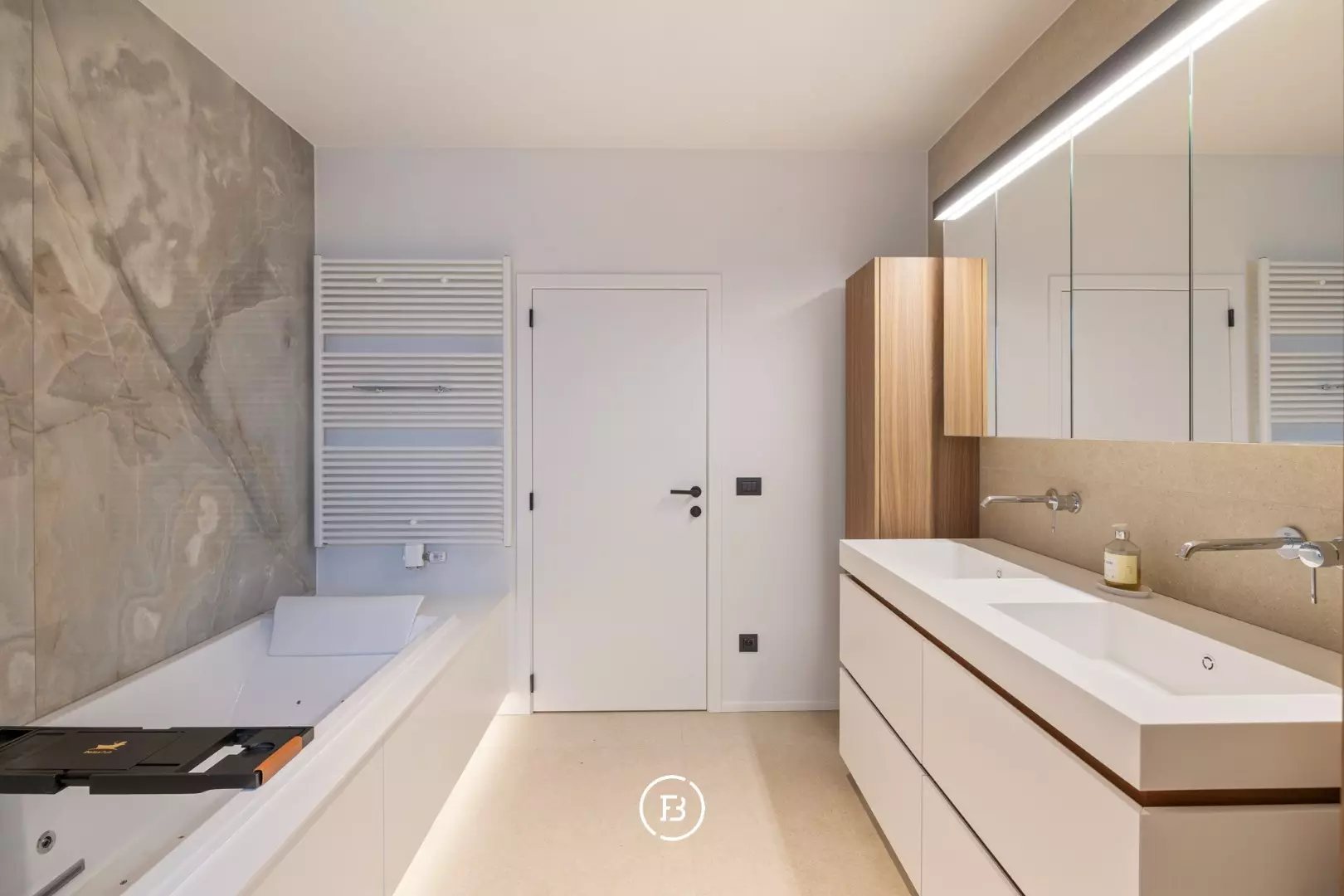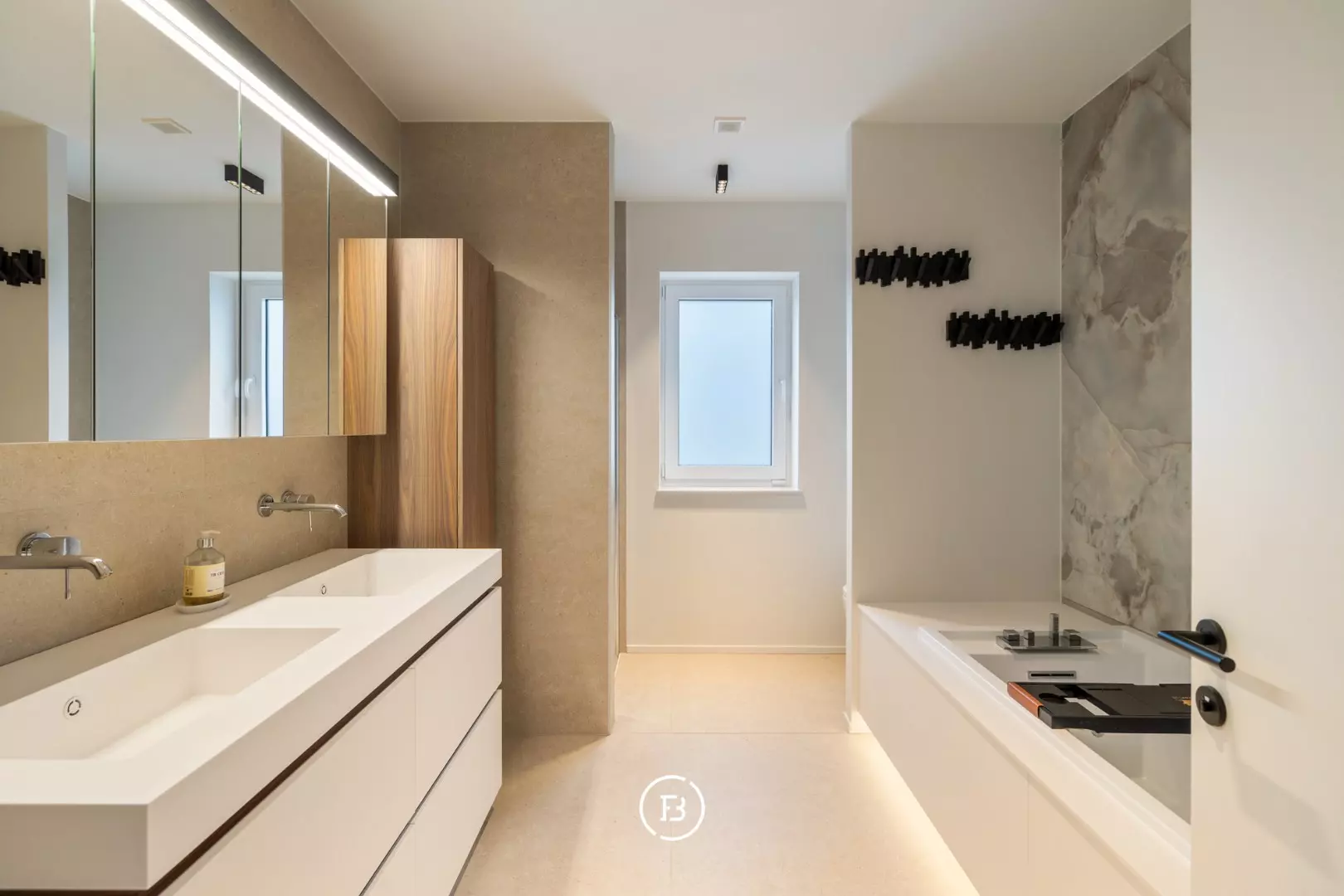 Cet appartement récent (construit en 2020) offre une surface habitable généreuse de 165 m² et dispose d'une magnifique terrasse orientée sud-ouest de 32 m². Le concept intérieur est cohérent dans chaque pièce, avec une harmonie raffinée entre le noyer, la laque et la pierre naturelle.