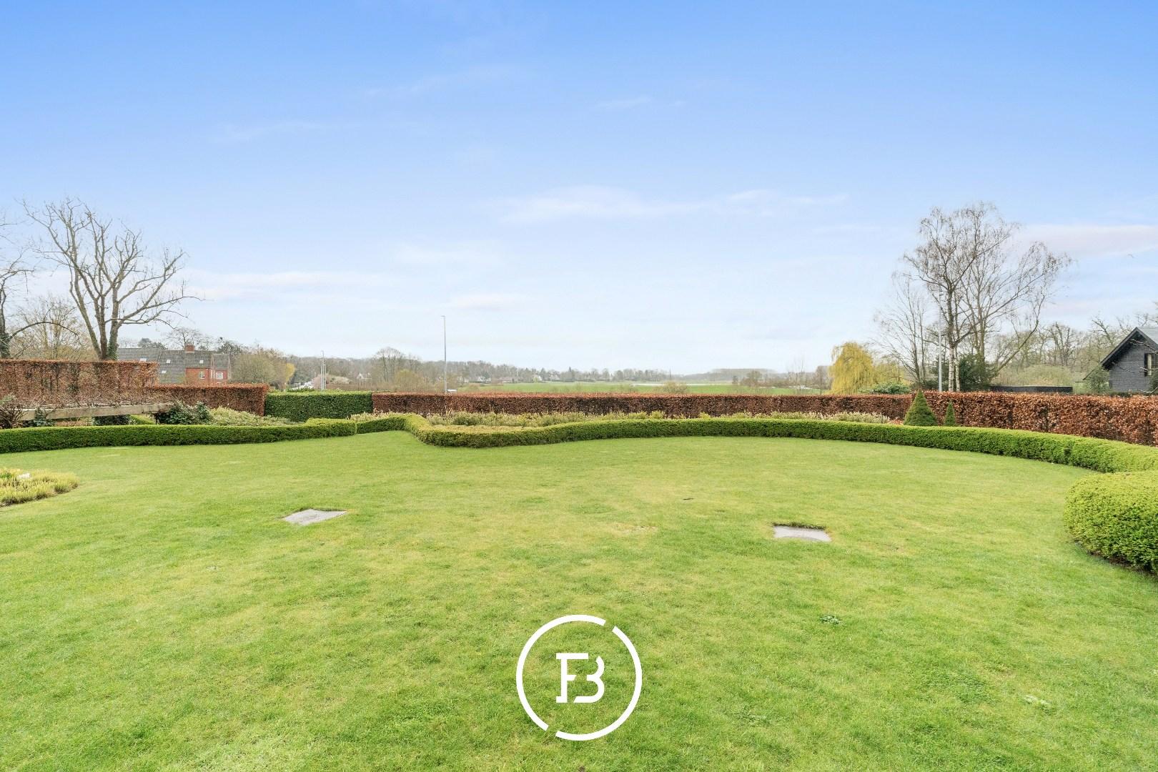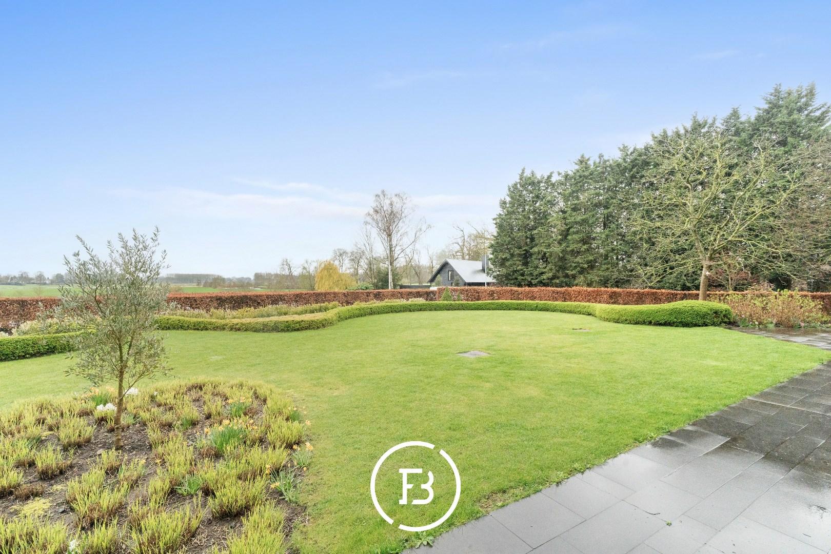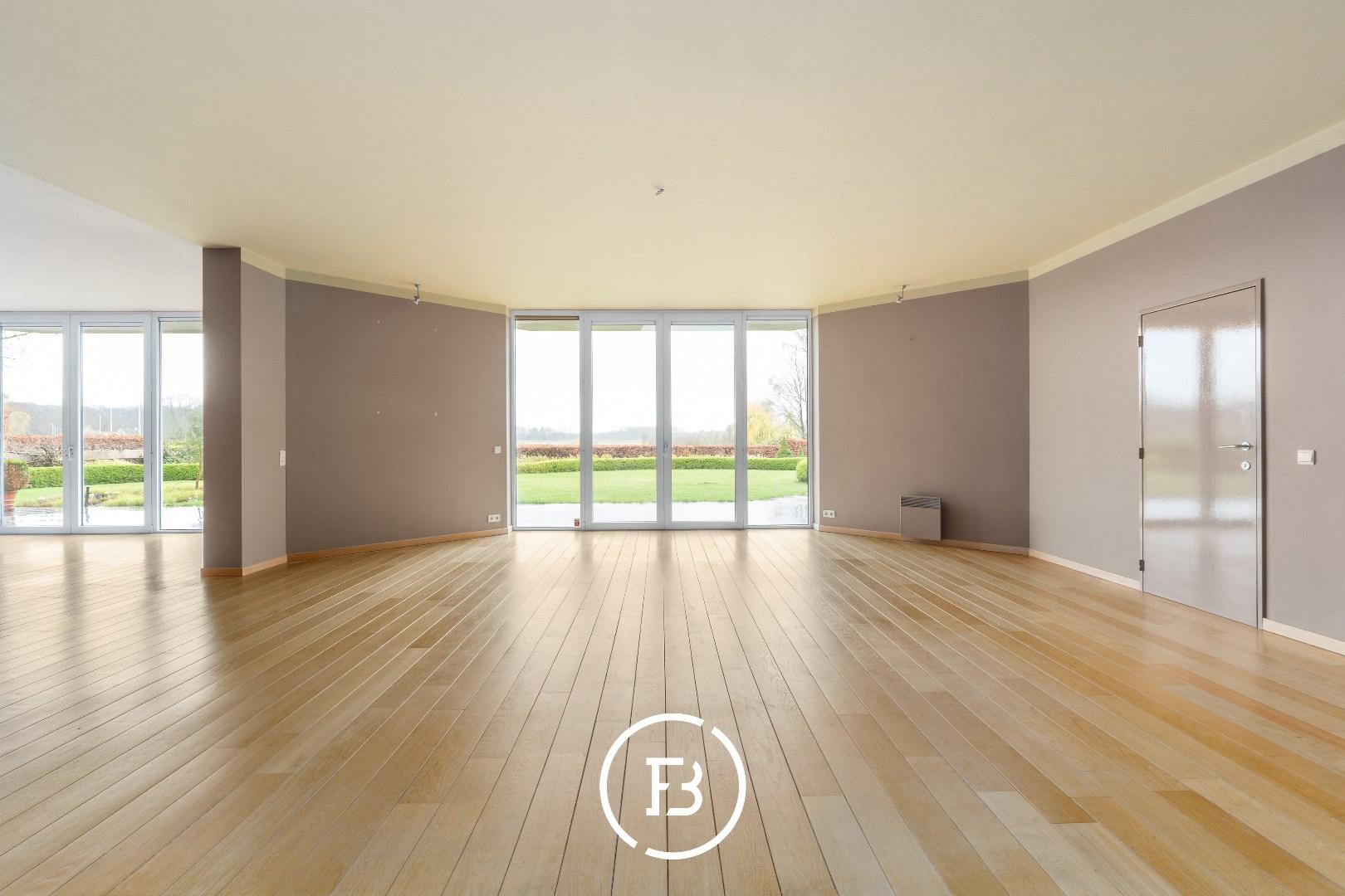 Le spacieux salon avec cheminée bénéficie de beaucoup de lumière naturelle et offre une belle vue sur le jardin privé et la Leie.