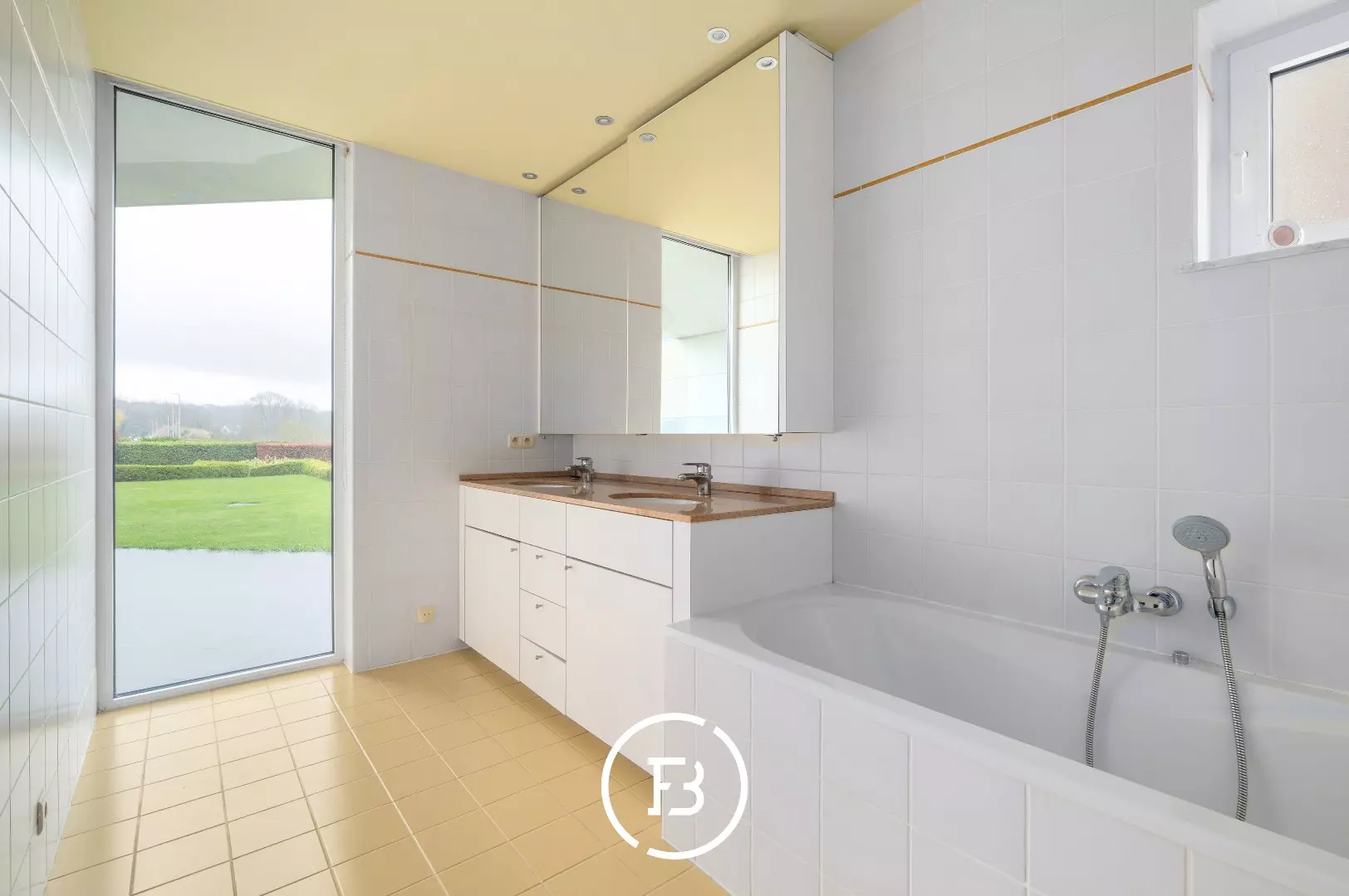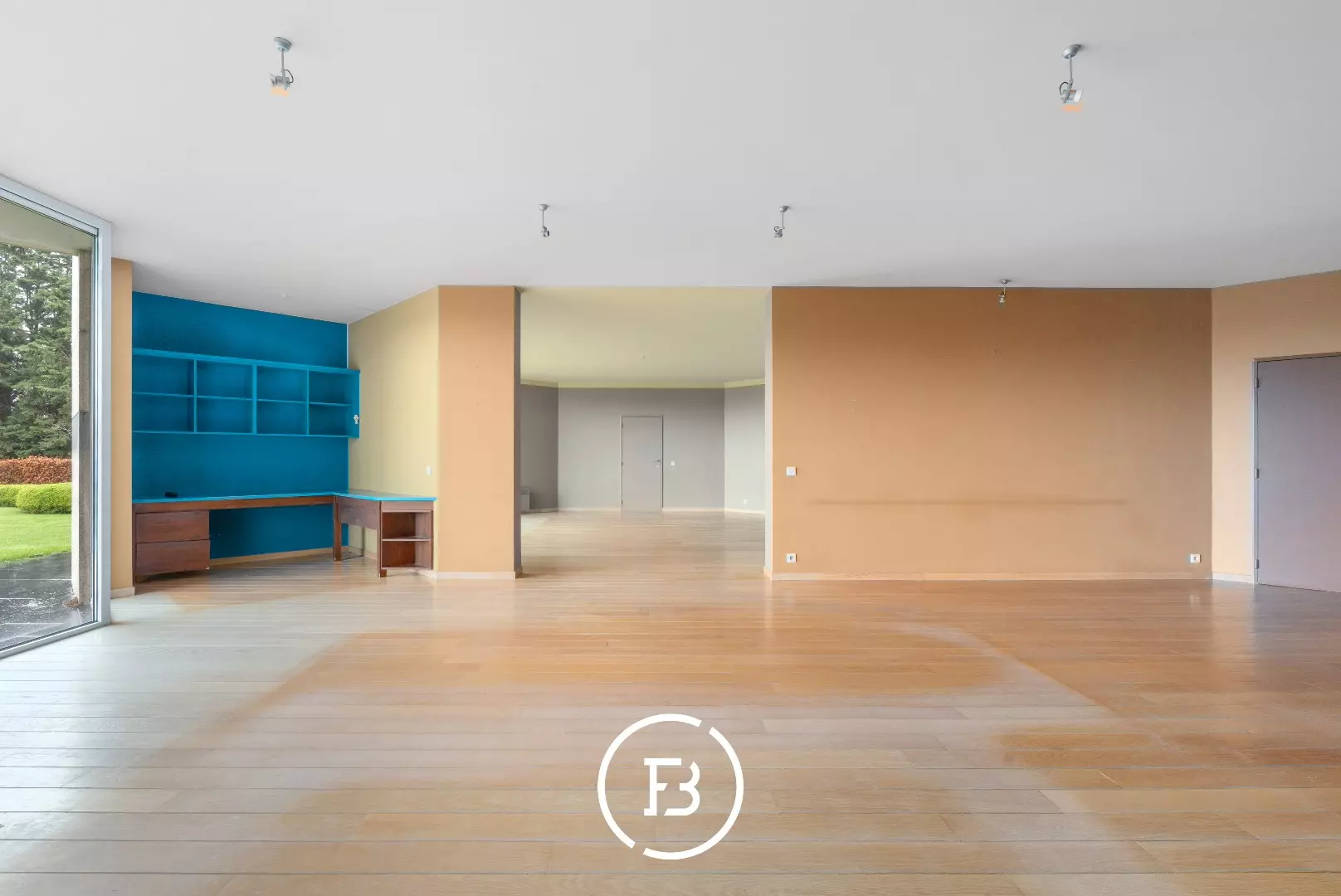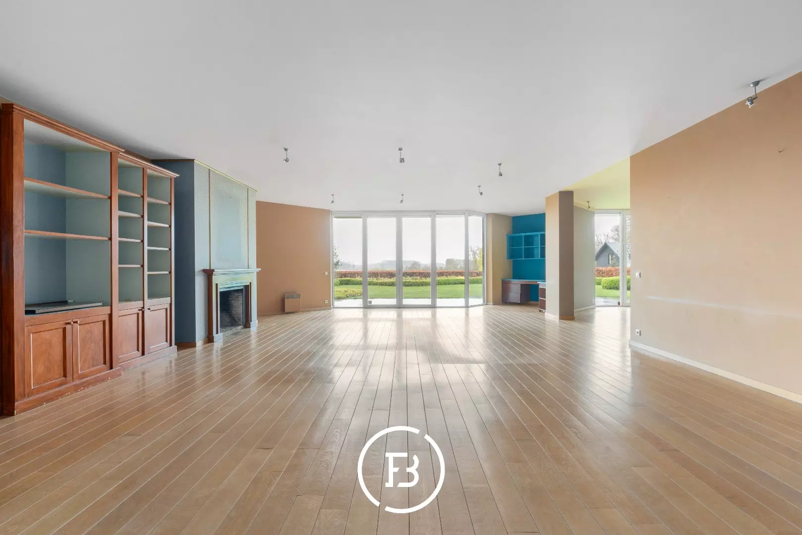 Le spacieux salon avec cheminée bénéficie de beaucoup de lumière naturelle et offre une belle vue sur le jardin privé et la Leie.