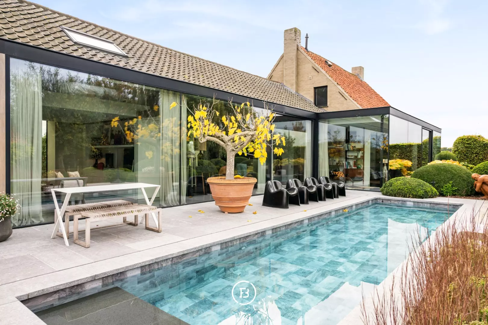 L’extérieur invite à la détente : la superbe piscine avec grande terrasse attenante au séjour et la terrasse couverte de la dépendance, parfaite comme poolhouse, transforment chaque soirée d’été en moment magique. Le jardin paysager, orné de bordures de buis et d’arbres matures, dispose d’un système d’arrosage automatique garantissant une oasis verte permanente et une ambiance de vacances instantanée. Les prairies clôturées avec abris conviennent idéalement aux amateurs d’animaux. Un double carport complète l’ensemble.