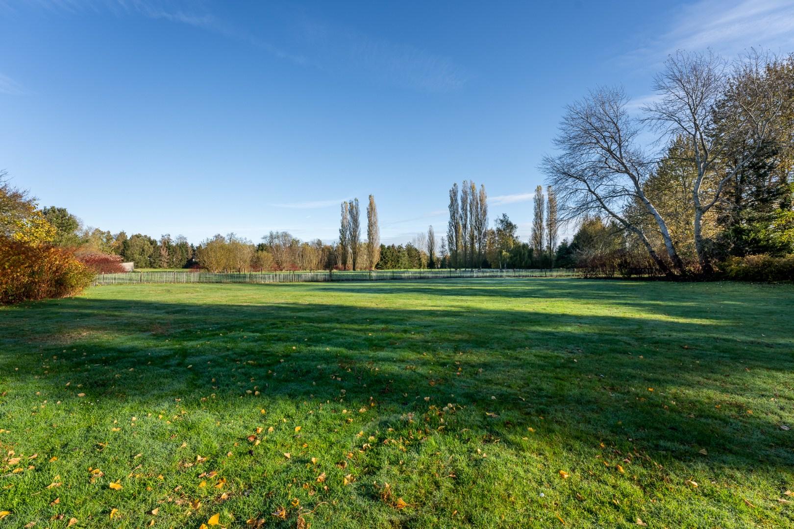 Autour de la propriété s’étend un jardin à l’esprit parc, se fondant harmonieusement dans les prairies environnantes — un cadre qui invite au calme et à l’ouverture. Le stationnement y est aisé, avec une capacité d’environ 100 véhicules, tout en conservant le caractère verdoyant du domaine.