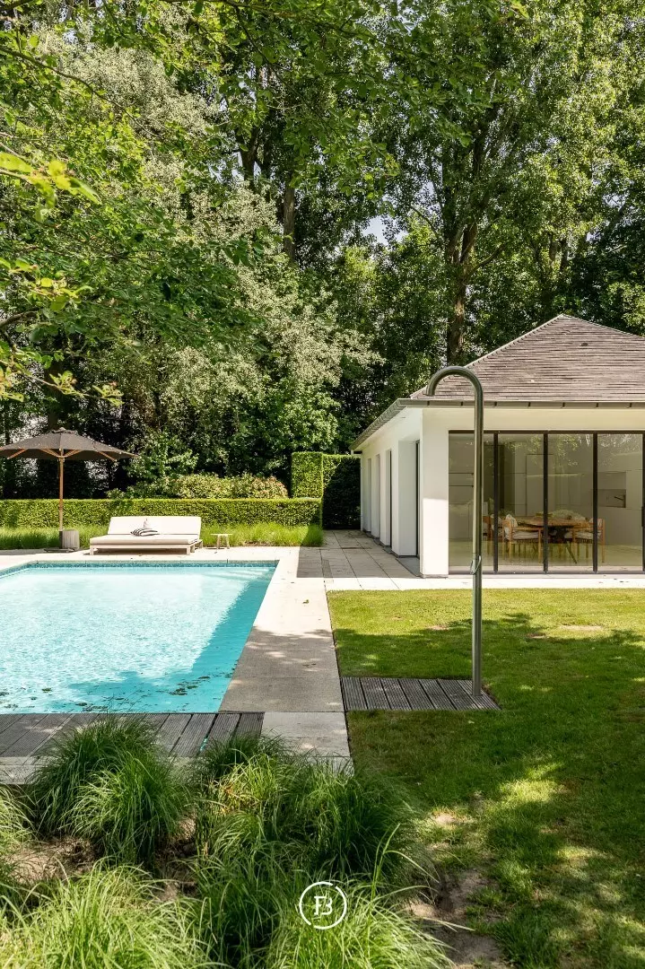 L’extérieur est une véritable oasis de calme et d’intimité, avec plusieurs terrasses ensoleillées, une piscine et un pool house contemporain, aménagé avec un coin lounge, une kitchenette, une douche et de grandes baies vitrées pouvant s’ouvrir entièrement en été pour une vie intérieure-extérieure fluide.