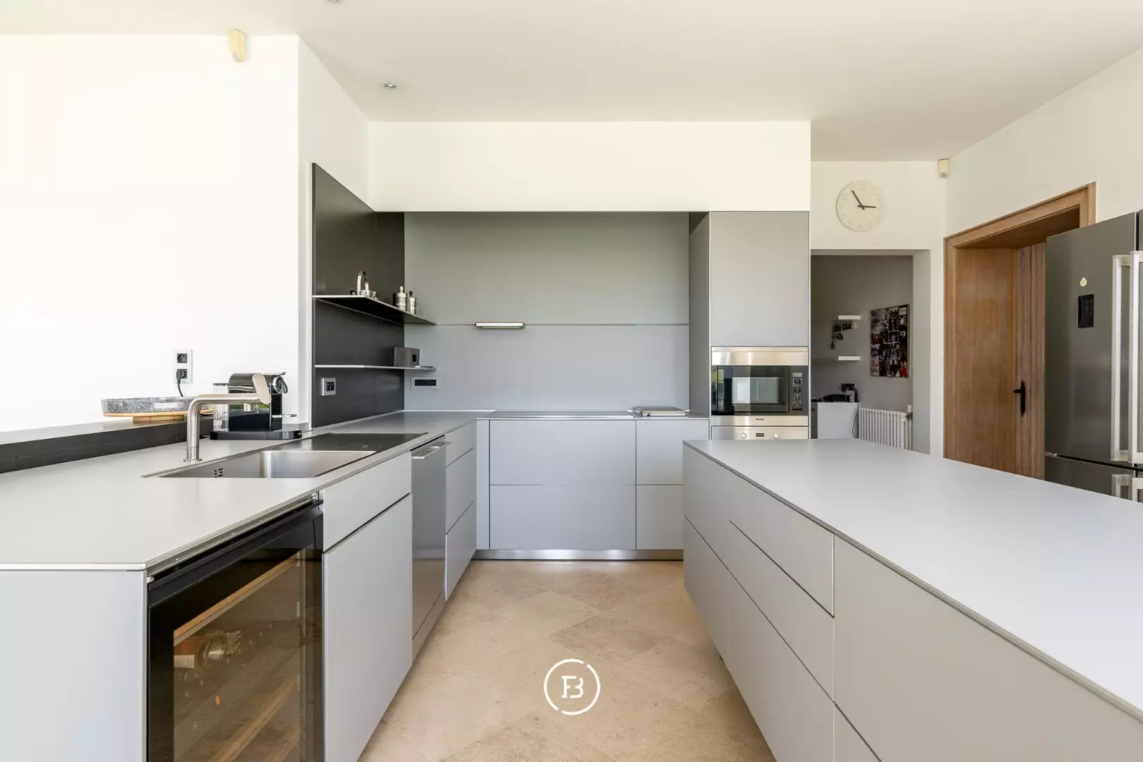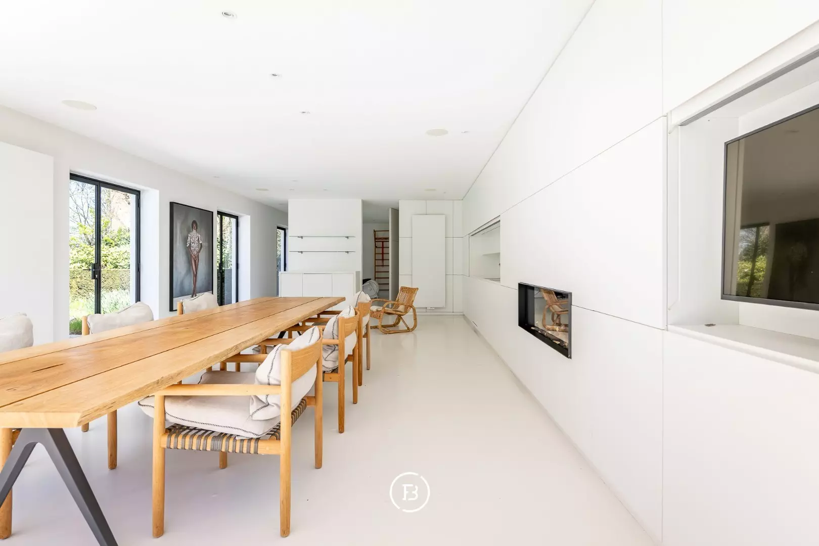 L’allée bordée d’arbres crée immédiatement une ambiance sereine et un sentiment de retour chez soi. À l’intérieur, un vaste hall d’entrée avec vestiaire et toilette invités vous attend. Un cloître, élément architectural distinctif, vous guide à travers la maison. La cuisine ouverte est équipée de matériaux haut de gamme et donne sur le jardin – un cadre idéal pour un petit-déjeuner paisible. Elle est attenante à un spacieux séjour (100 m²) avec cheminée, baigné de lumière naturelle, où règnent confort et convivialité.