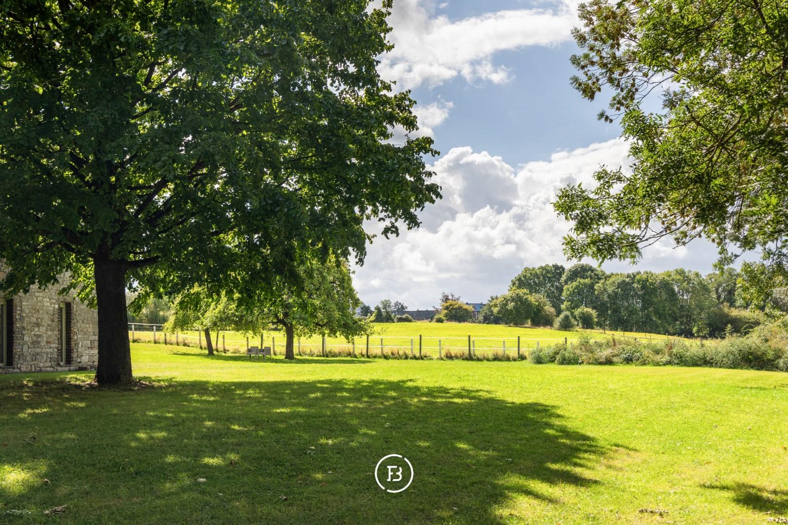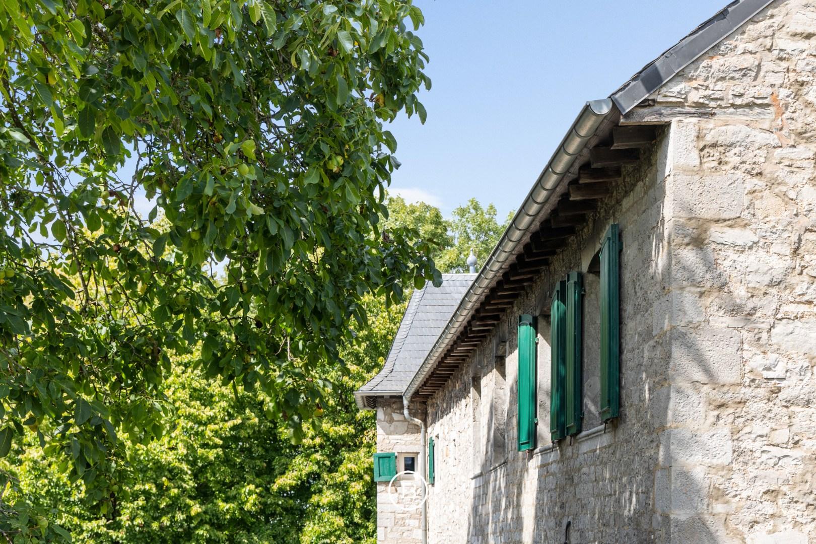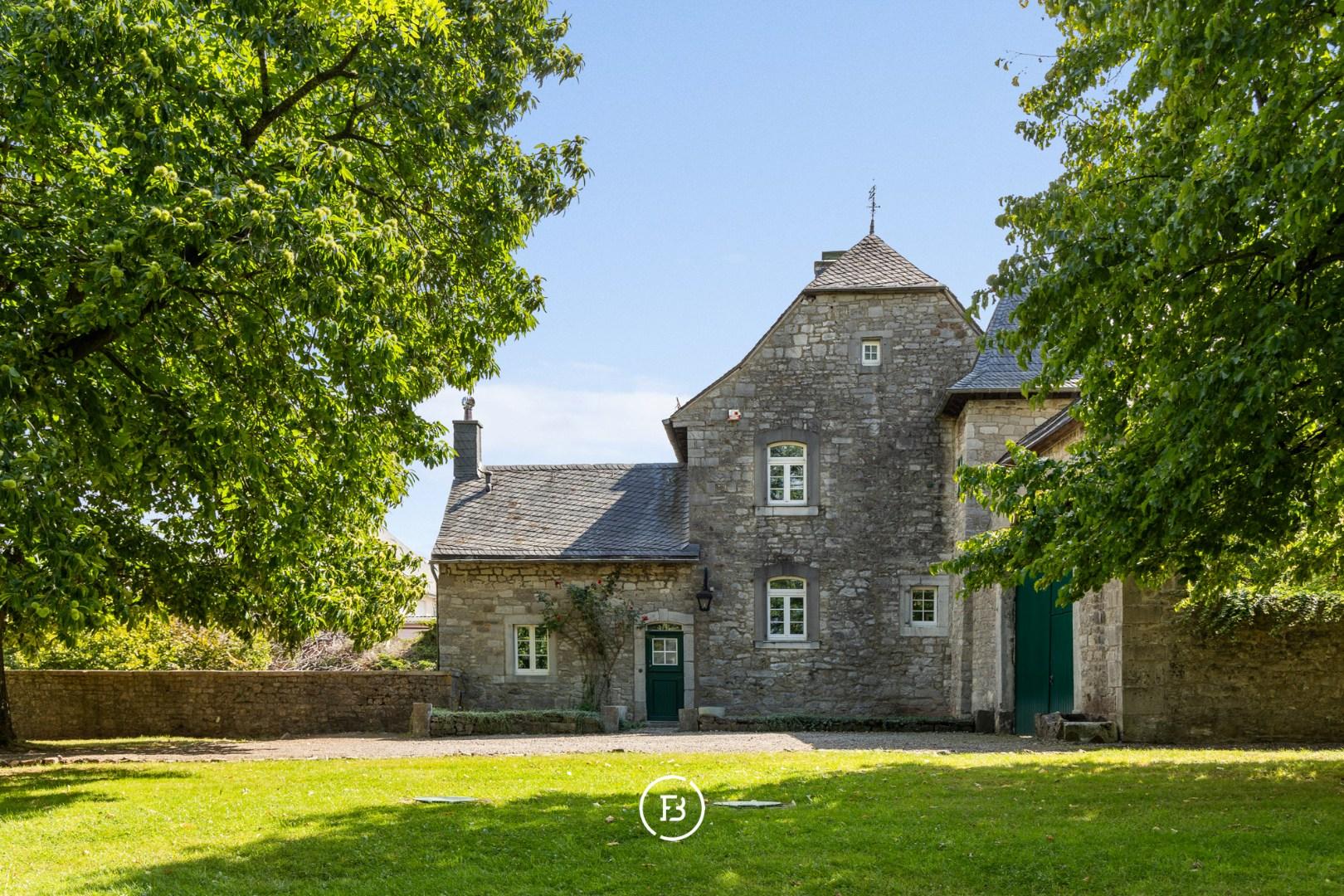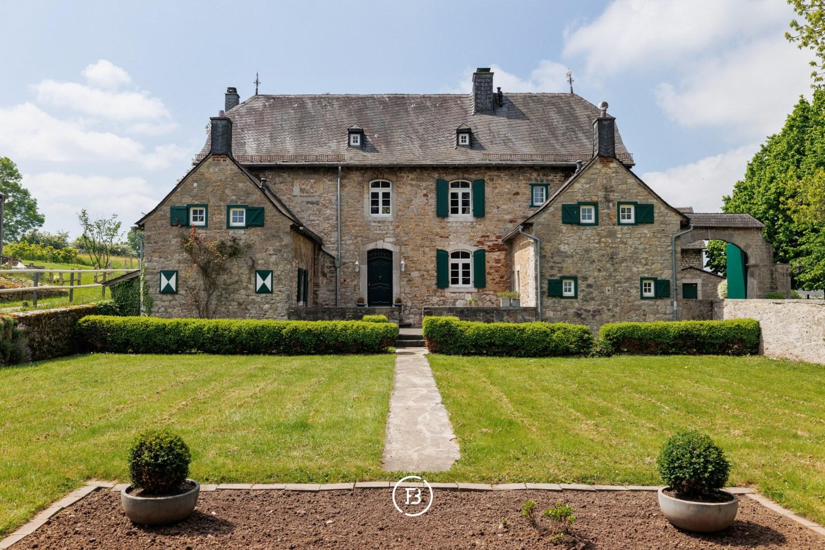 Situated in the beautiful Raeren, just a few minutes from Eupen and Aachen, we find 'Haus Bergscheid', a magnificent historic residence entirely built of blue stone. The house was recently completely renovated to contemporary standards while preserving its charming authenticity. The main residence consists of a spacious entrance hall, separate office, living room with fireplace, and a separate TV corner. In the other wing of the house, we find the spacious dining area with access to the kitchen and a large cellar serving as a laundry room and storage. Upstairs, there are three spacious bedrooms with two bathrooms, one of which is a master with an ensuite bathroom. The adjacent outbuilding currently serves as a summer house, with another living room, kitchen, and two bedrooms with a separate bathroom. The house is surrounded by its beautiful garden, currently equipped for the two horses, each with their own stable. A magnificent residence with magnificent views where it is delightful to enjoy nature.