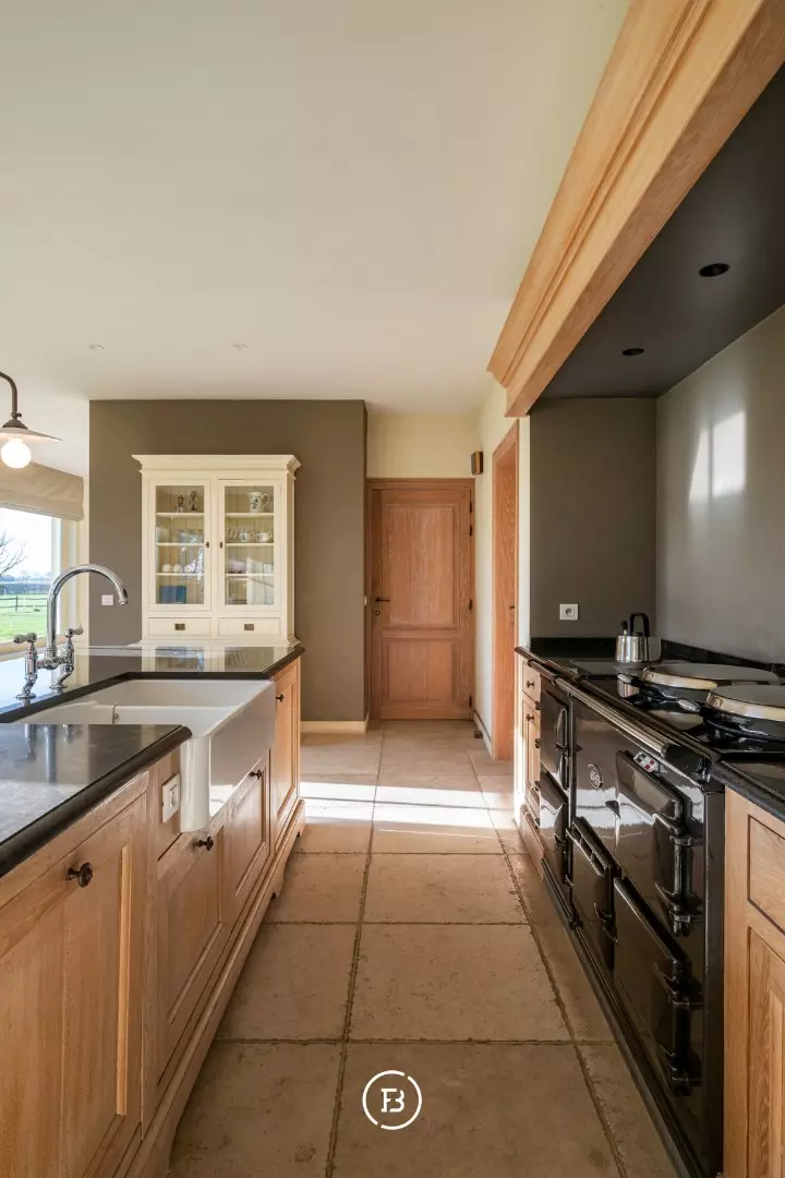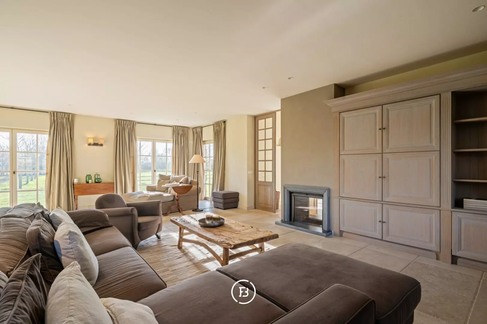 Le hall d'entrée spacieux avec vestiaire et toilettes invités mène à un séjour chaleureux avec salle à manger, aménagé avec du mobilier sur mesure élégant et un poêle à bois convivial. Il donne accès à l'orangerie/bibliothèque, où vous profitez de vues imprenables. L'espace de vie est adjacent à la cuisine campagnarde équipée d’un four AGA. Toutes ces pièces lumineuses s’ouvrent harmonieusement sur le jardin et les environs. À ce niveau se trouvent également un grand bureau avec poêle à bois, une buanderie pratique et un vaste garage intégré. À l’étage, vous découvrirez une suite parentale avec dressing, trois grandes chambres, un dressing séparé et trois salles de bains.