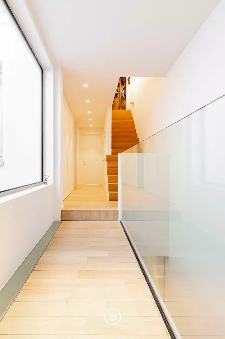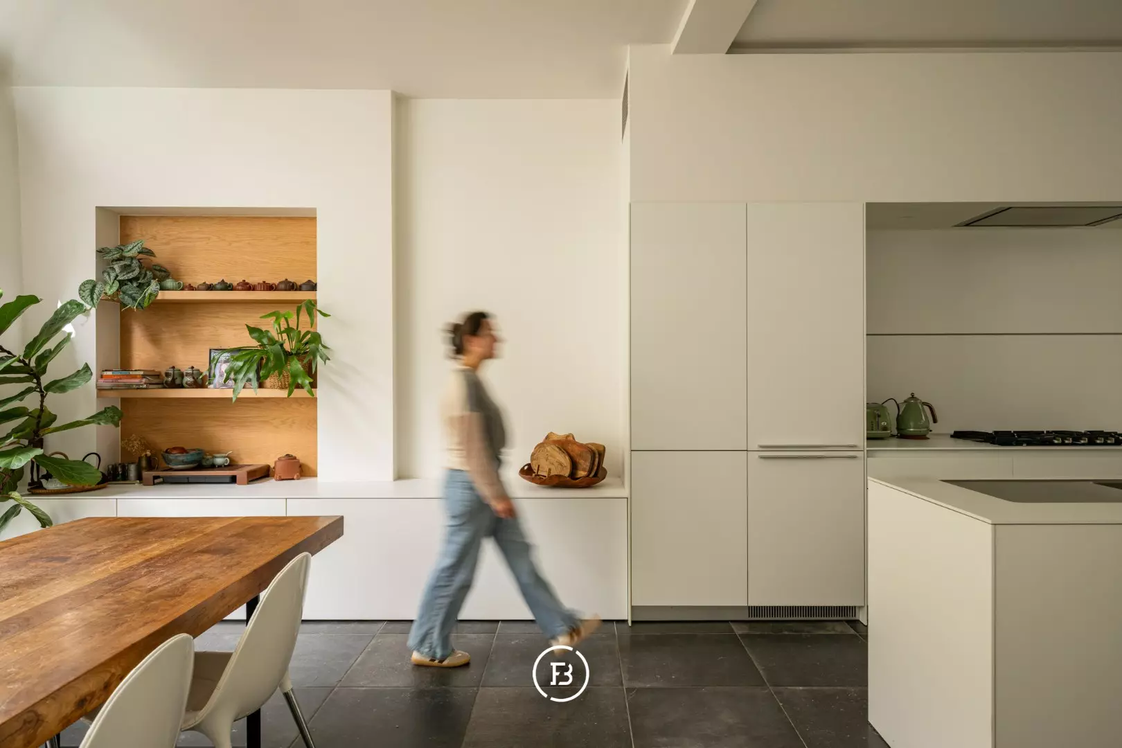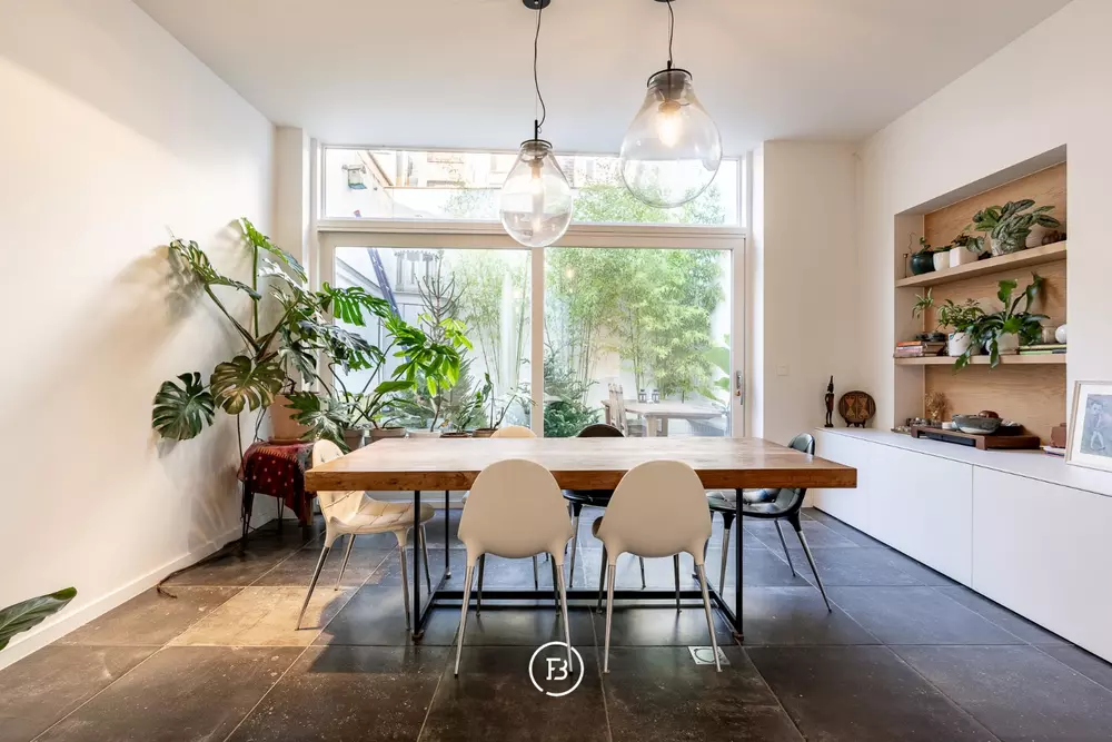 En entrant, vous découvrirez un hall d'entrée spacieux avec vestiaire et toilettes pour invités. Le salon lumineux est doté d'un parquet haut de gamme et d'une cheminée à gaz moderne. Un patio central apporte un supplément de lumière et crée une séparation subtile avec la cuisine entièrement équipée, qui dispose d'un coin repas spacieux et d'une vue magnifique sur le jardin urbain apaisant.
