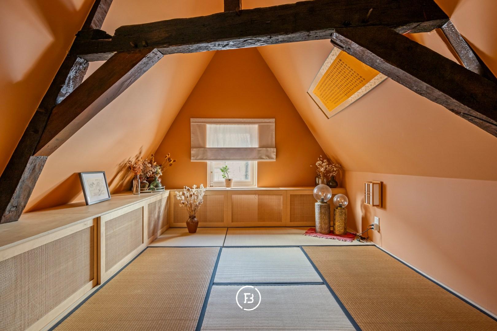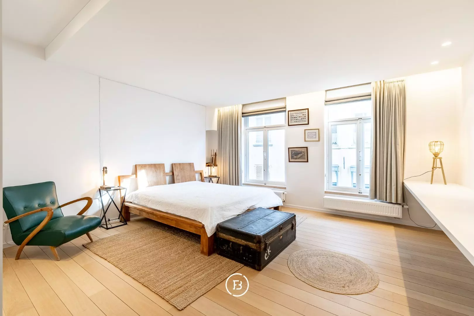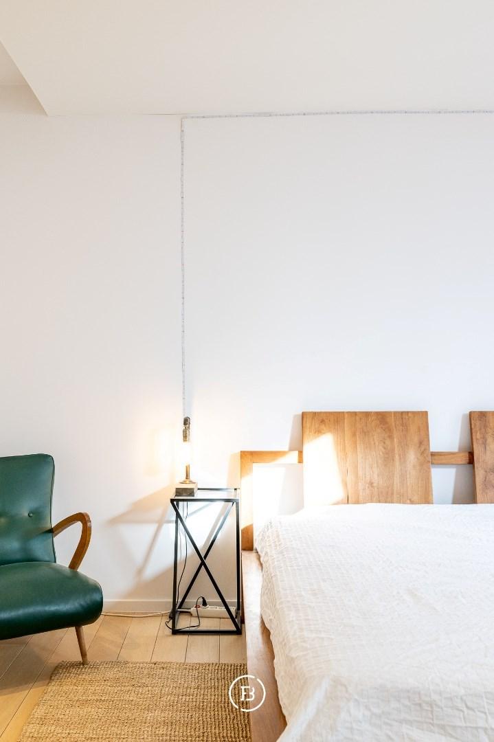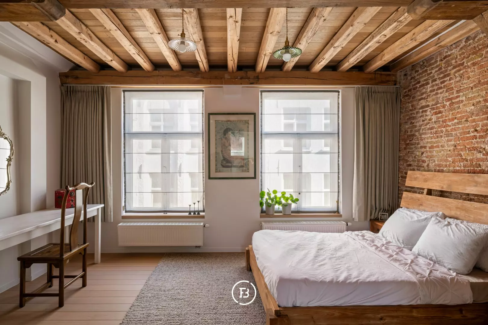 Le dernier étage est accessible par deux escaliers séparés. À l'arrière, un escalier mène à une chambre d'amis confortable, tandis qu'à l'avant, un deuxième escalier donne accès à une chambre spacieuse et charmante avec mezzanine et un espace bureau ouvert avec placards intégrés.