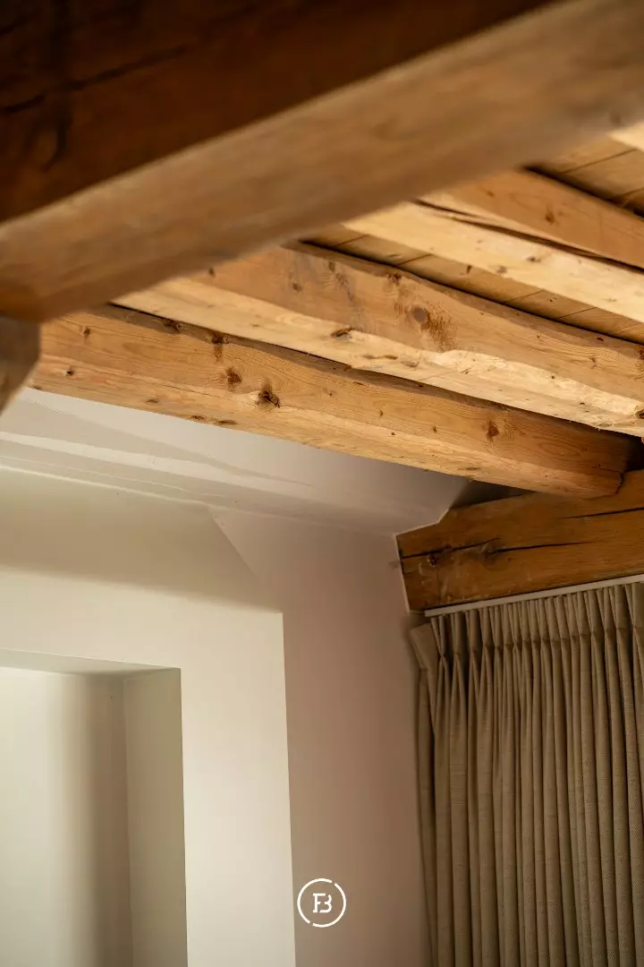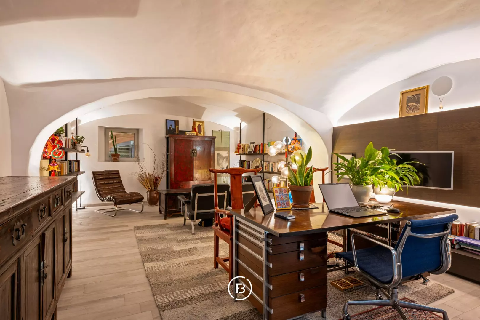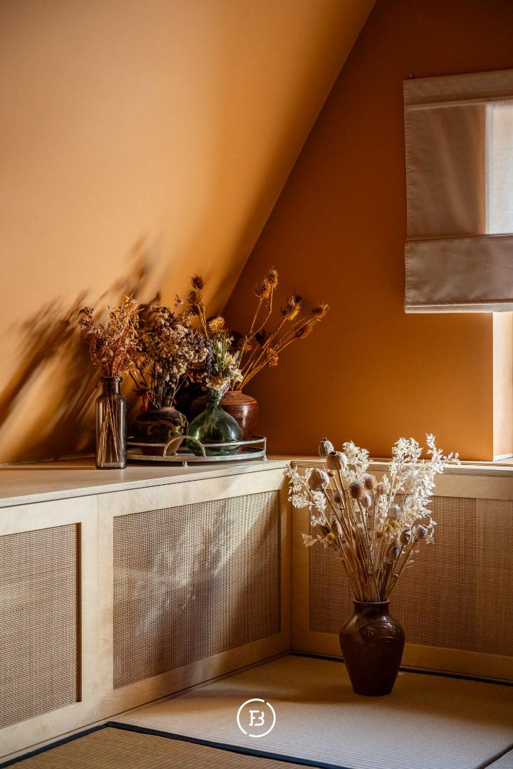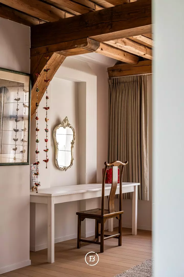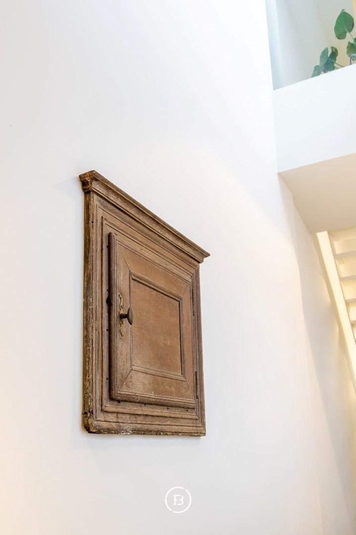 Le dernier étage est accessible par deux escaliers séparés. À l'arrière, un escalier mène à une chambre d'amis confortable, tandis qu'à l'avant, un deuxième escalier donne accès à une chambre spacieuse et charmante avec mezzanine et un espace bureau ouvert avec placards intégrés.