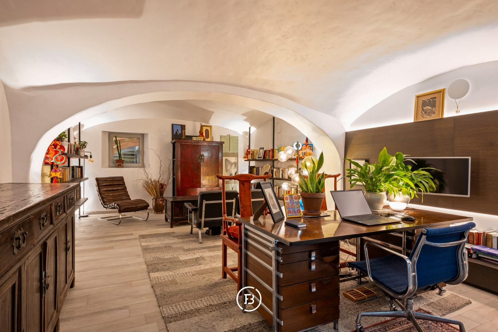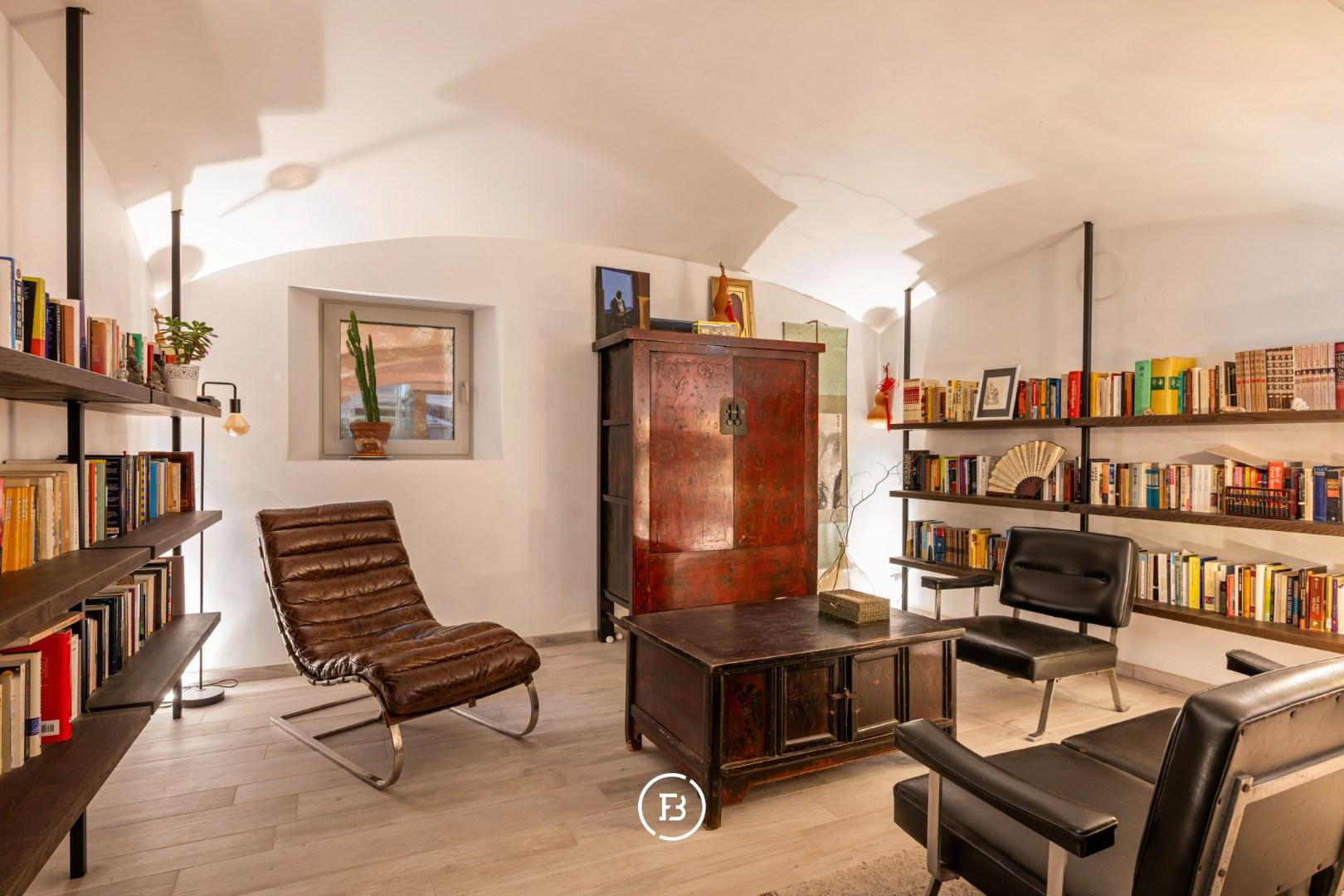Un escalier ouvert mène à un espace de vie (cave) élégamment aménagé, avec chauffage au sol et voûtes authentiques, qui donne sur la terrasse couverte exclusive au bord de l'eau. Vous y trouverez également des toilettes pour invités, un grand débarras, une buanderie et un local à vélos pratique.