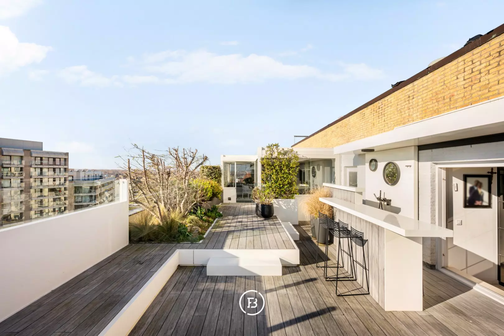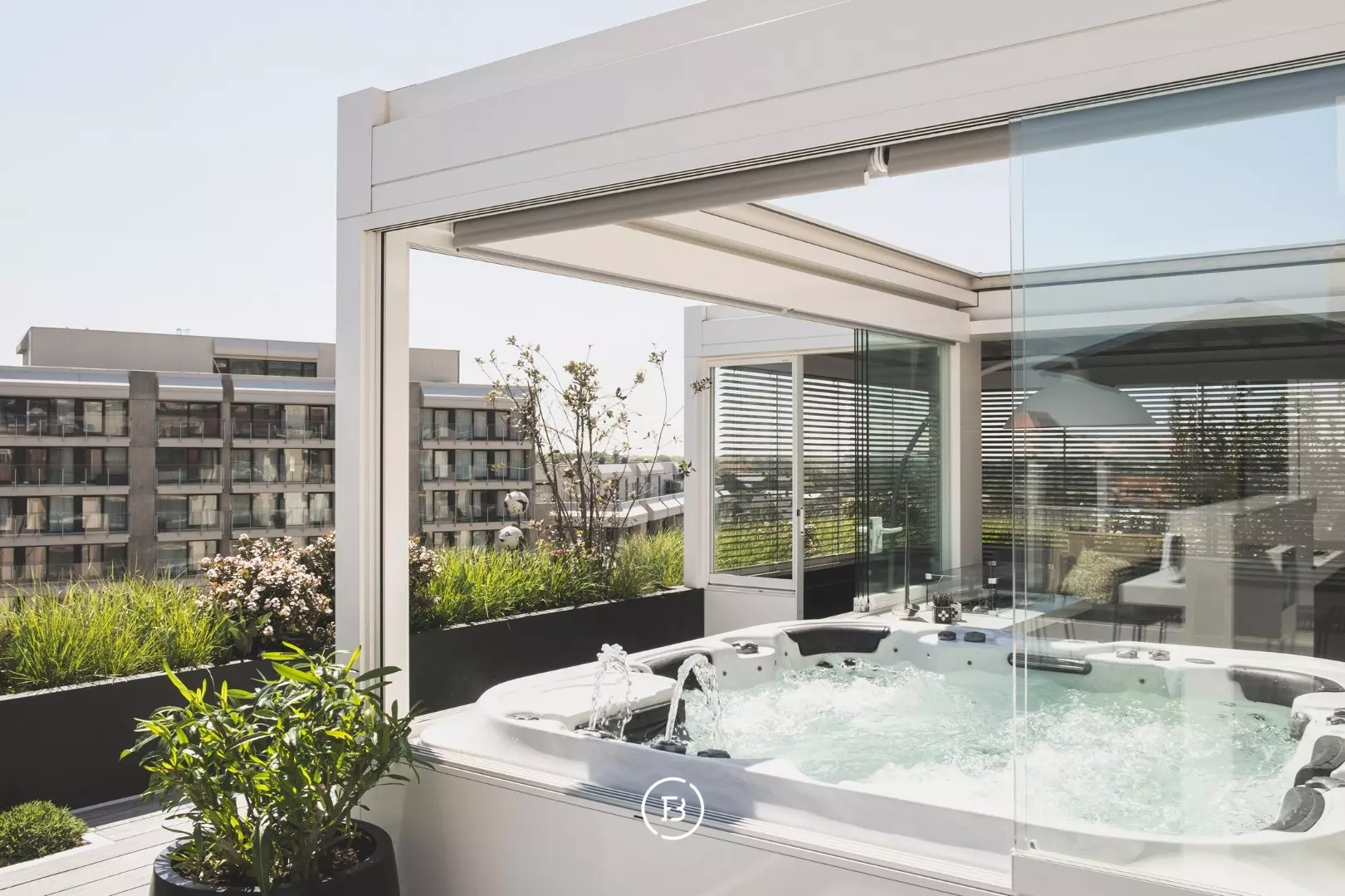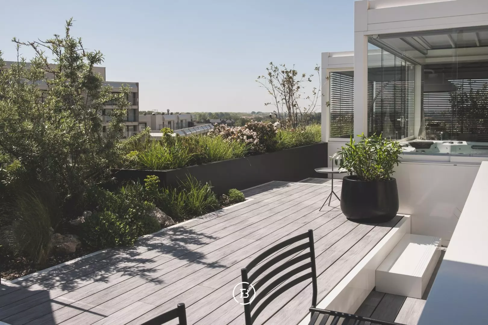 Grâce à sa bonne orientation, vous profitez du soleil toute la journée. La grande terrasse est équipée d’un jacuzzi intégré et d’un bar, parfait pour se détendre ou partager des moments conviviaux.
