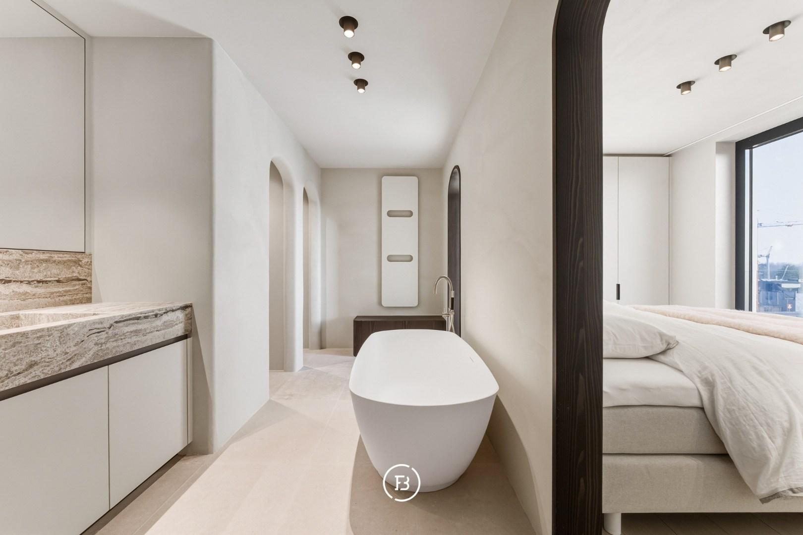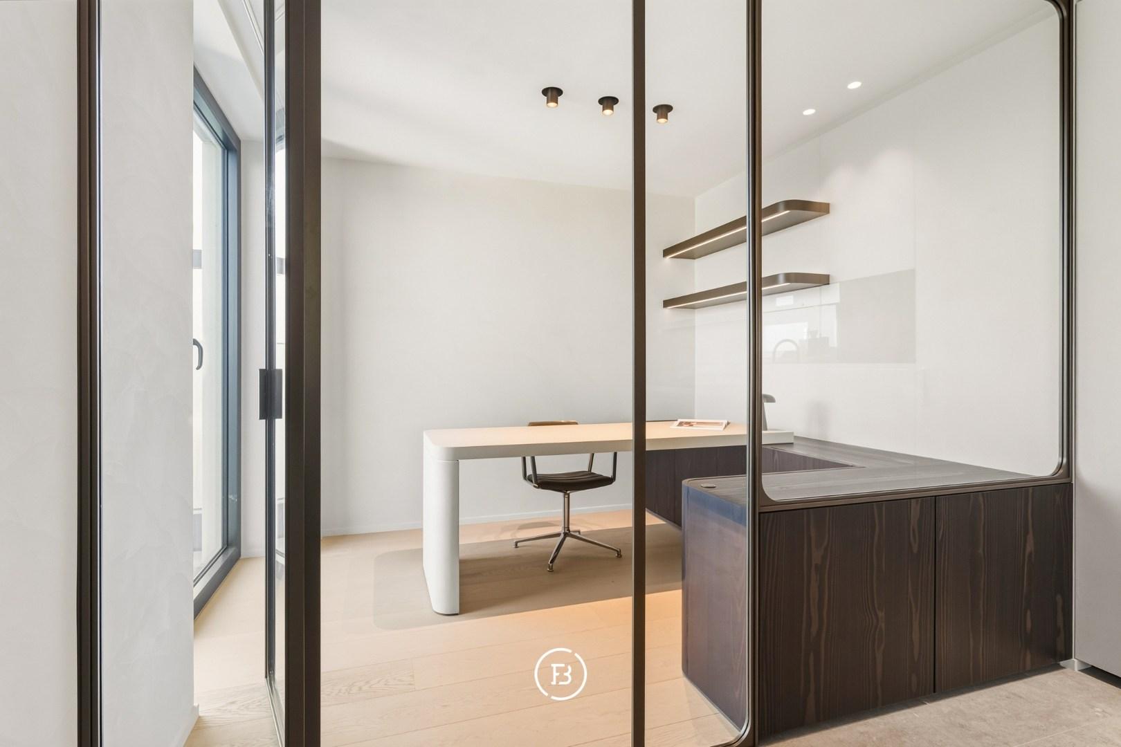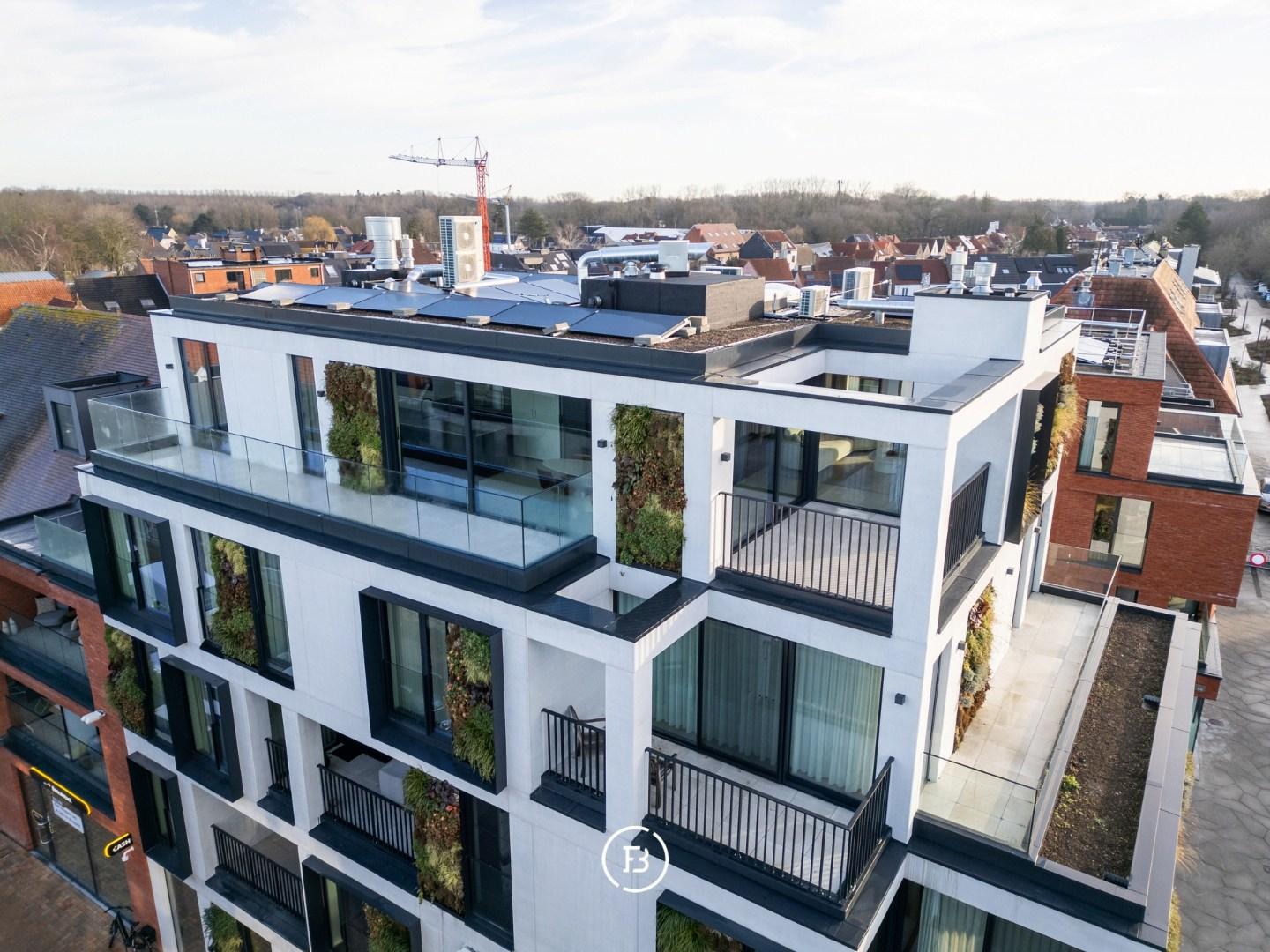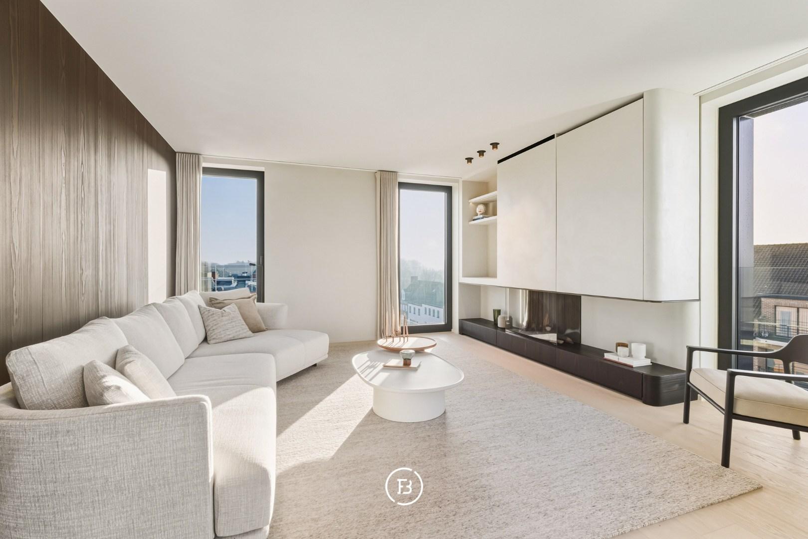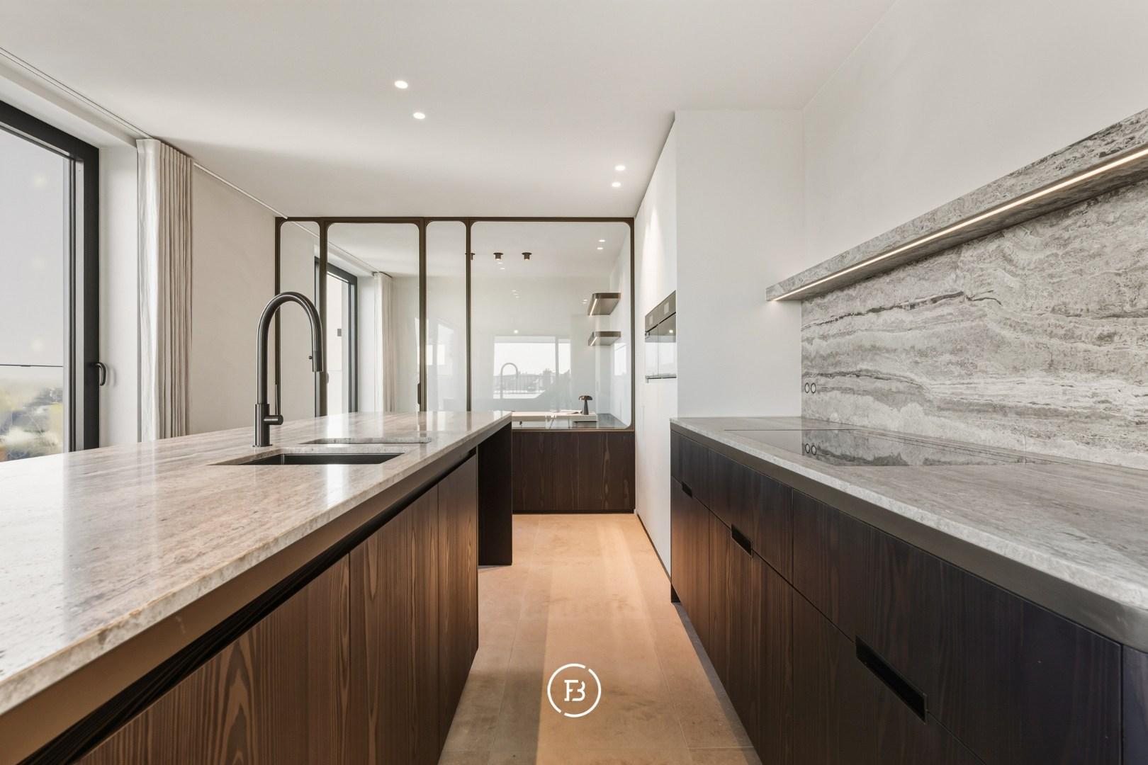 Les finitions haut de gamme incluent domotique Duotecno, luminaires Prado, pierre naturelle Vinckier, foyer Metalfire, mobilier et cuisine sur mesure Devriese et habillage de fenêtres Tyyli. Reprise du mobilier possible, rendant le penthouse quasi clé en main.