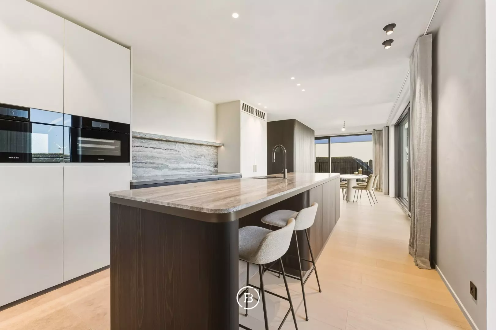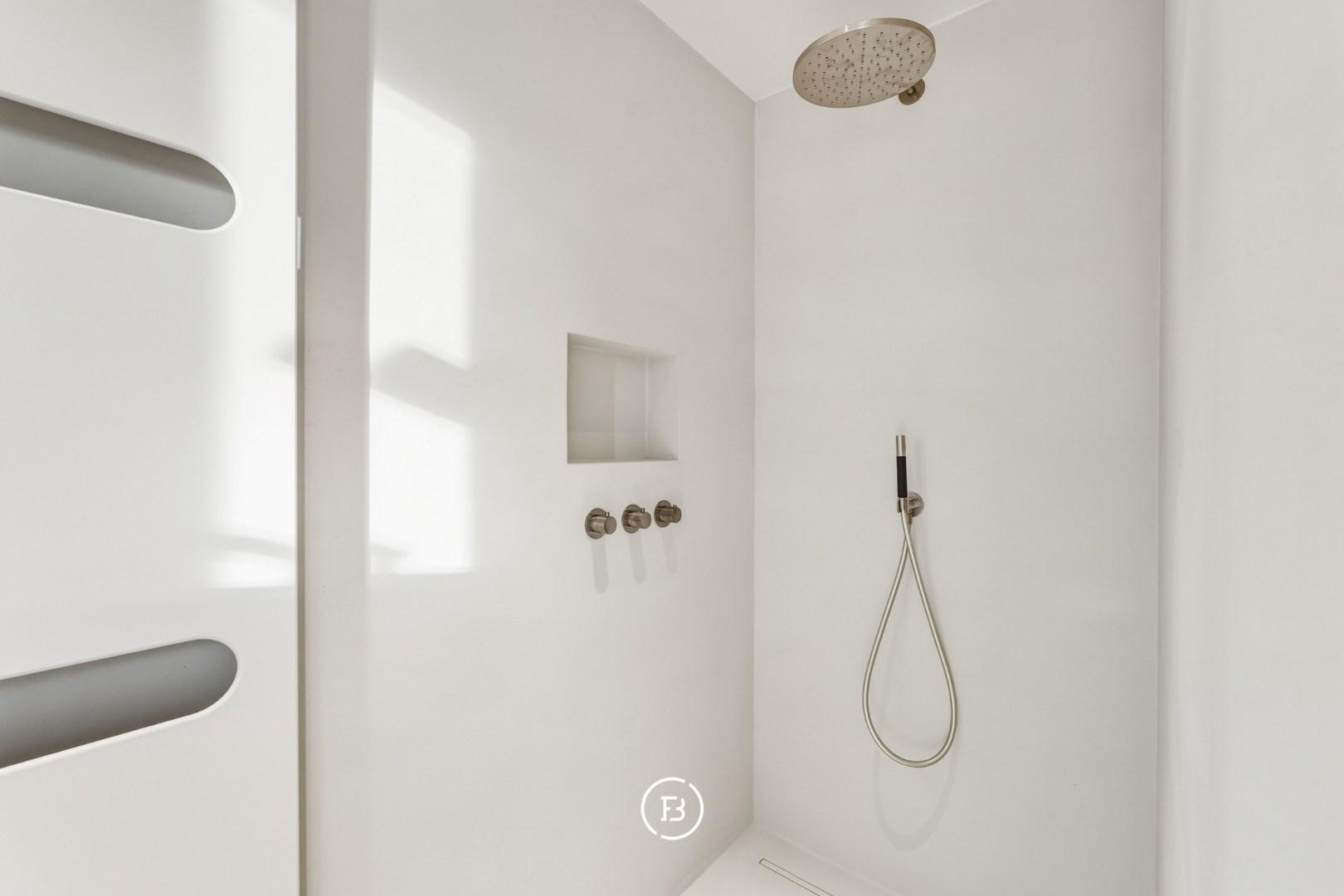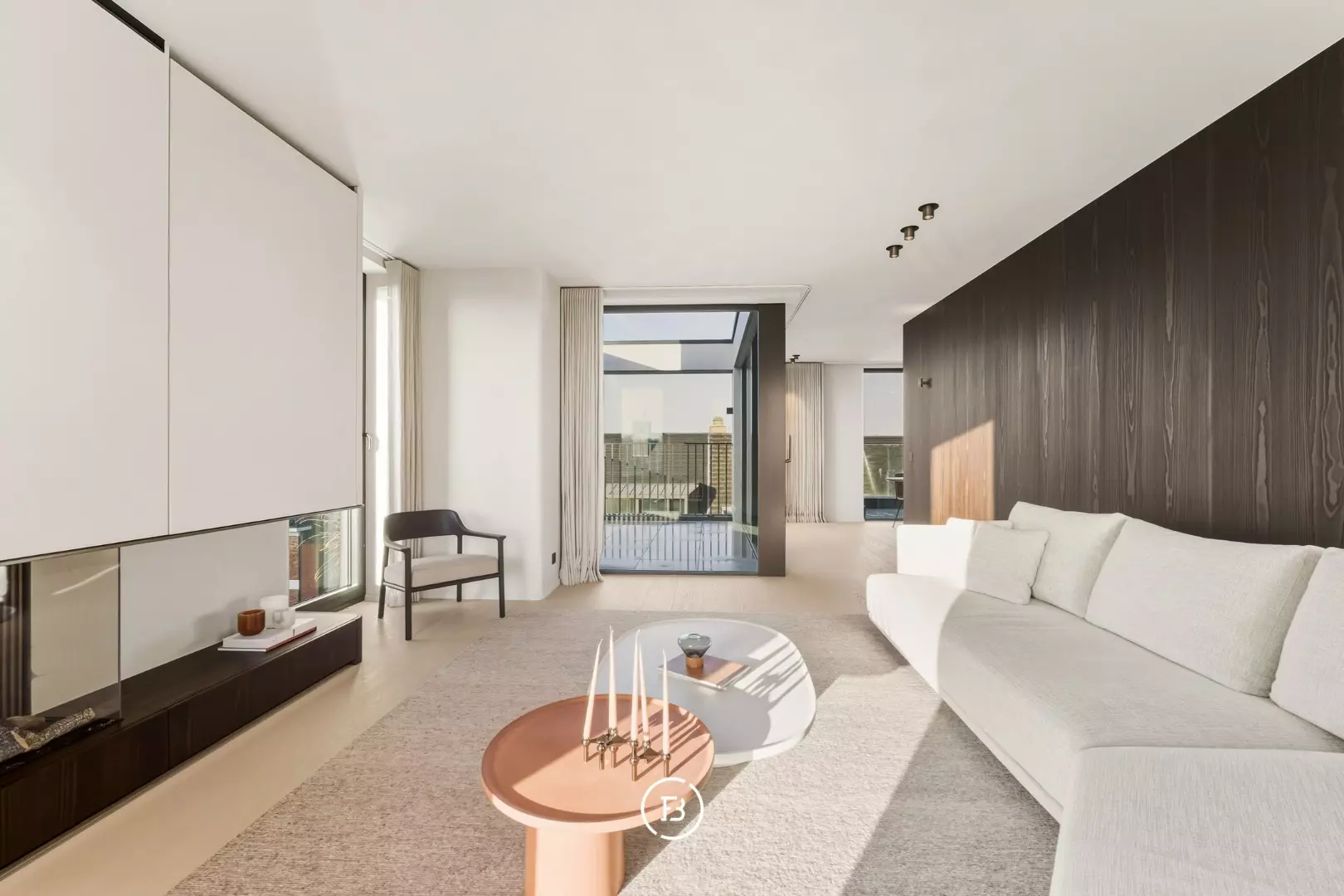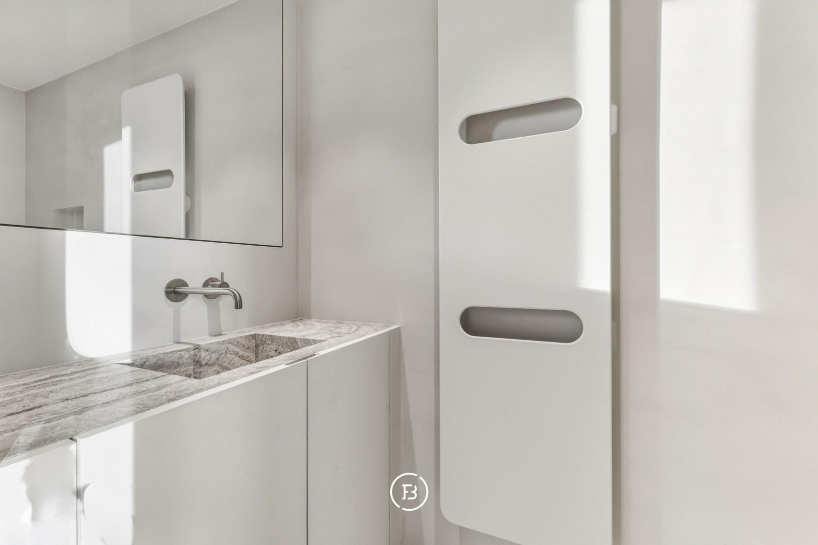 Les finitions haut de gamme incluent domotique Duotecno, luminaires Prado, pierre naturelle Vinckier, foyer Metalfire, mobilier et cuisine sur mesure Devriese et habillage de fenêtres Tyyli. Reprise du mobilier possible, rendant le penthouse quasi clé en main.