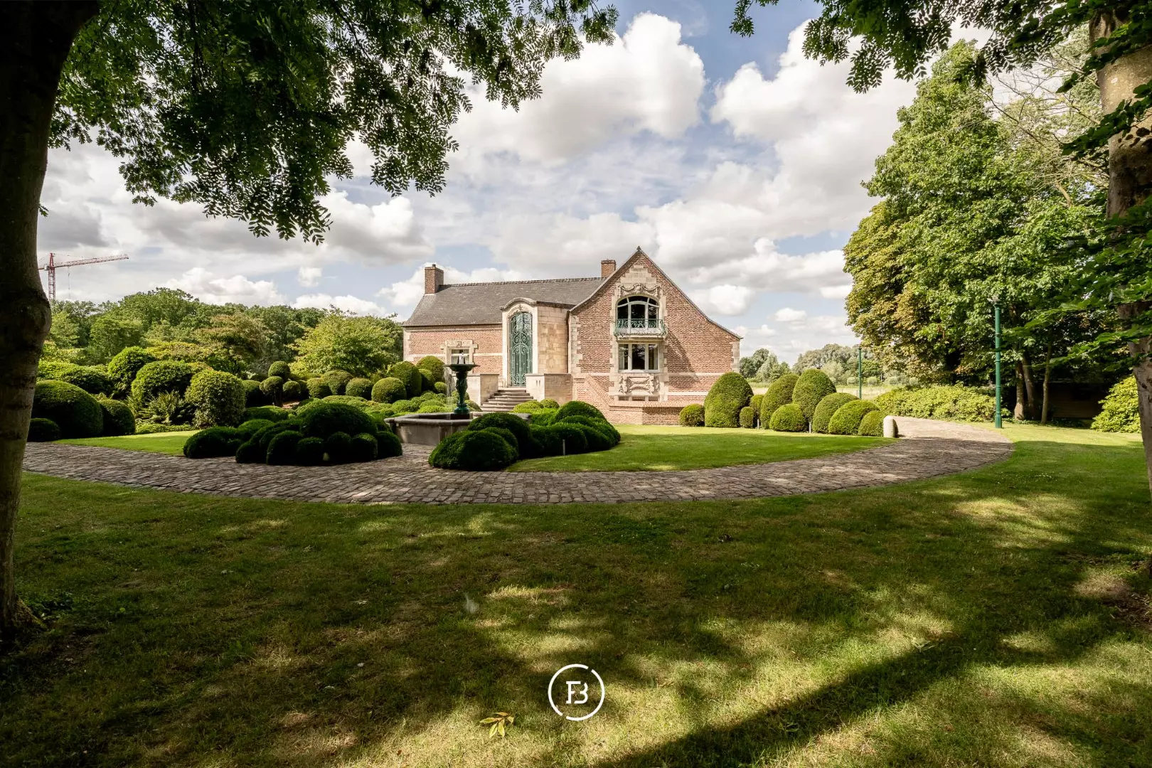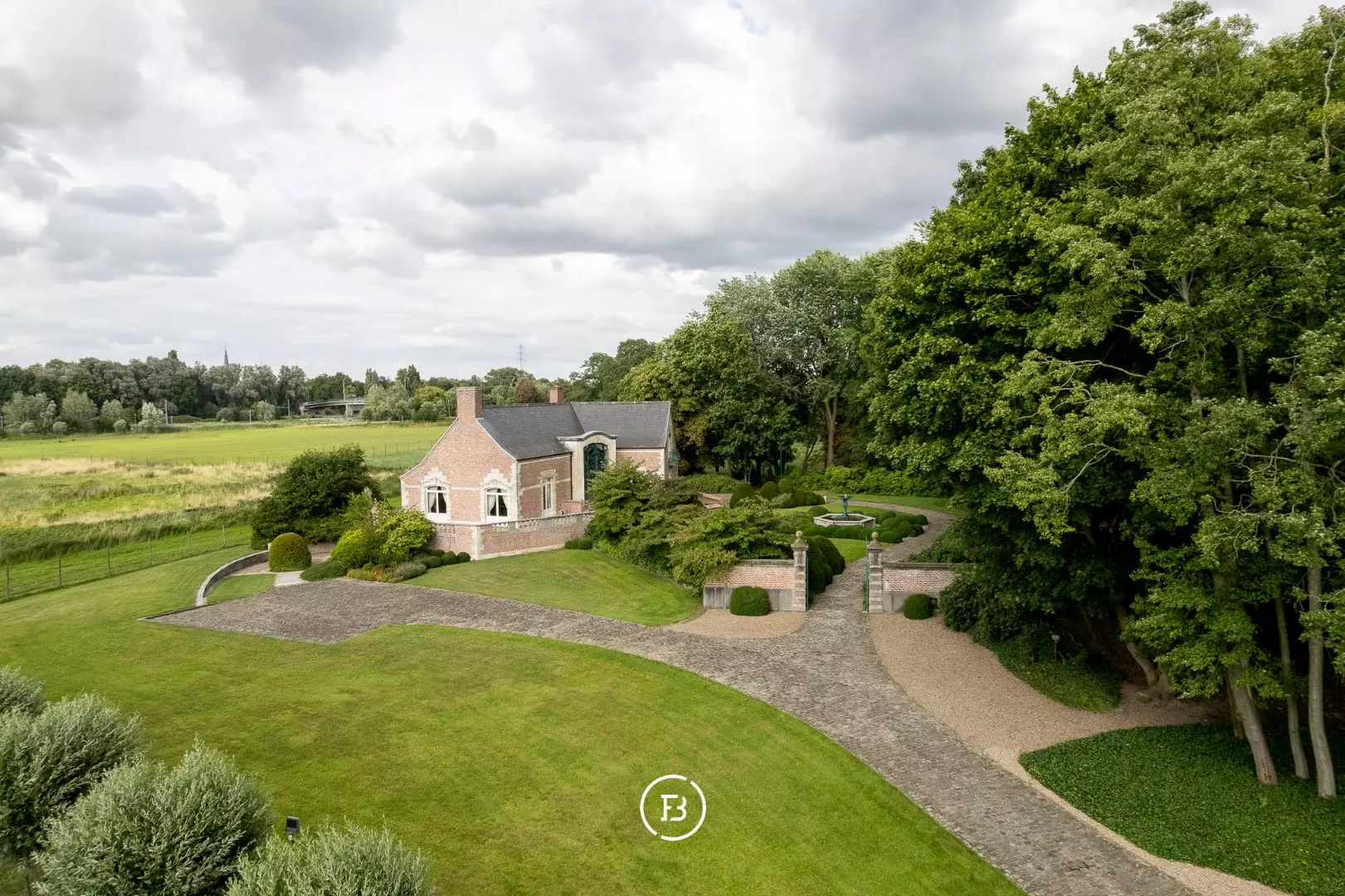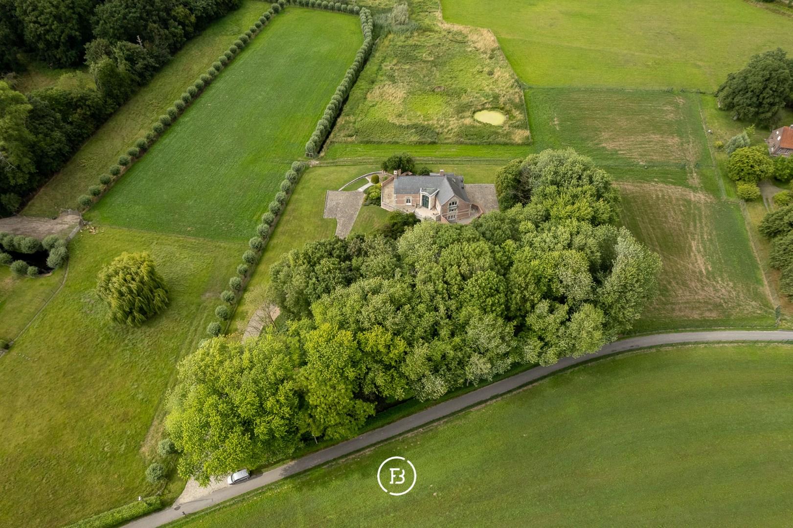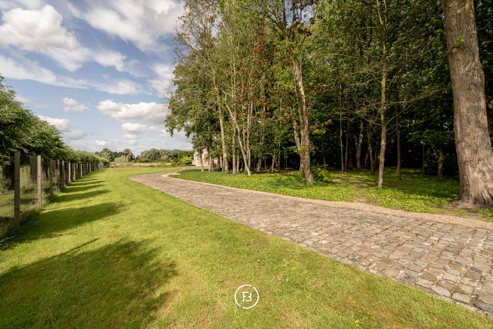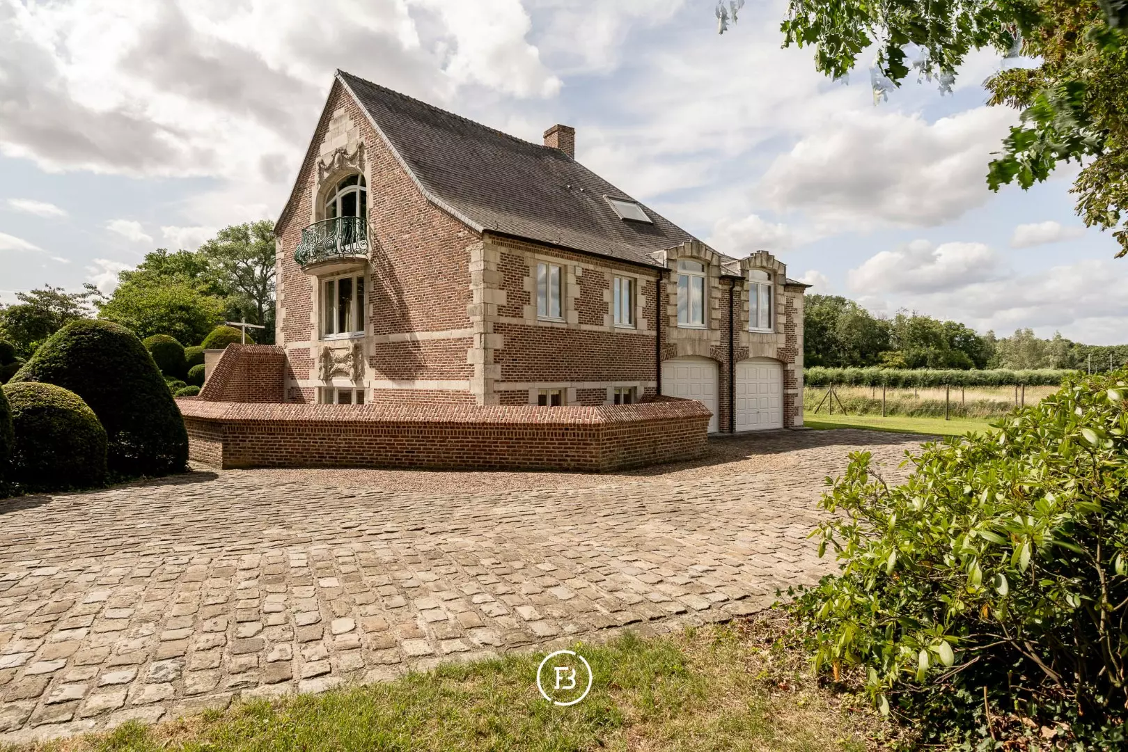 Située dans un environnement verdoyant et paisible, à deux pas du centre d'Izegem, cette villa de caractère a été conçue par Marcel Raymakers de Queen of the South. La propriété est discrètement nichée en retrait, accessible via une charmante allée pavée, et offre une vue imprenable sur les prairies environnantes et la forêt du Château Blauwhuis.