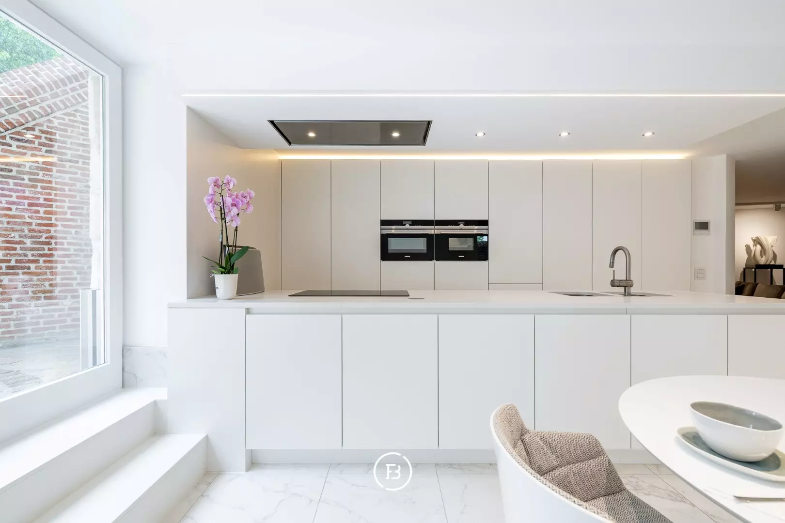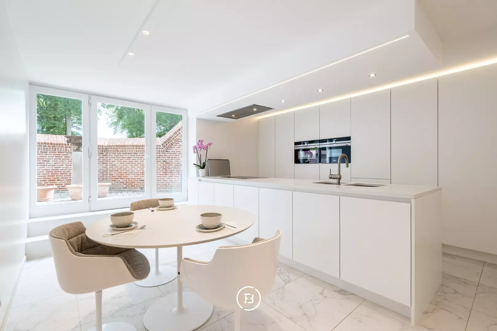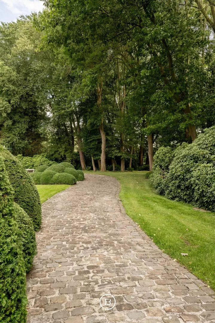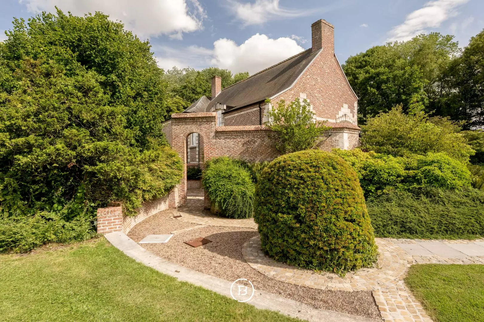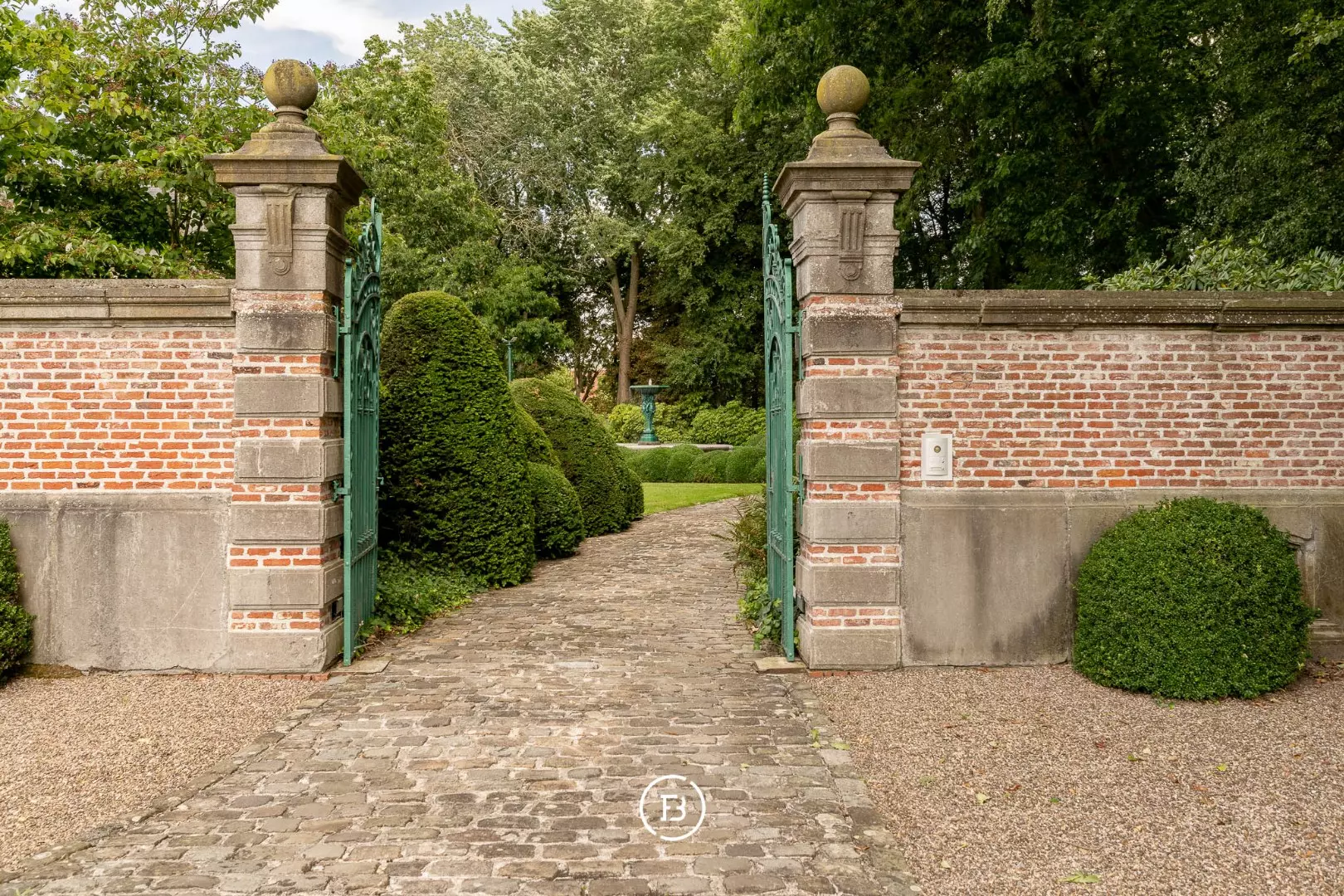 Située dans un environnement verdoyant et paisible, à deux pas du centre d'Izegem, cette villa de caractère a été conçue par Marcel Raymakers de Queen of the South. La propriété est discrètement nichée en retrait, accessible via une charmante allée pavée, et offre une vue imprenable sur les prairies environnantes et la forêt du Château Blauwhuis.