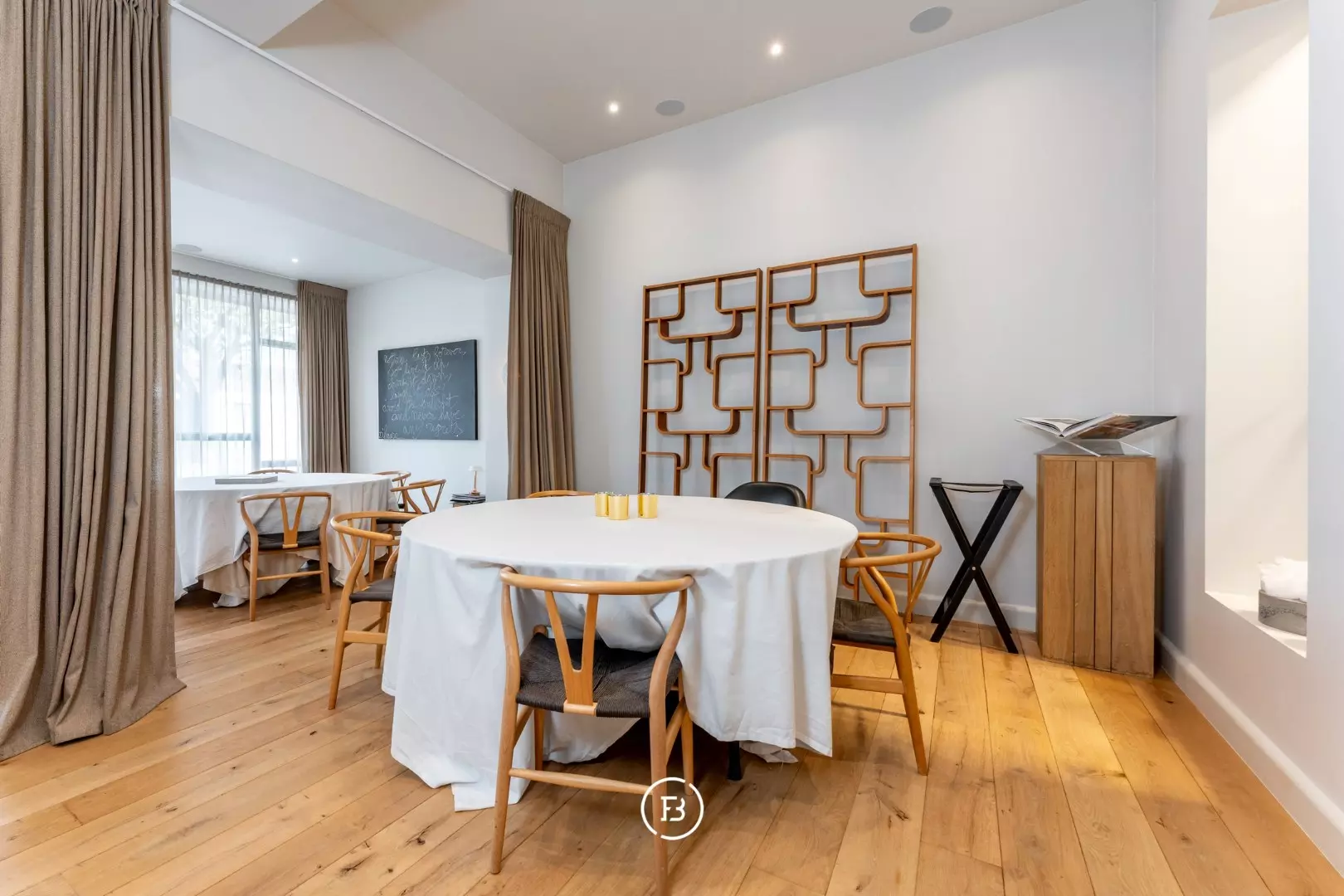 À l'arrivée au rez-de-chaussée, vous êtes accueilli par un espace chaleureux et lumineux. La finition élégante et les matériaux de haute qualité confèrent une allure luxueuse. À l'arrière se trouve un salon spacieux et une cuisine, actuellement aménagée en cuisine professionnelle. Les photos sont à titre d'illustration des possibilités. Les grandes baies vitrées offrent une luminosité plus que suffisante.