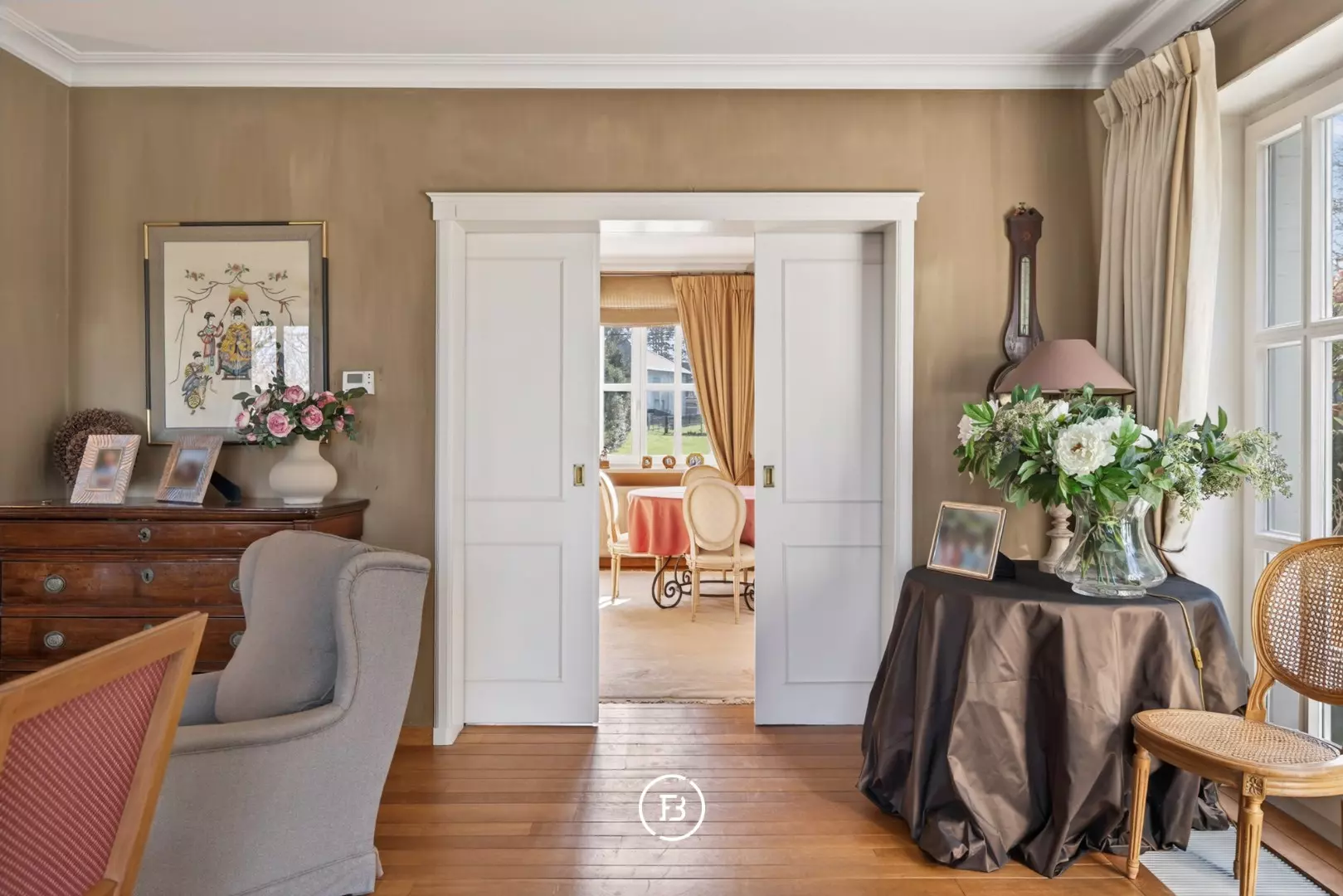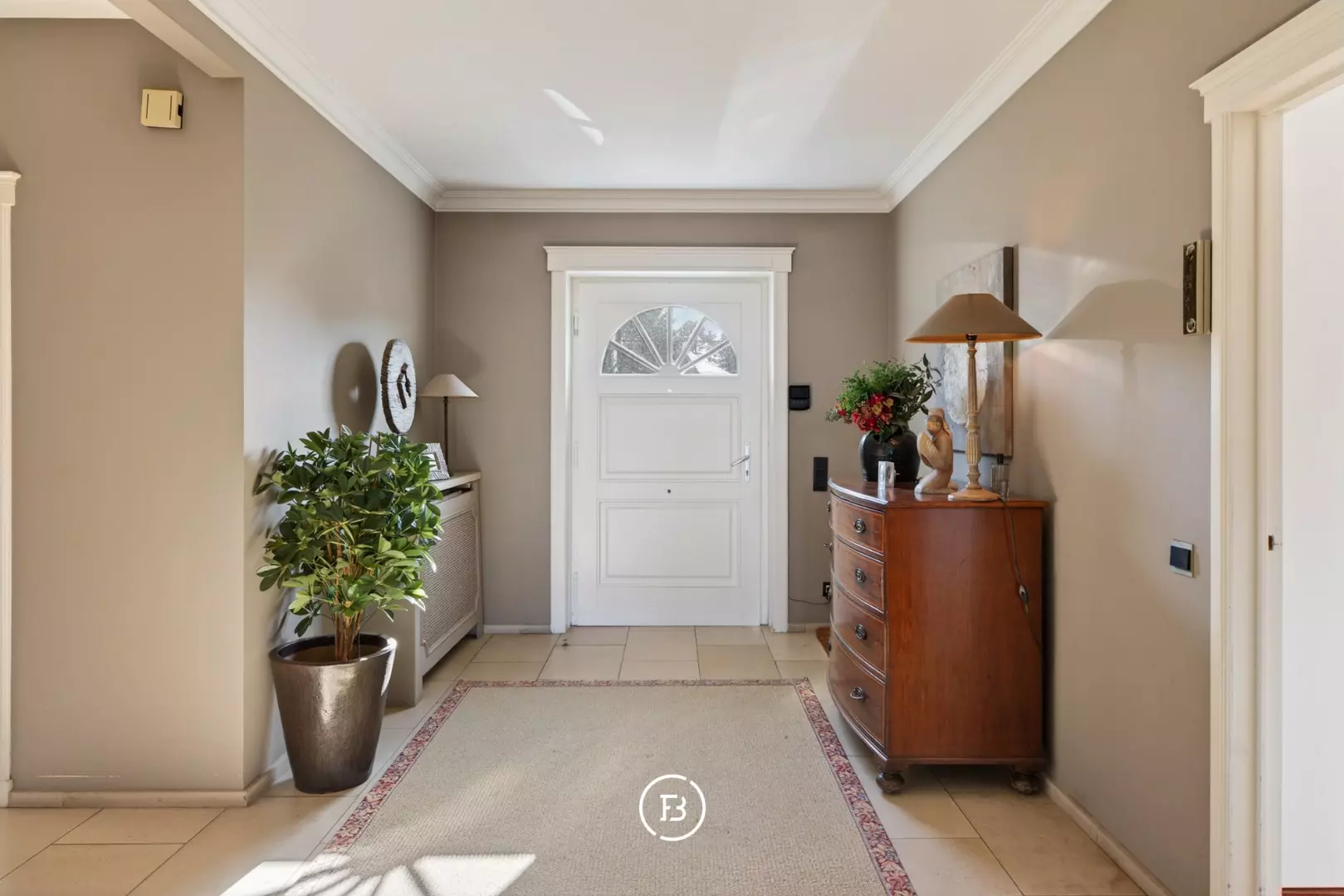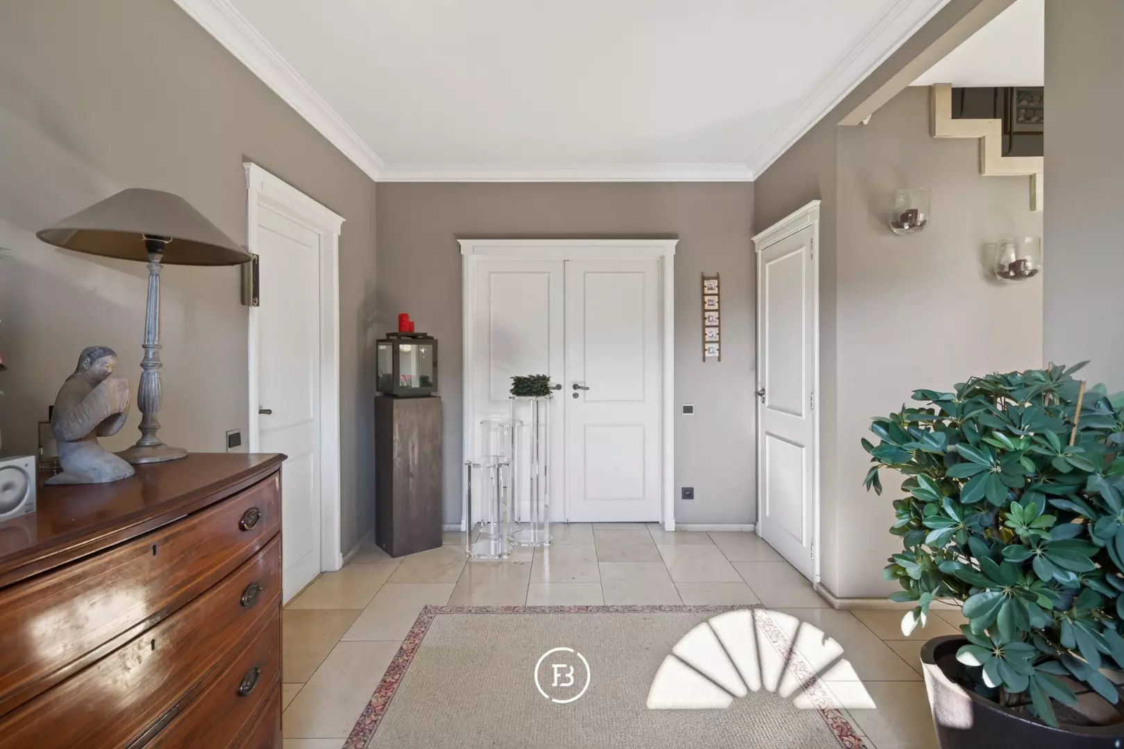 Hall d’entrée avec toilette invités et vestiaire, suivi d’un vaste espace de vie avec un salon séparé. Depuis le séjour, vous accédez à la salle à manger qui se prolonge directement vers la cuisine. Le séjour et la salle à manger donnent accès à la terrasse.