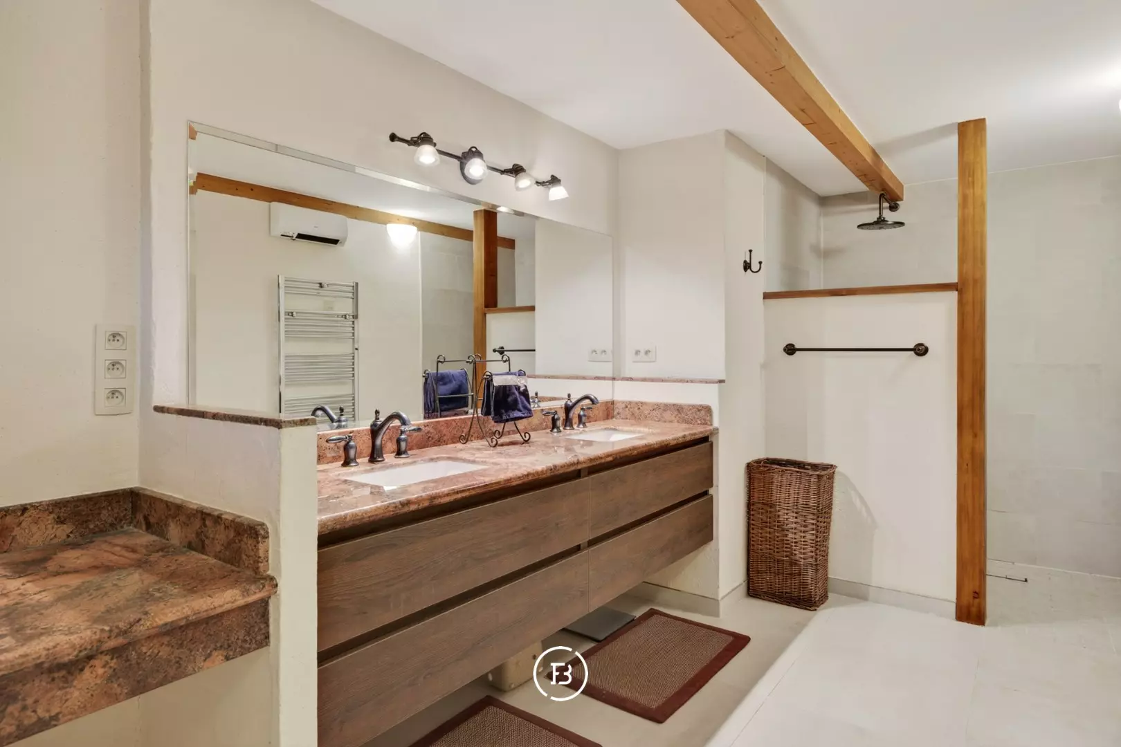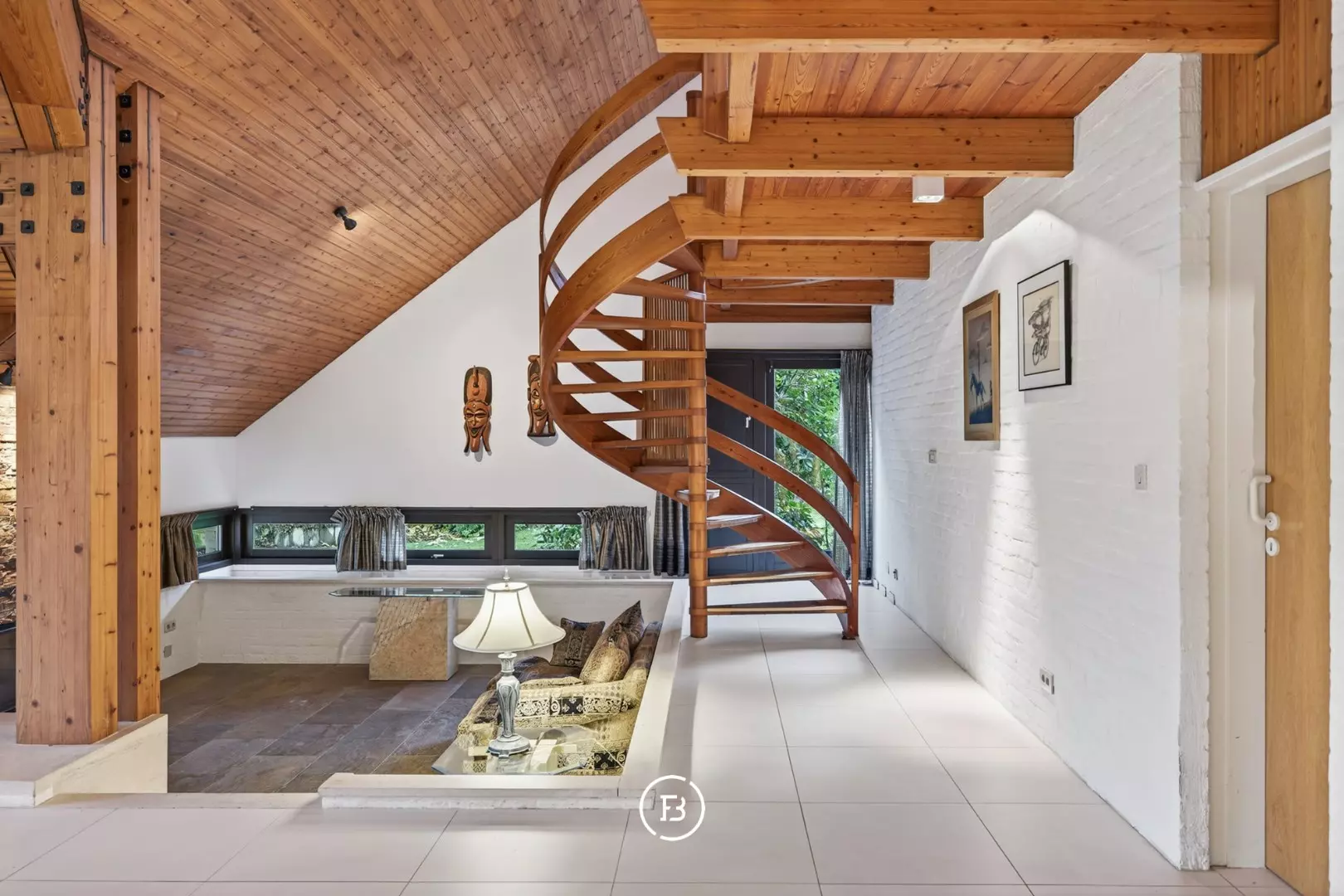Étage (+1) : mezzanine avec espace bureau, deux chambres avec salles de bains attenantes, chambre d’enfant et espace de rangement supplémentaire.